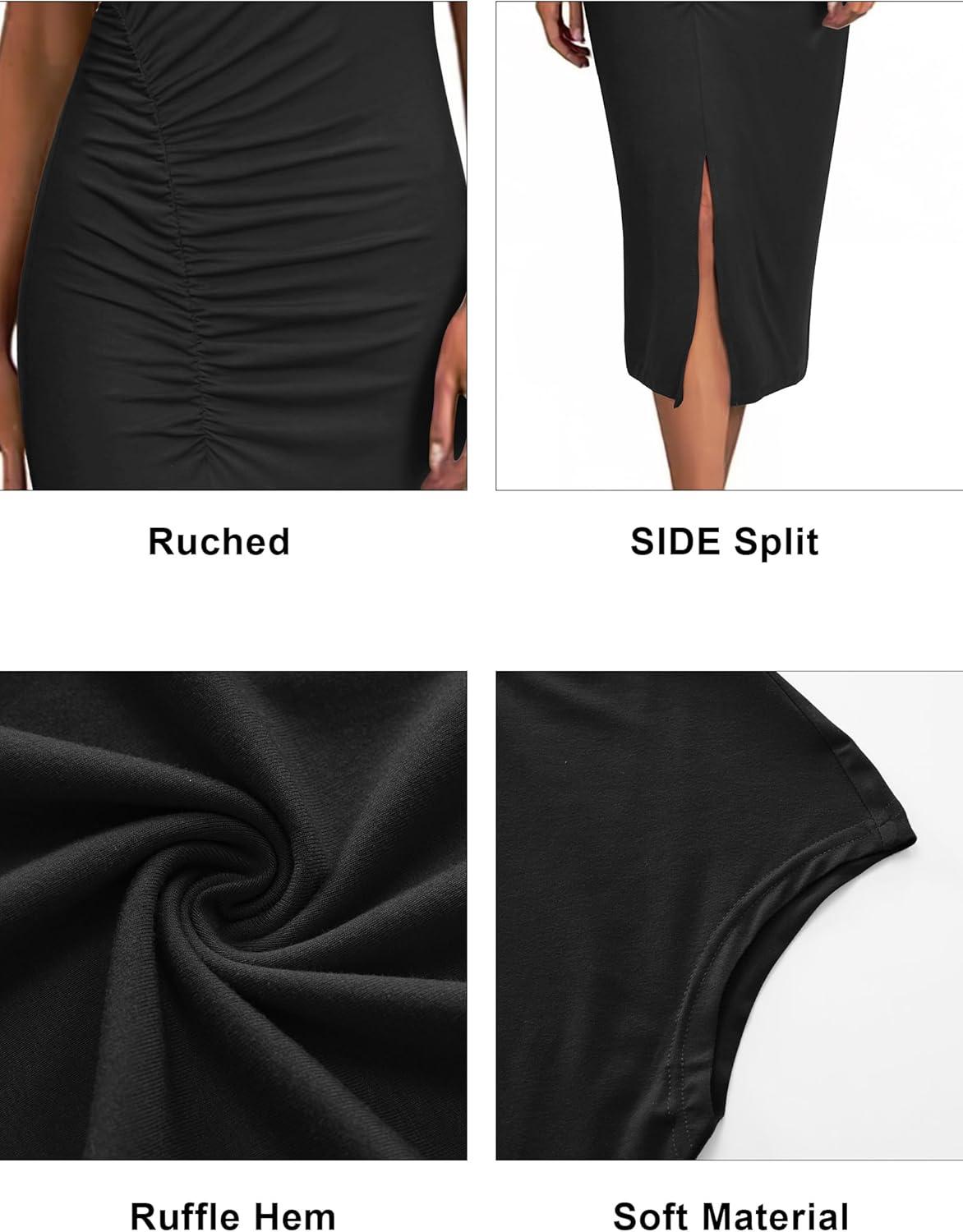 Newshows Women 2025 Summer Casual Bodycon Long Midi Ruched Side Slit Cap Sleeve Crew Neck Slim Fit Vacation Dress(Black)