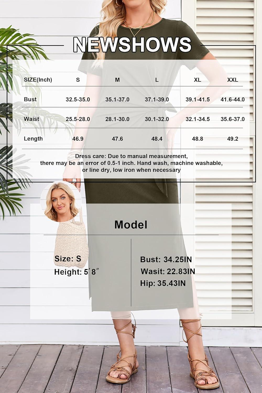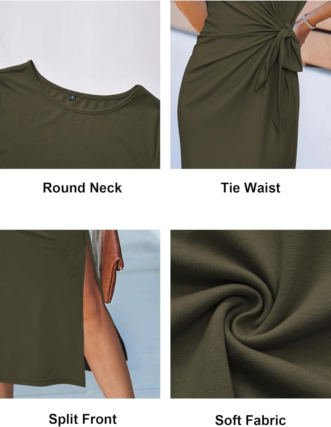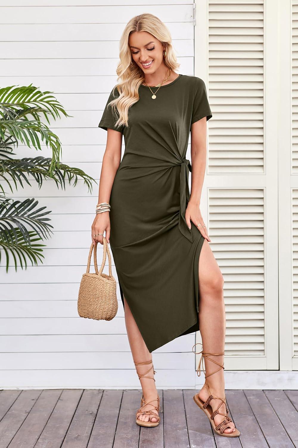 Newshows Women 2025 Summer Casual Dress Tie Waist T Shirt Short Sleeve Beach Crew Neck Slit Maxi Trendy(Army Green)
