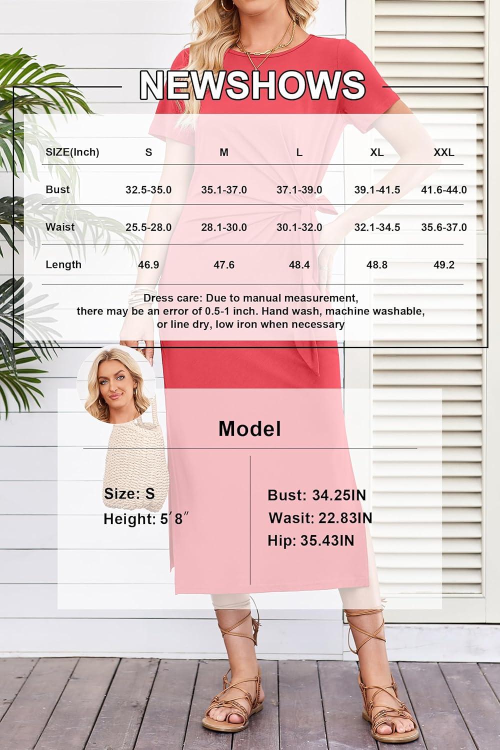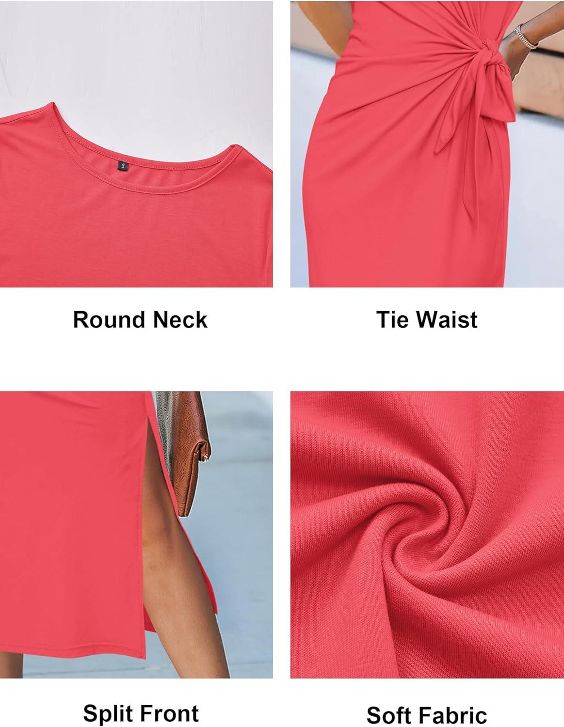 Newshows Women 2025 Summer Casual Dress Tie Waist T Shirt Short Sleeve Beach Crew Neck Slit Maxi Trendy(Brick Red Pink)