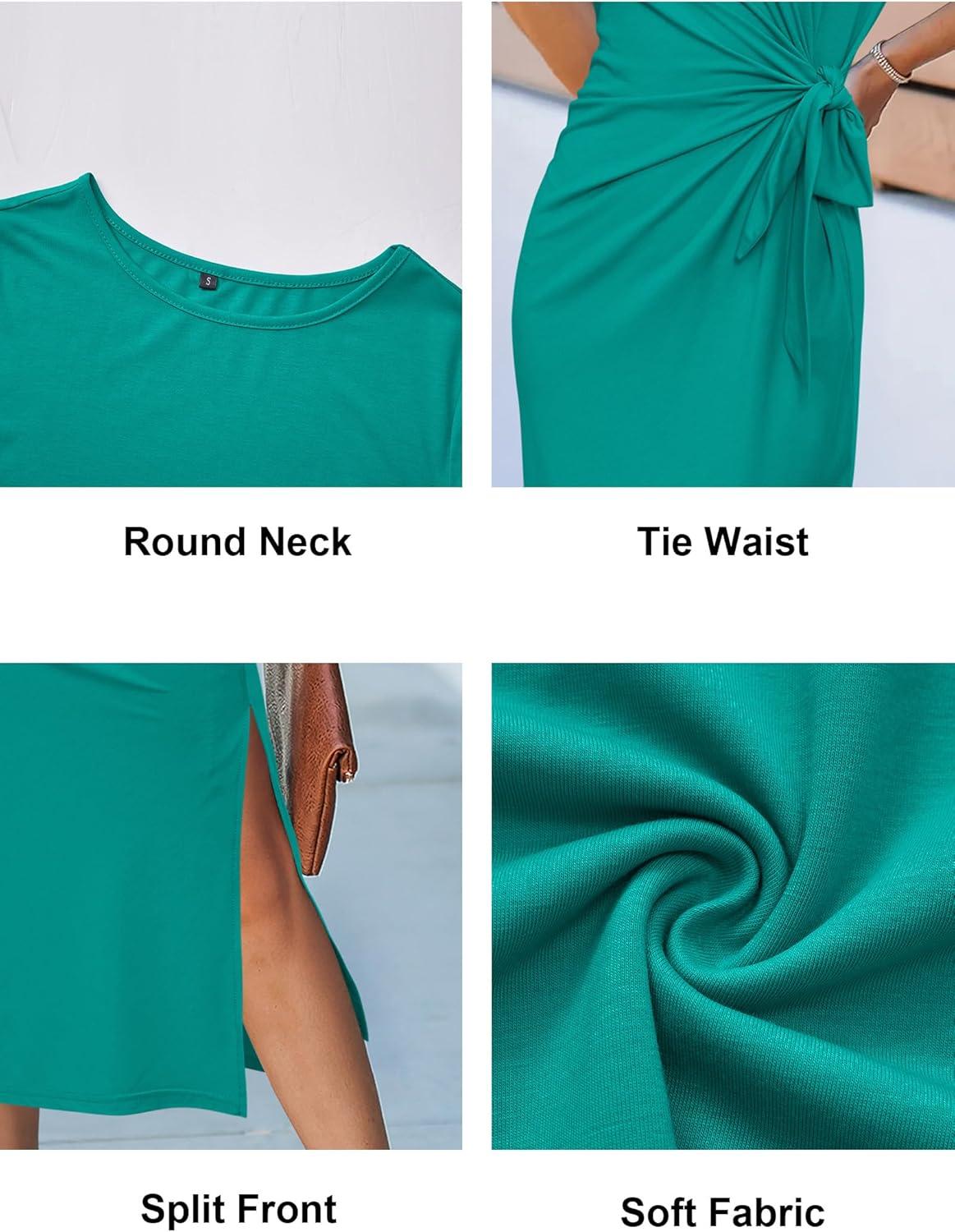 Newshows Women 2025 Summer Casual Dress Tie Waist T Shirt Short Sleeve Beach Crew Neck Slit Maxi Trendy(Bright Green)