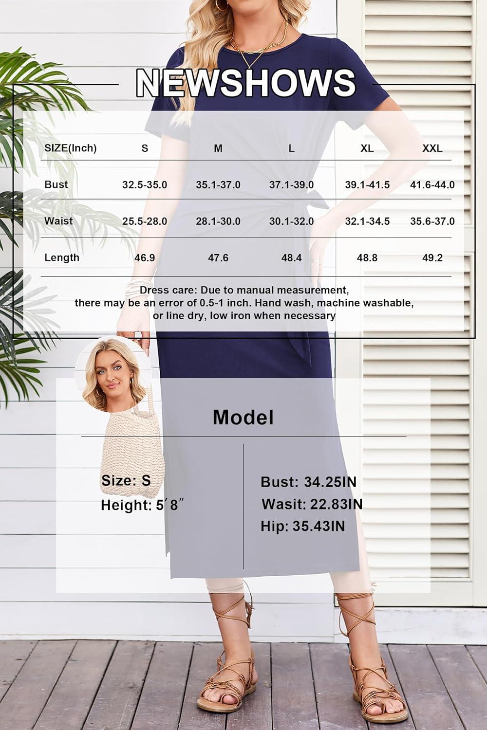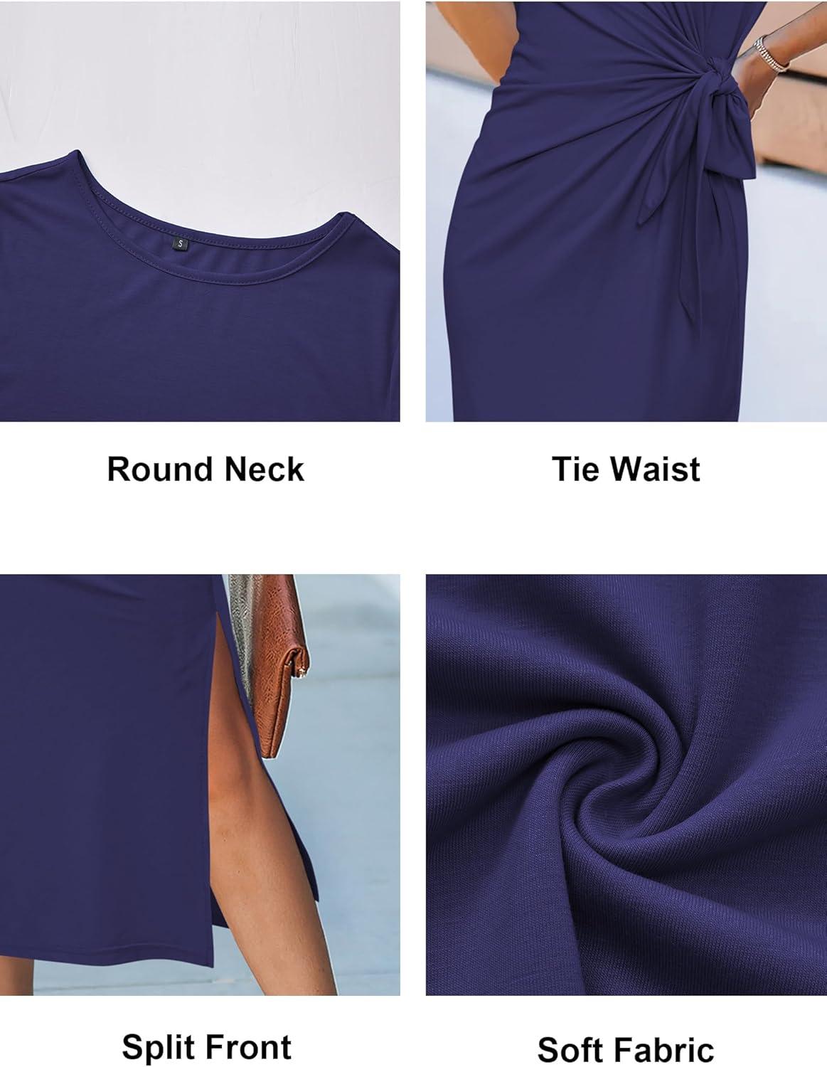 Newshows Women 2025 Summer Casual Dress Tie Waist T Shirt Short Sleeve Beach Crew Neck Slit Maxi Trendy(Navy Blue)