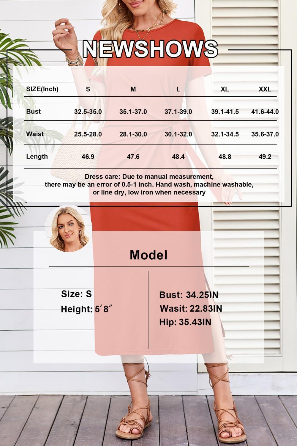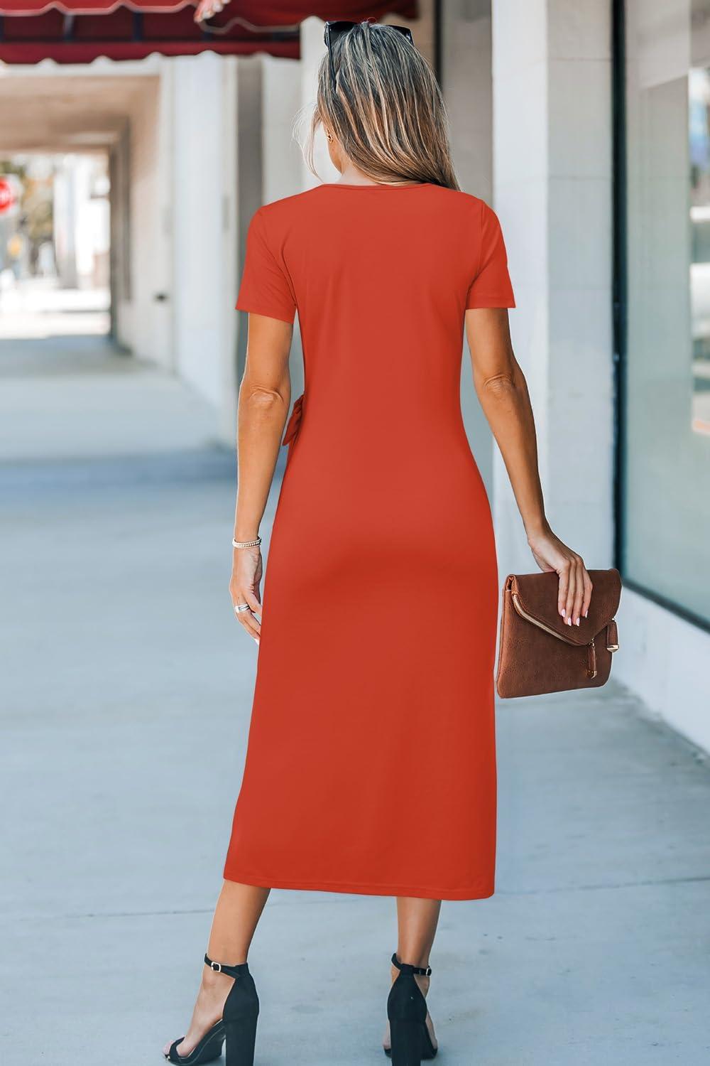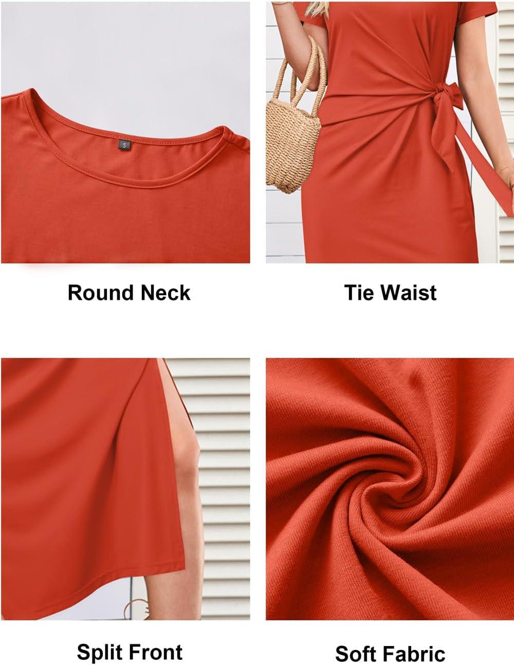Newshows Women 2025 Summer Casual Dress Tie Waist T Shirt Short Sleeve Beach Crew Neck Slit Maxi Trendy(Orange)