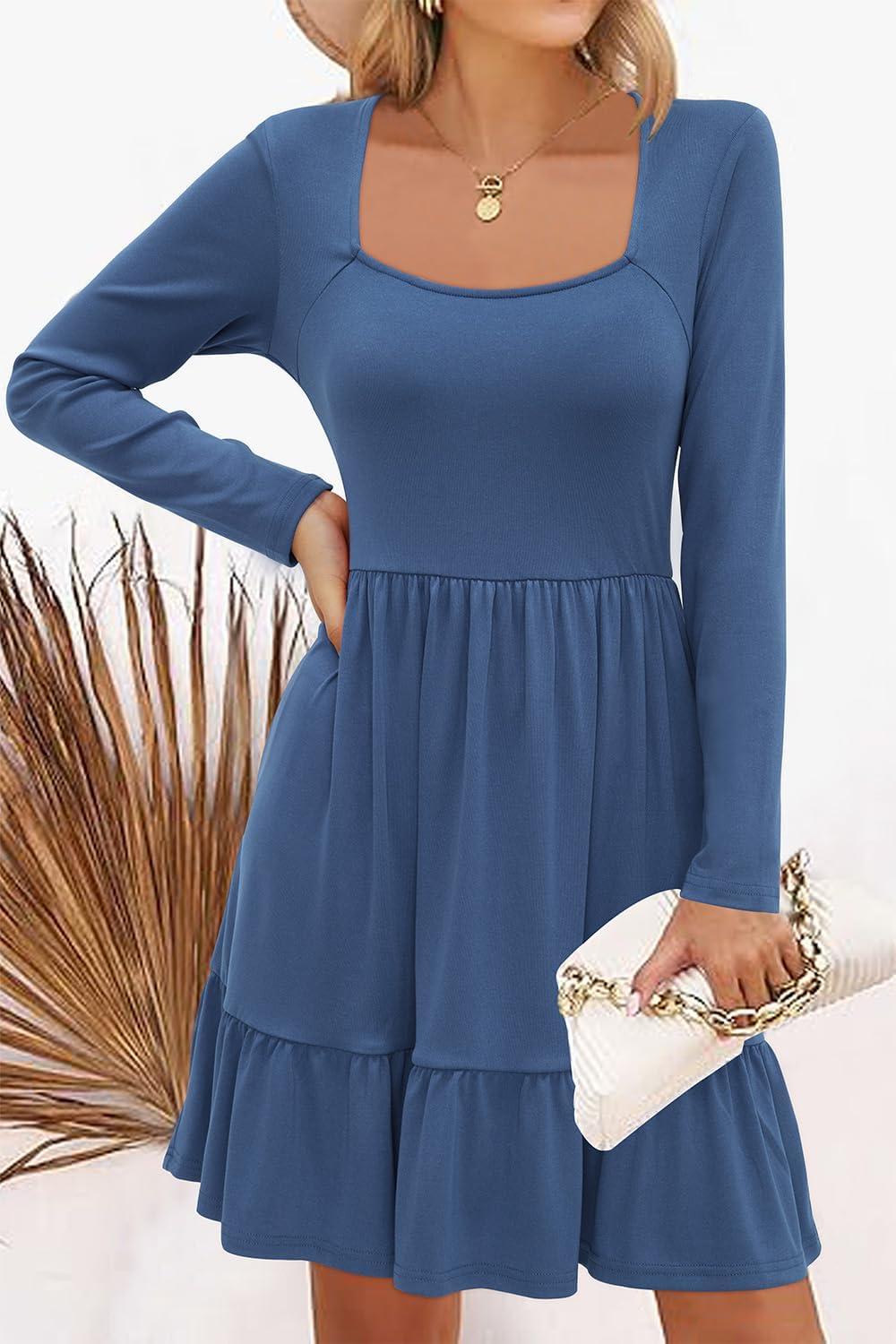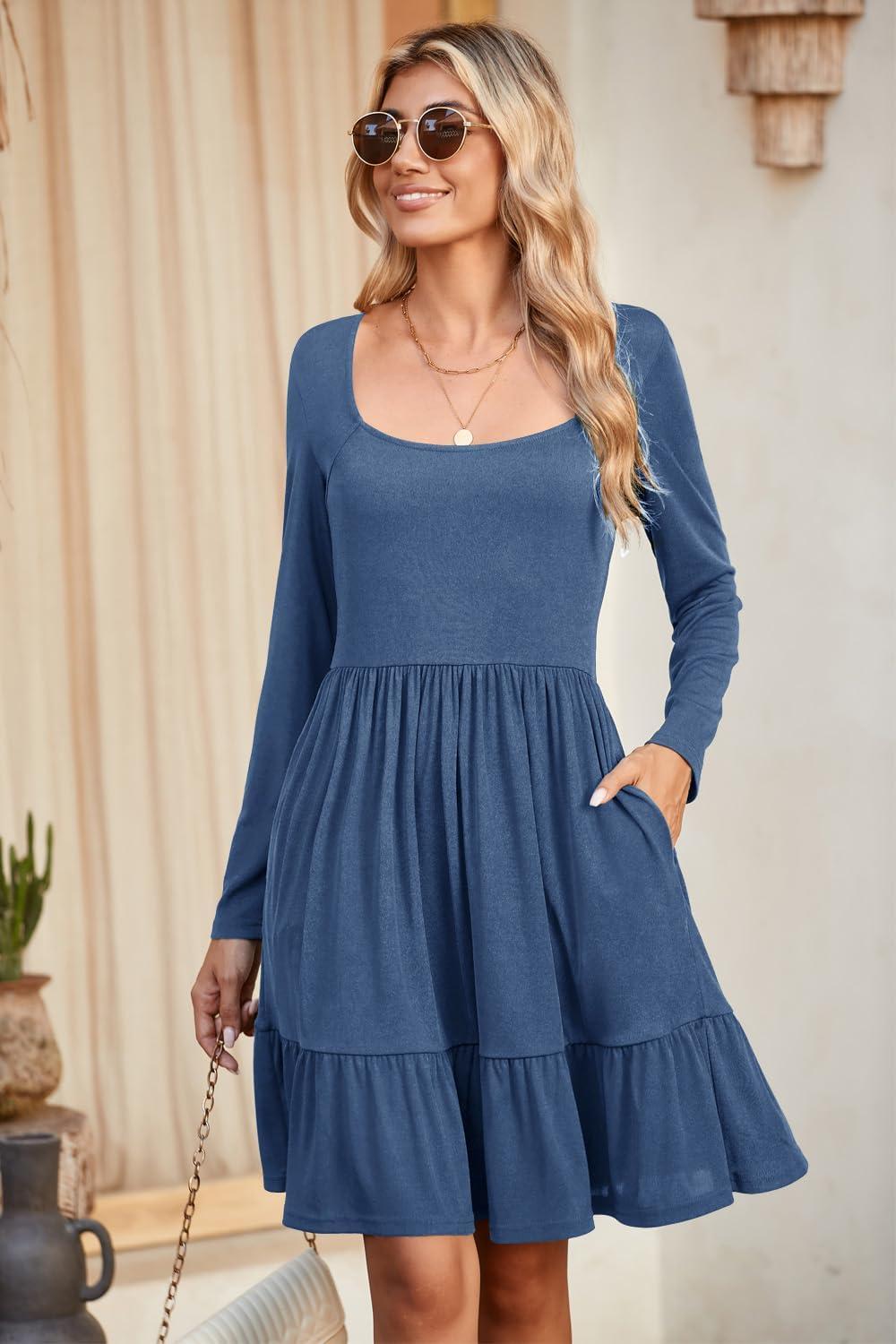 Newshows Women 2025 Summer Dress Square Neck Formal Short Sleeve Business Casual Outfits Ruffle Spring Pockets Sundress(0 Blue-4006)