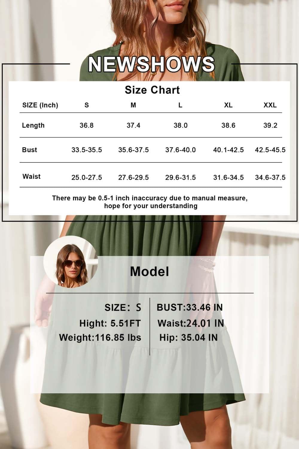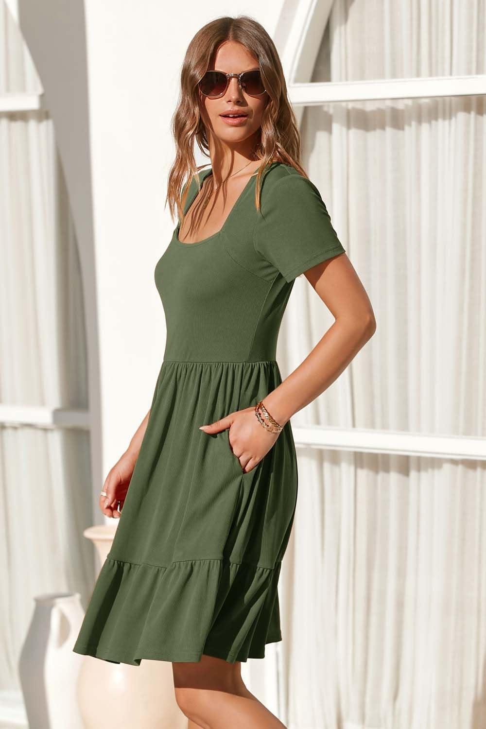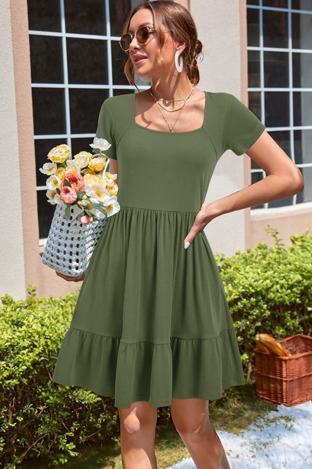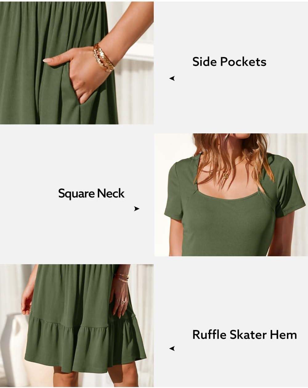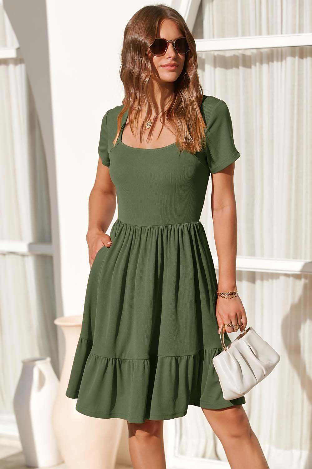Newshows Women 2025 Summer Dress Square Neck Formal Short Sleeve Business Casual Outfits Ruffle Spring Pockets Sundress(Army Green)