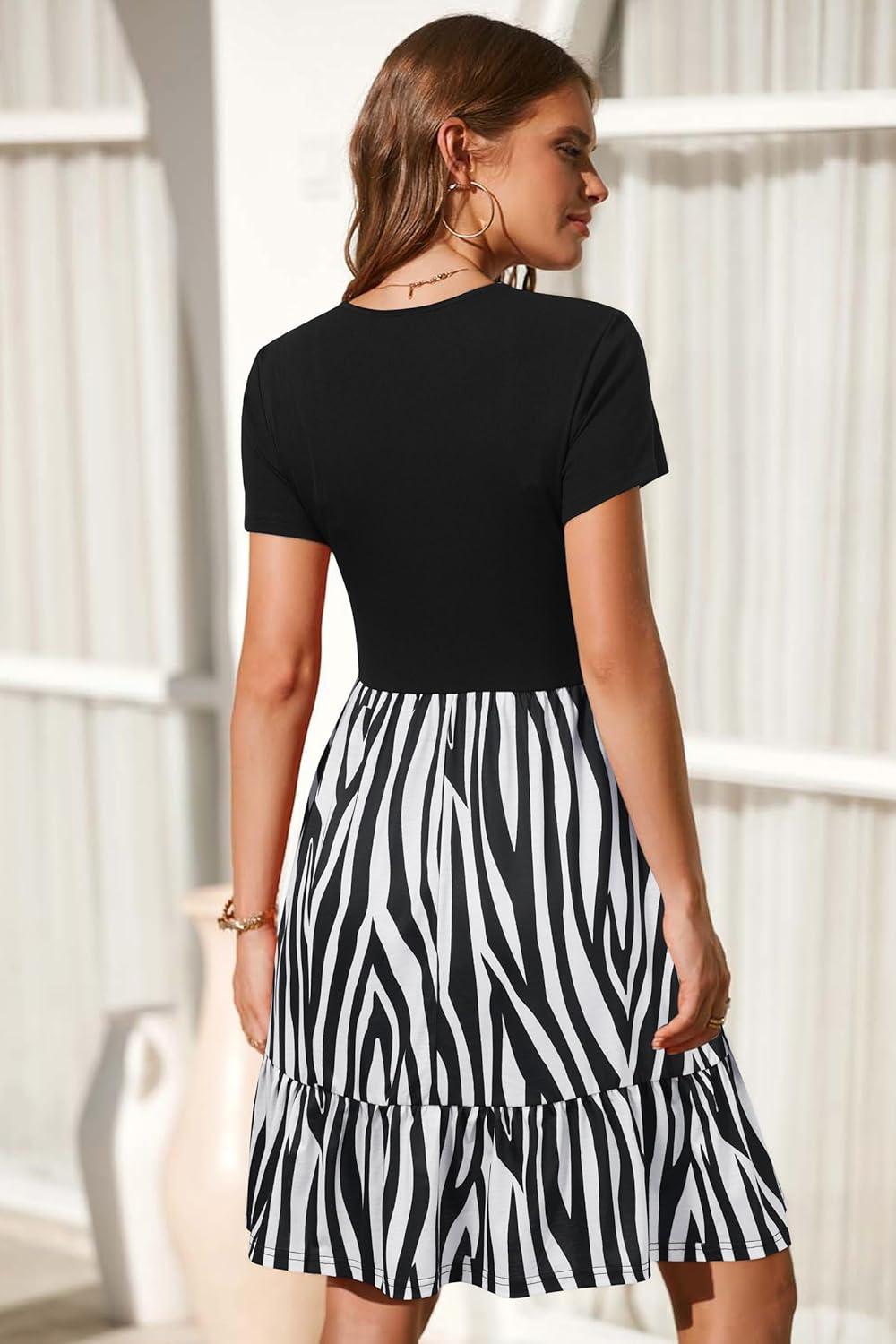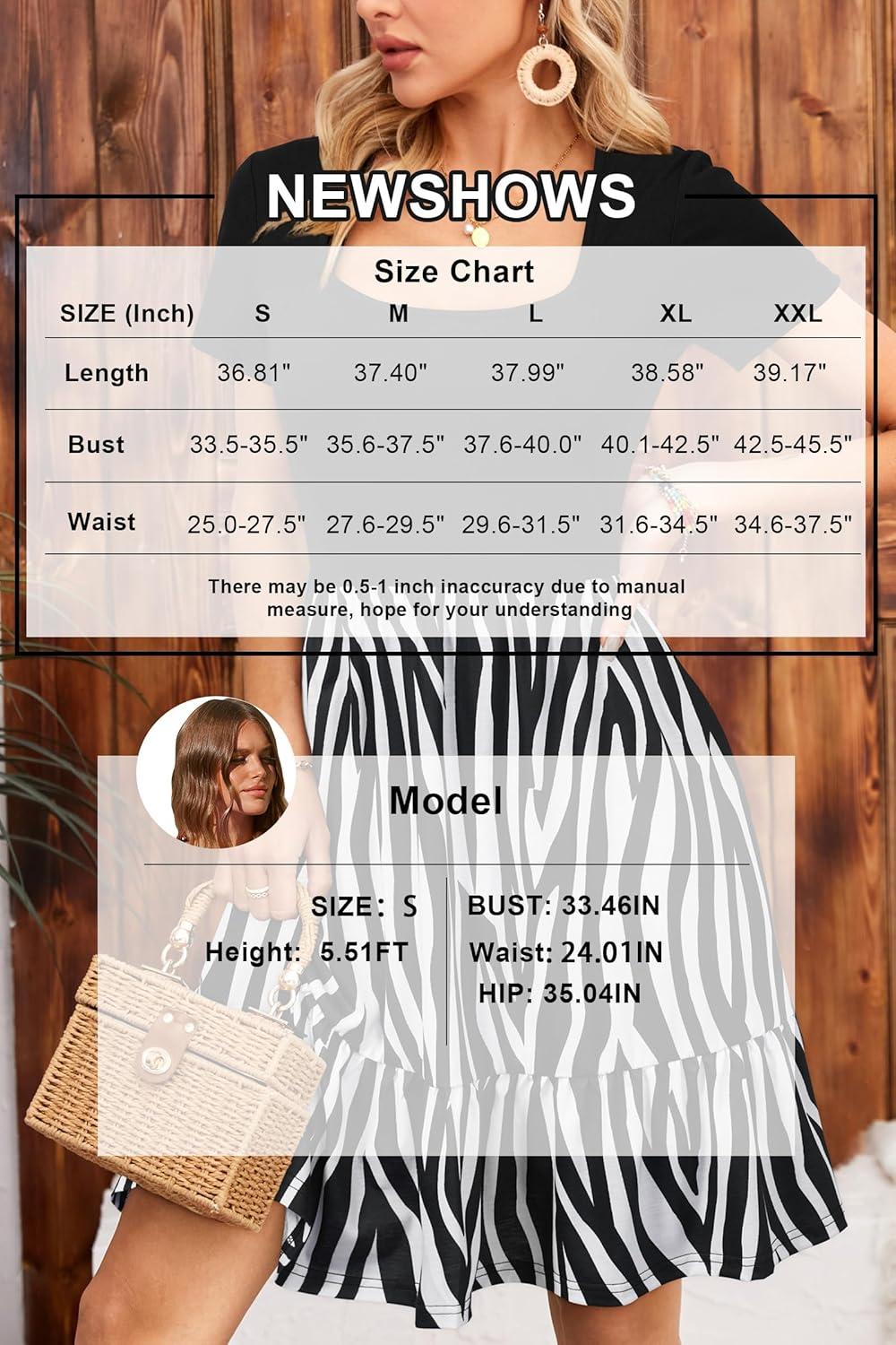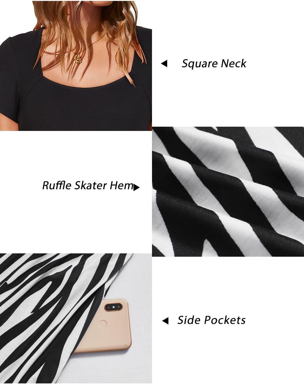 Newshows Women 2025 Summer Dress Square Neck Formal Short Sleeve Business Casual Outfits Ruffle Spring Pockets Sundress(Black White Zebra Striped)