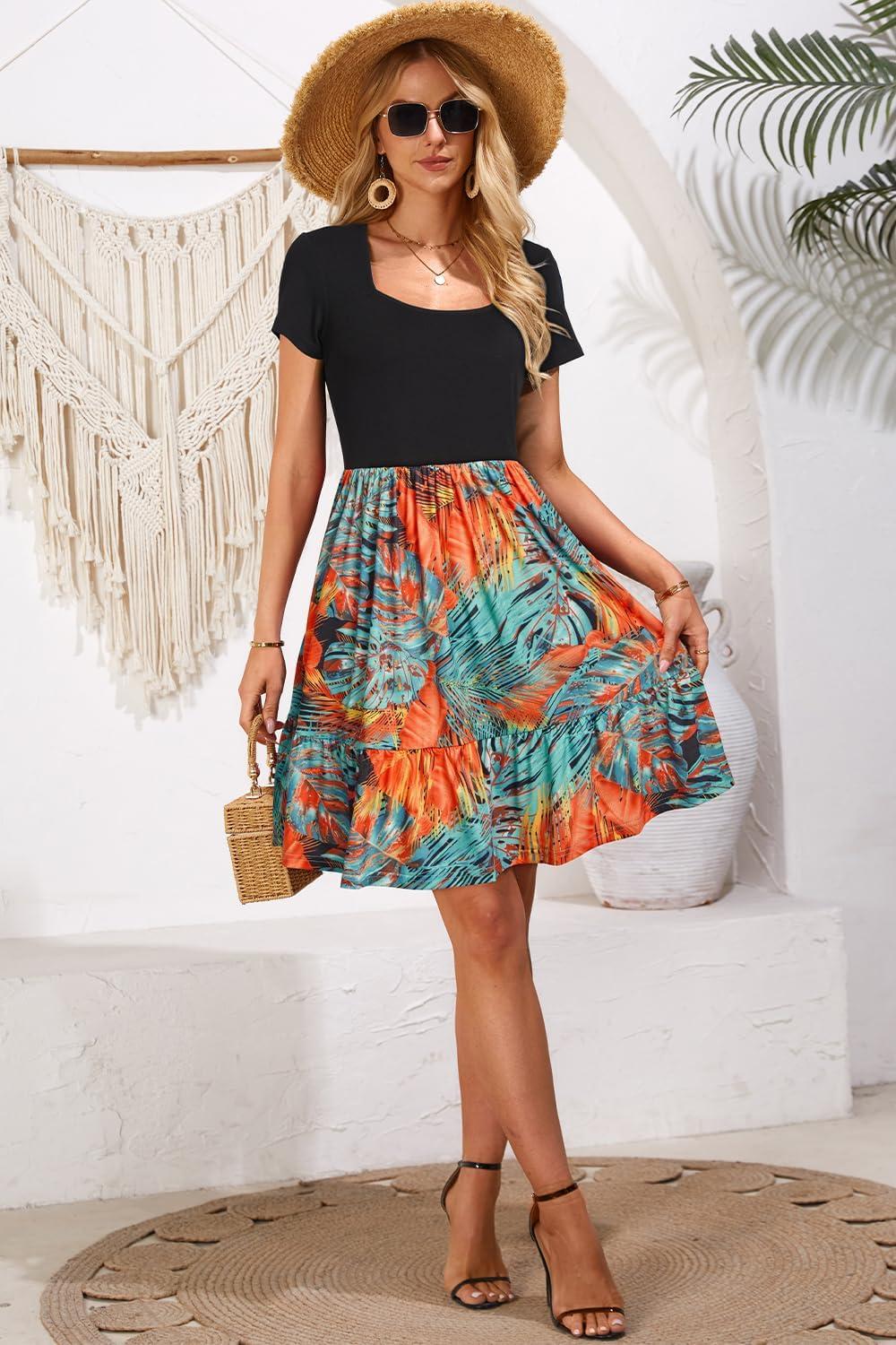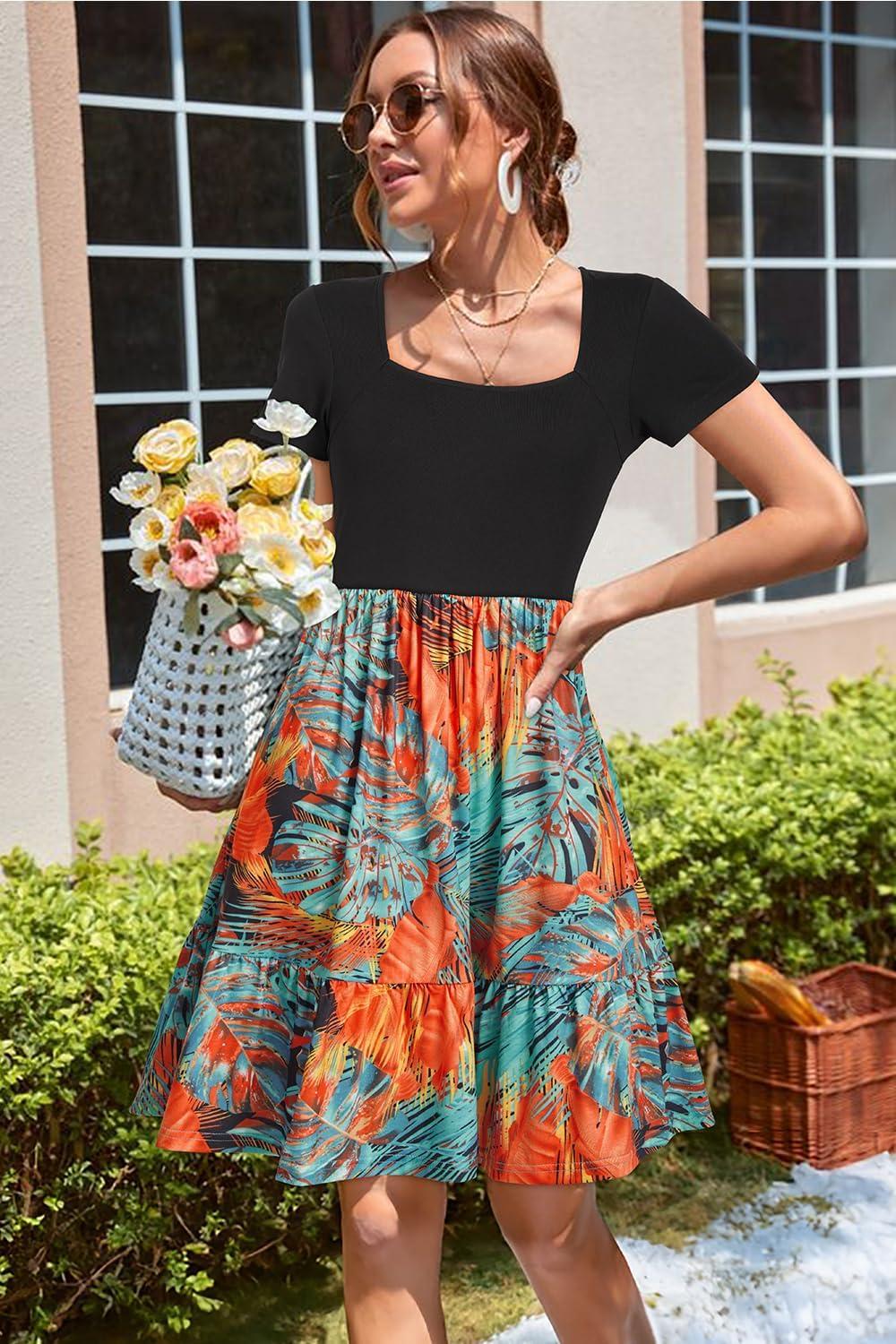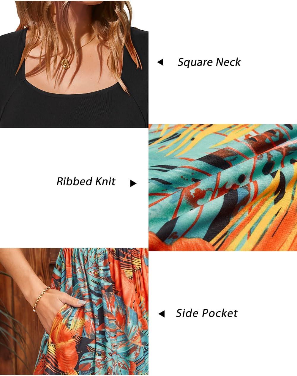 Newshows Women 2025 Summer Dress Square Neck Formal Short Sleeve Business Casual Outfits Ruffle Spring Pockets Sundress(Blue Floral Leaf Red)