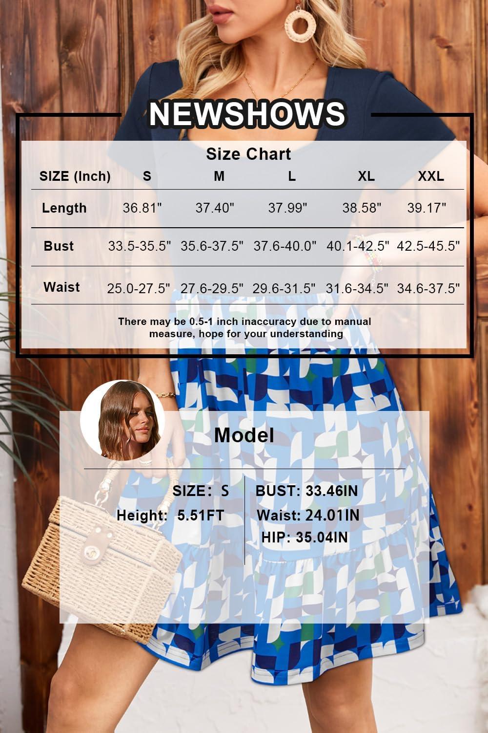 Newshows Women 2025 Summer Dress Square Neck Formal Short Sleeve Business Casual Outfits Ruffle Spring Pockets Sundress(Blue Green Geometric Floral)