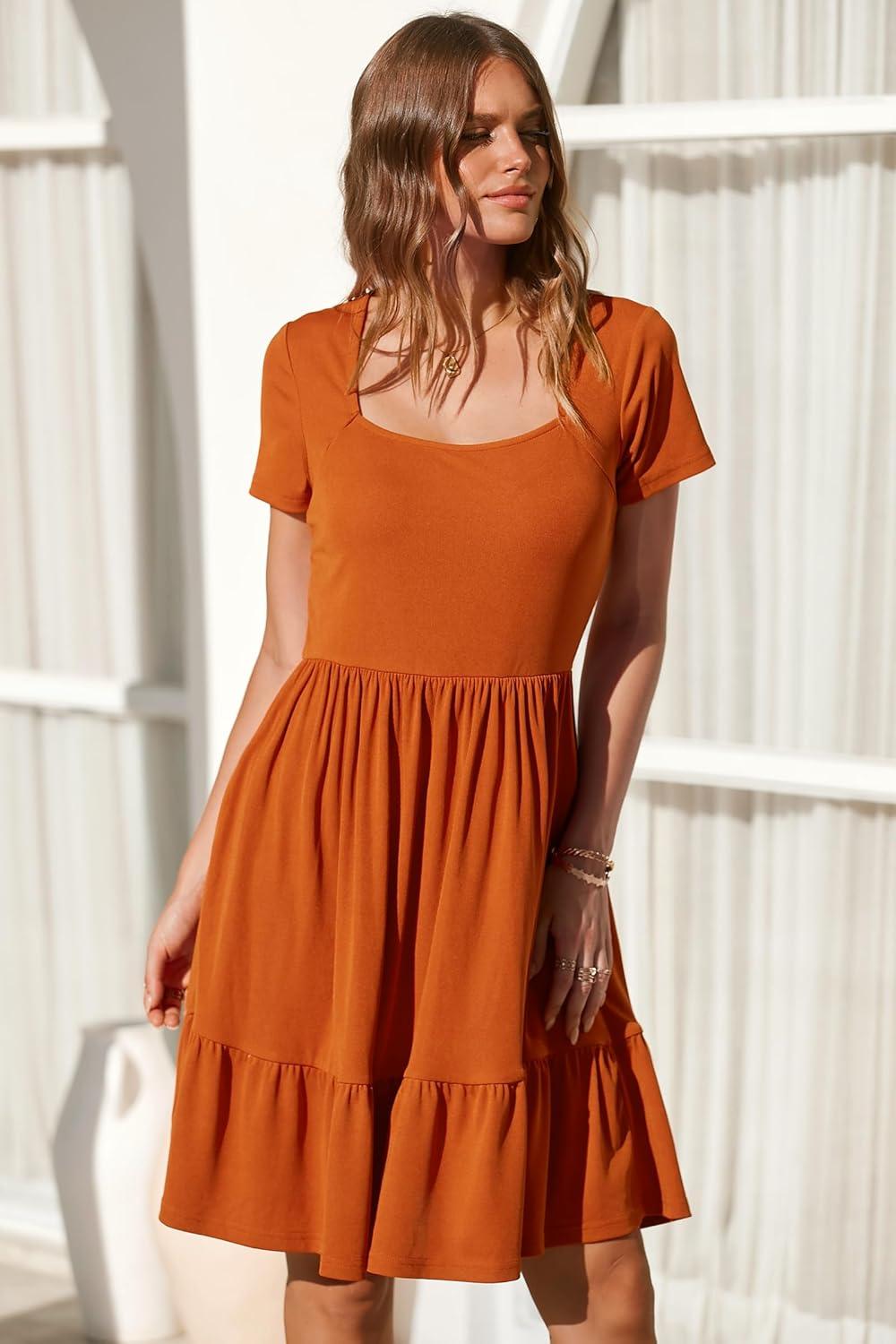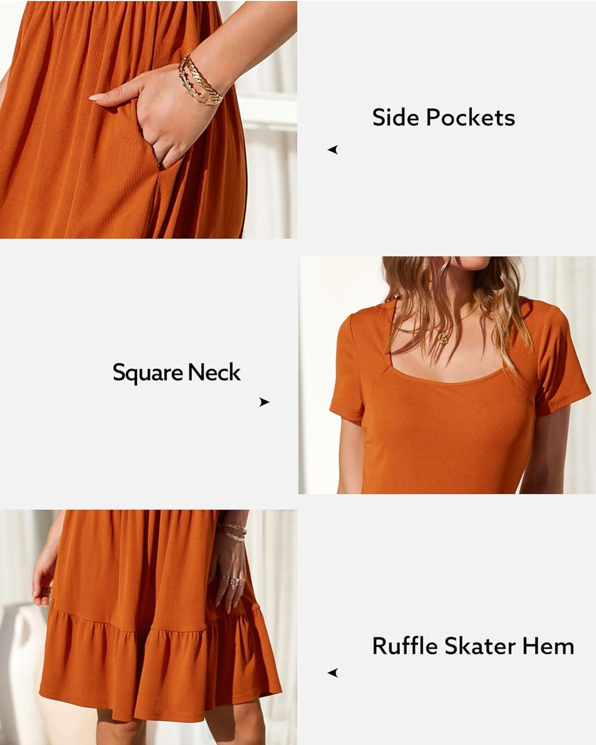 Newshows Women 2025 Summer Dress Square Neck Formal Short Sleeve Business Casual Outfits Ruffle Spring Pockets Sundress(Caramel Orange)