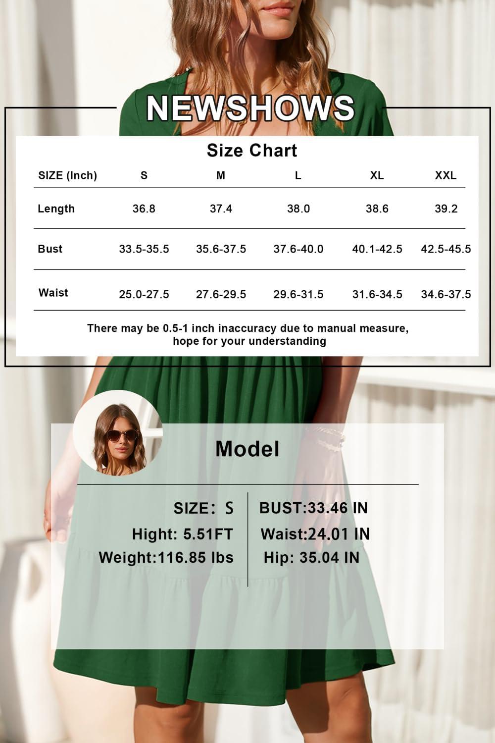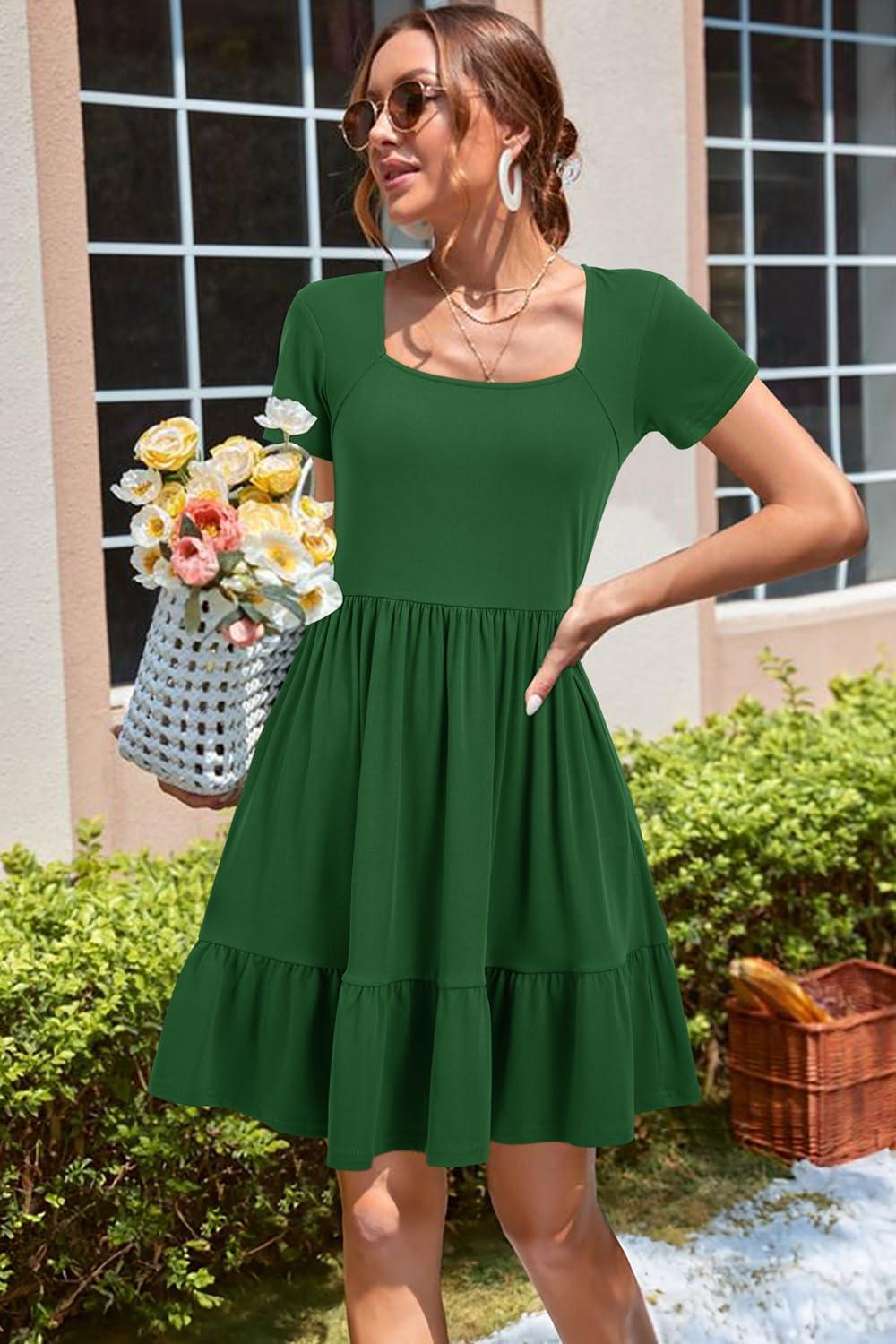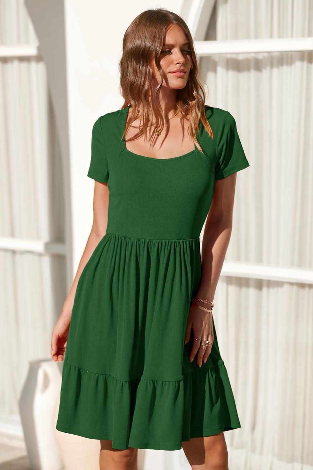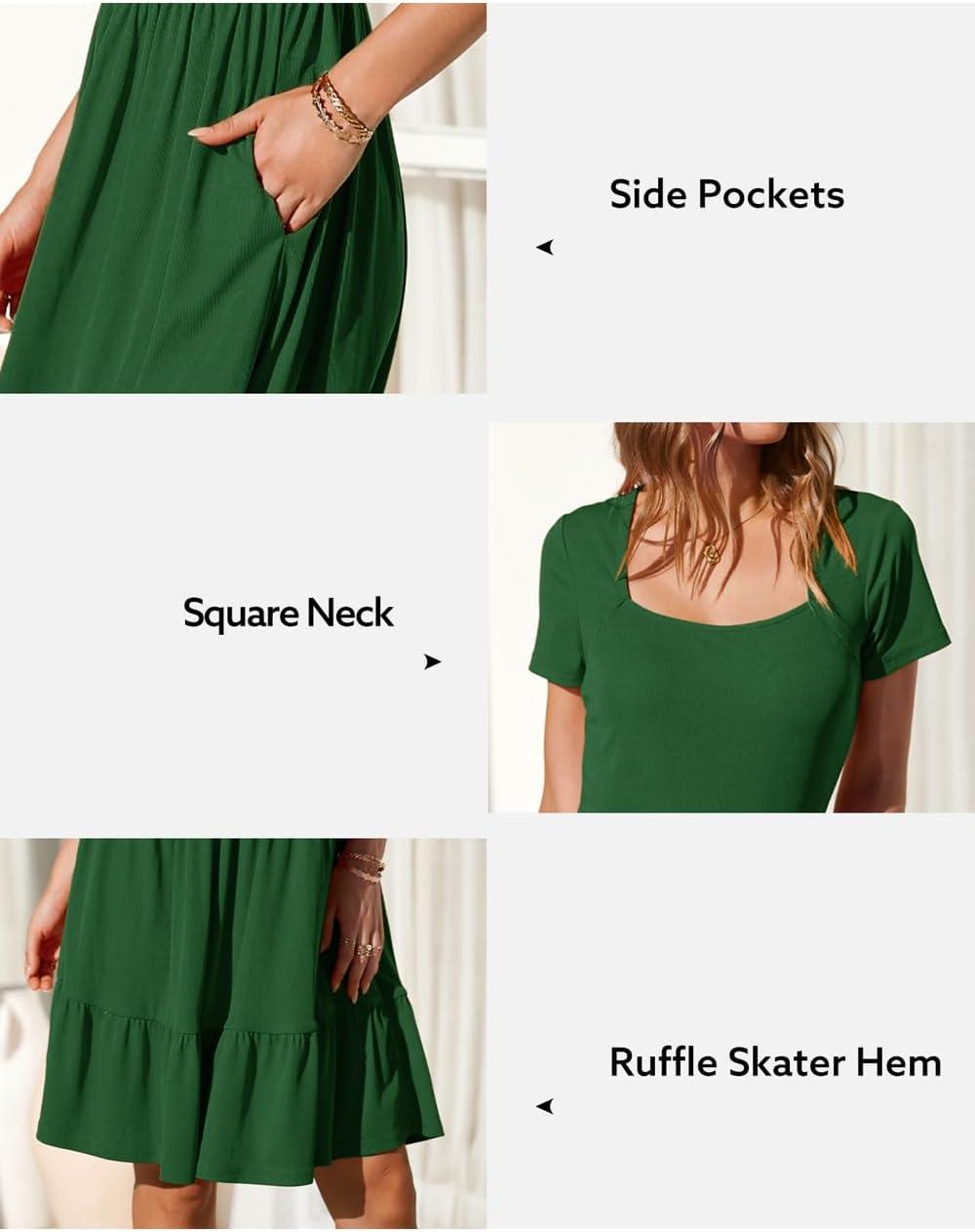 Newshows Women 2025 Summer Dress Square Neck Formal Short Sleeve Business Casual Outfits Ruffle Spring Pockets Sundress(Forest Green)