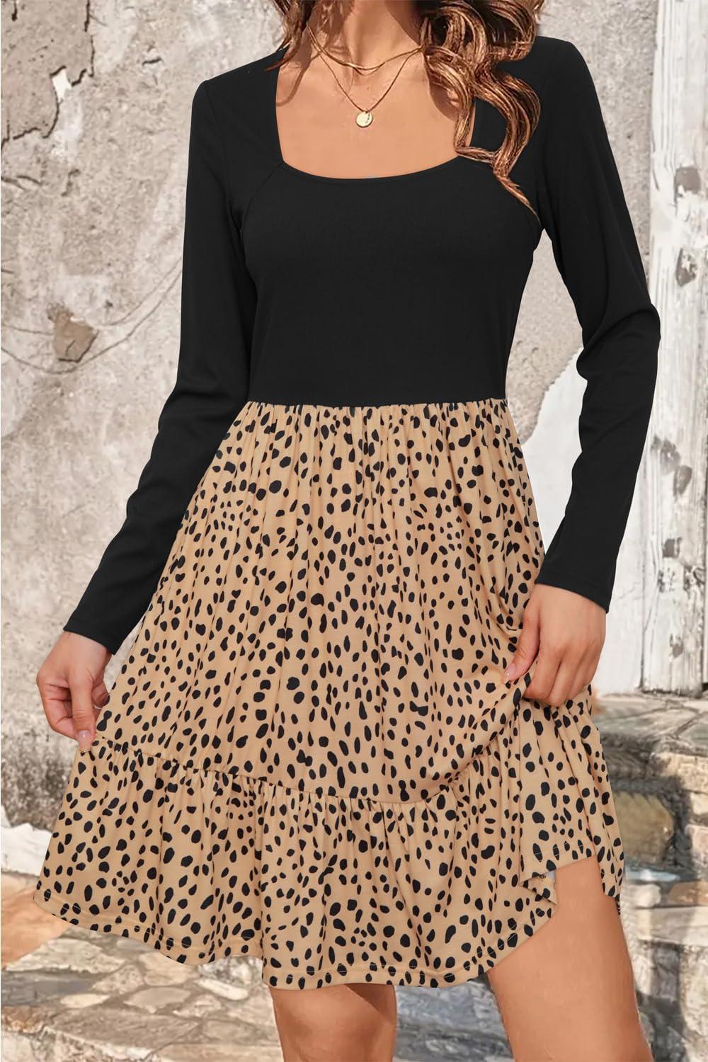 Newshows Women 2025 Summer Dress Square Neck Formal Short Sleeve Business Casual Outfits Ruffle Spring Pockets Sundress(Leopard Brown Floral-4085)