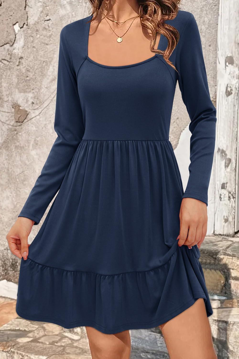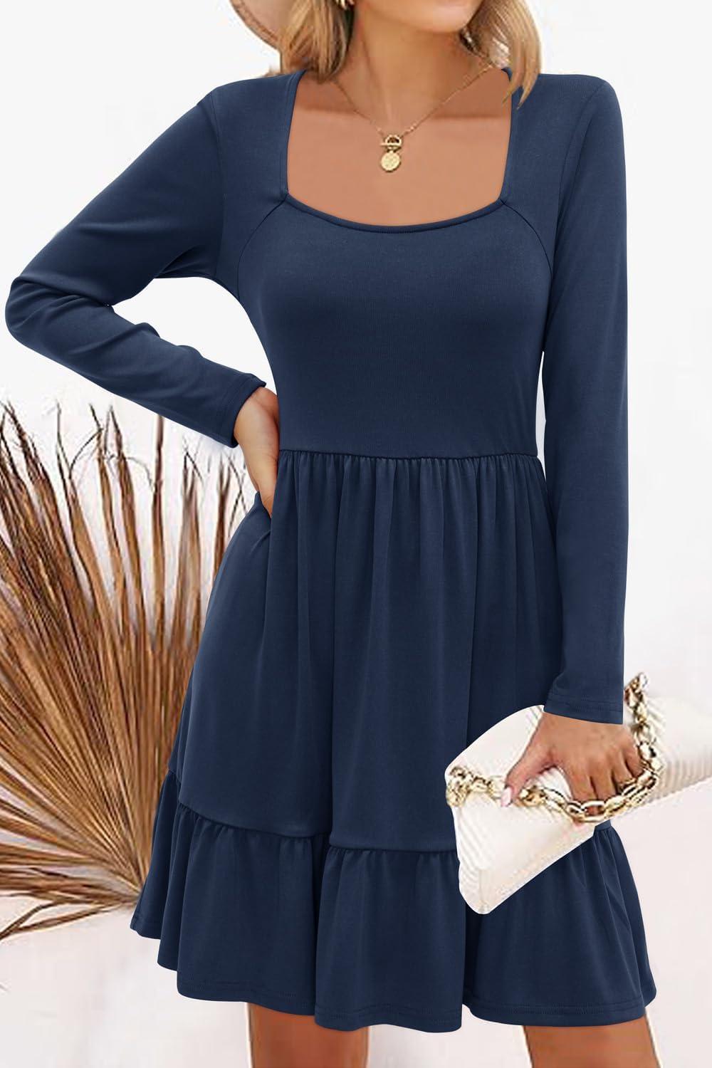 Newshows Women 2025 Summer Dress Square Neck Formal Short Sleeve Business Casual Outfits Ruffle Spring Pockets Sundress(Navyblue-4006)