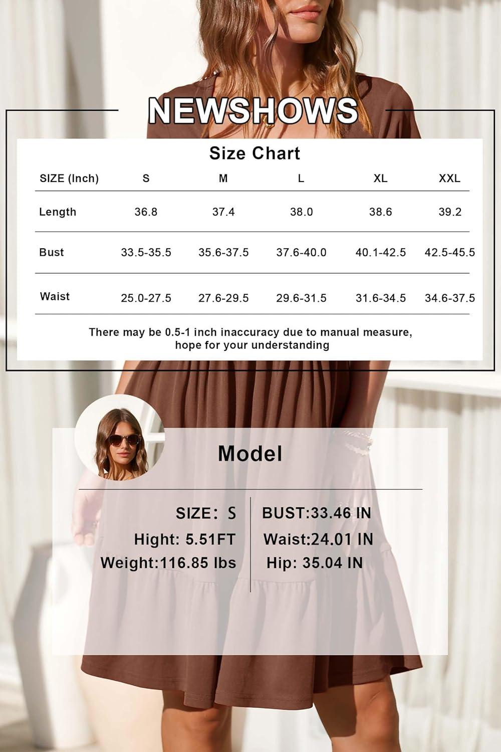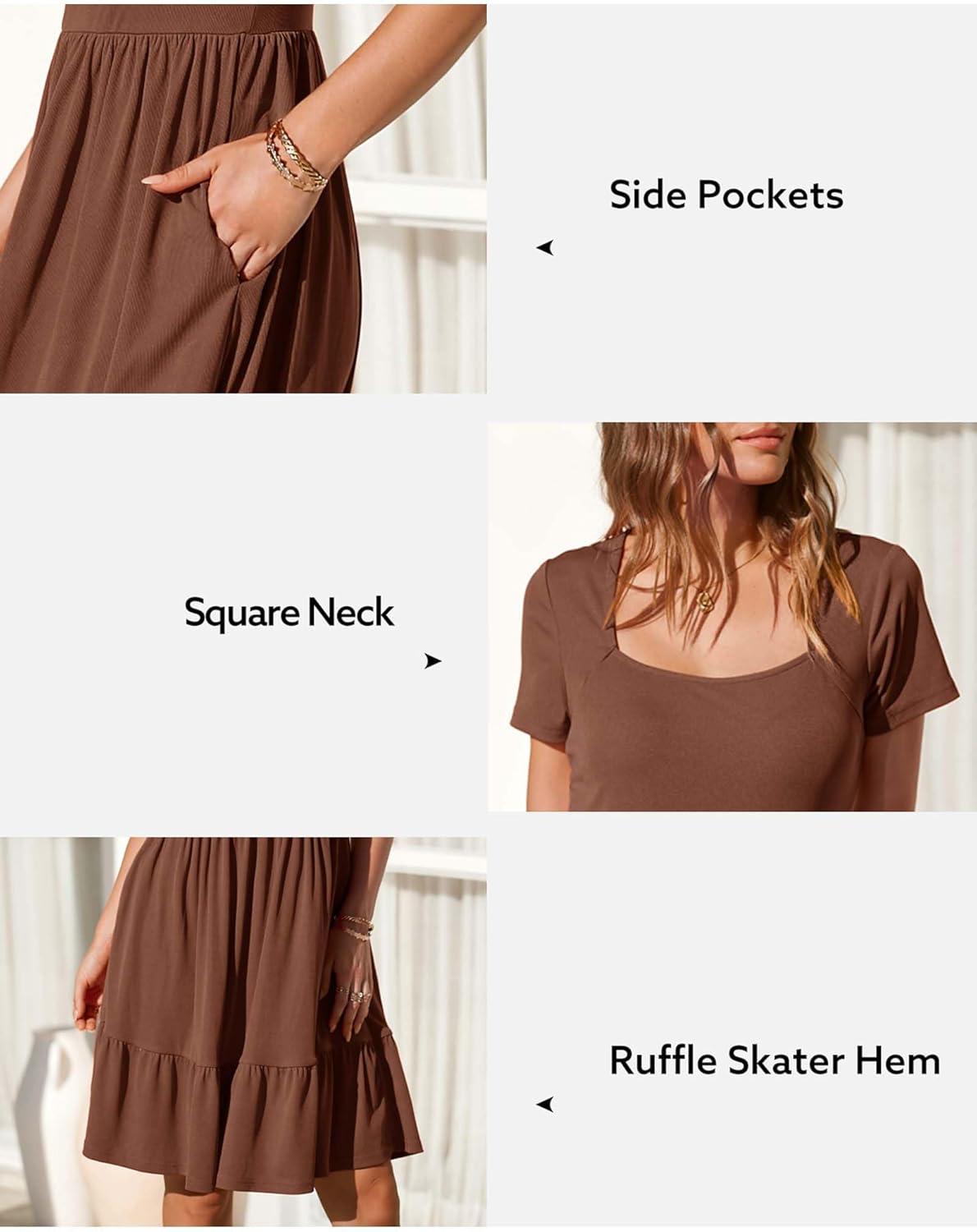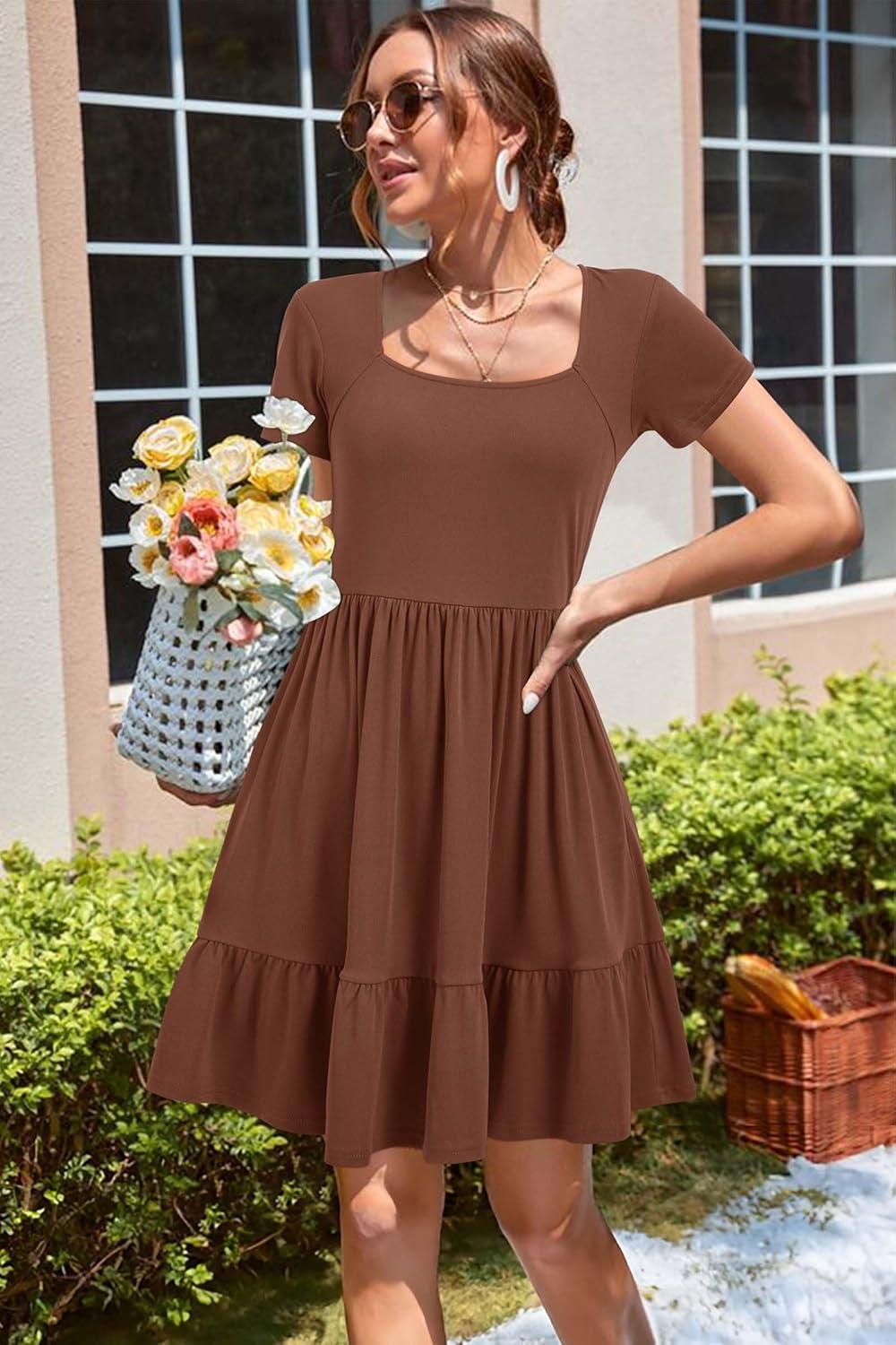 Newshows Women 2025 Summer Dress Square Neck Formal Short Sleeve Business Casual Outfits Ruffle Spring Pockets Sundress(Red Brown)