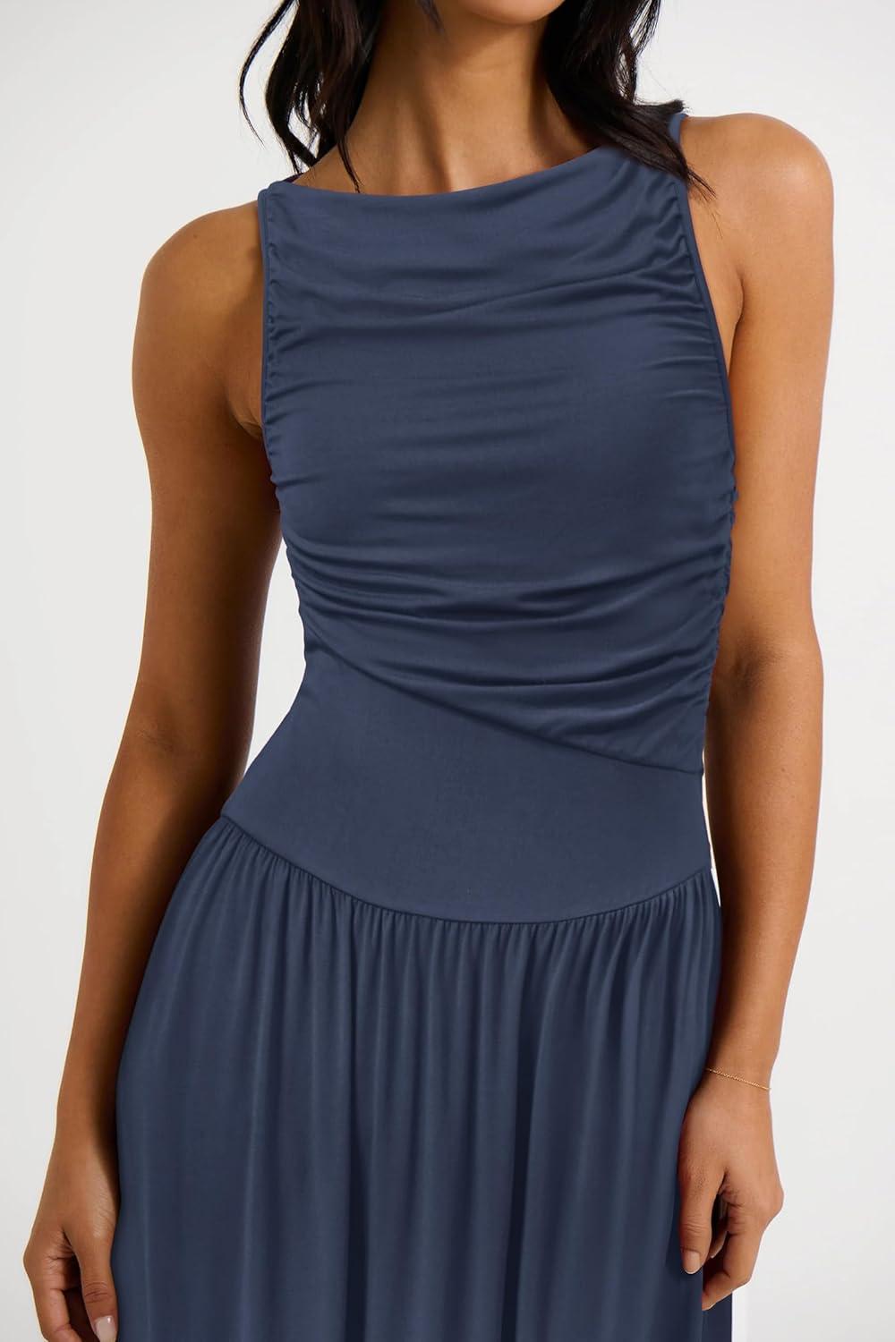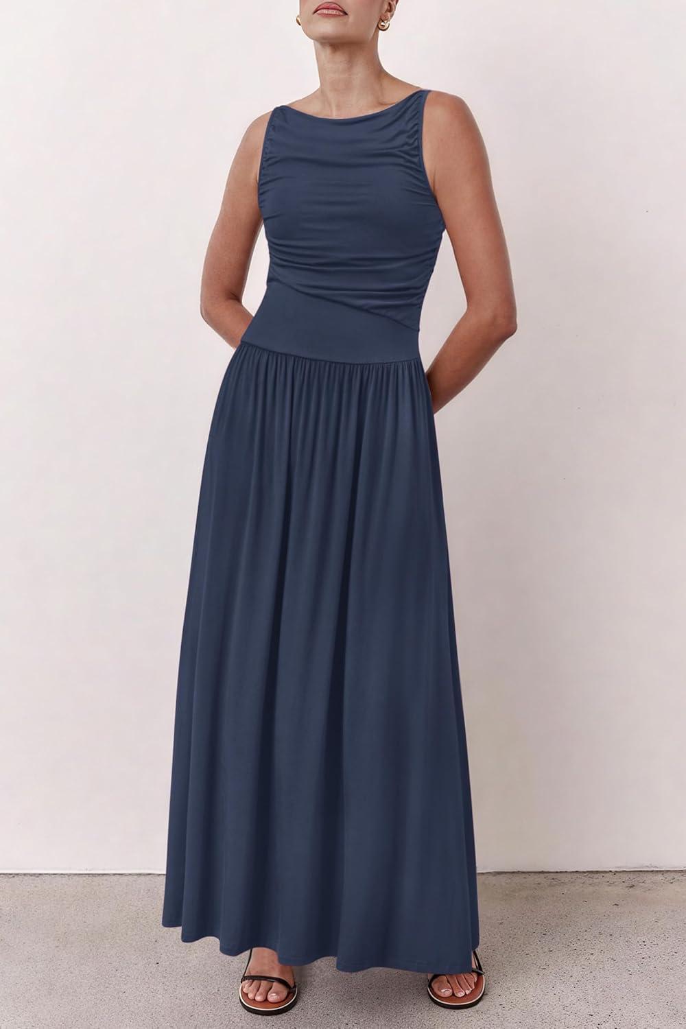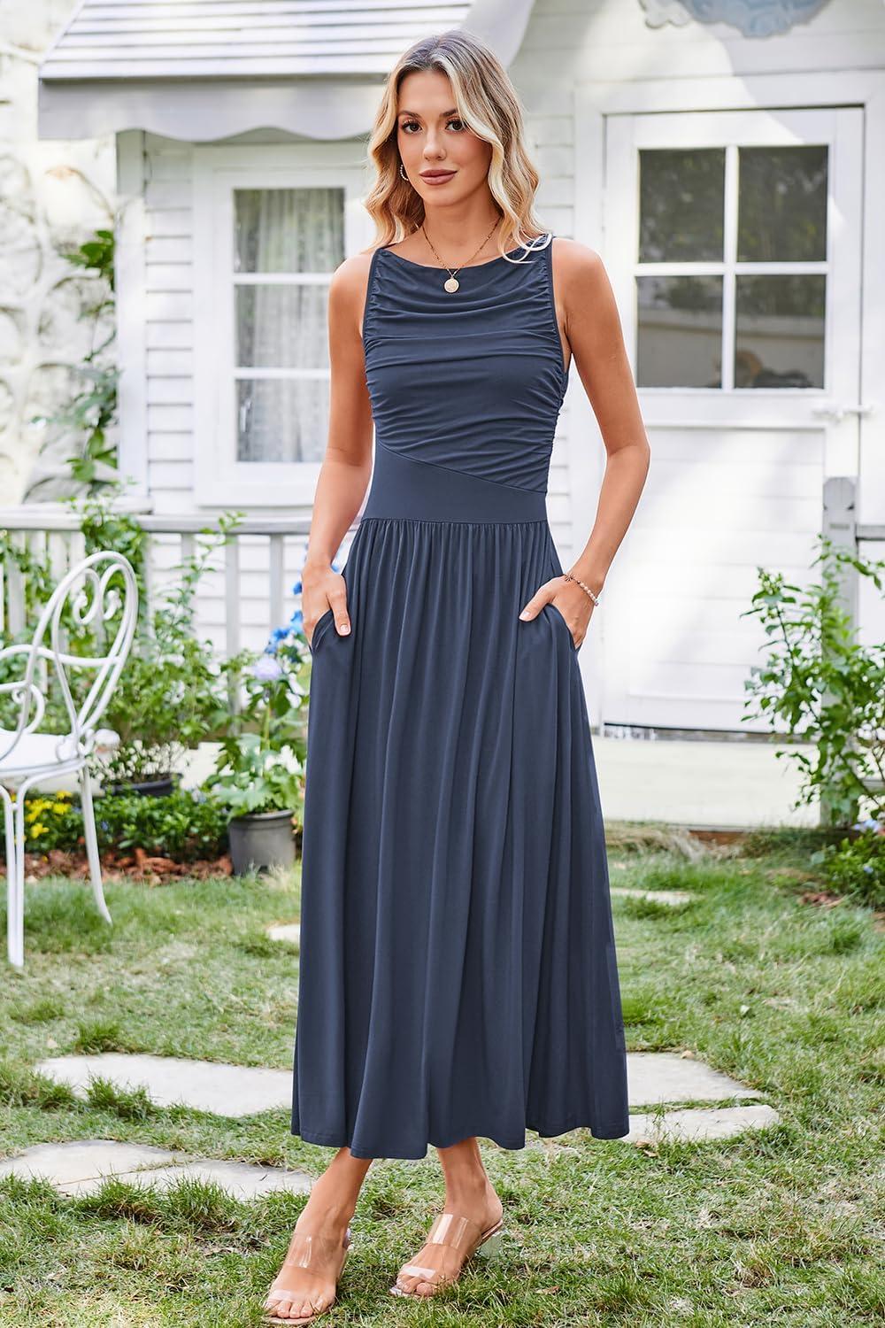 Newshows Women 2025 Summer Maxi Dresses Vacation Ruched Boat Neck Tank Flowy Elegant Party Long Formal Dress Pockets(Gray Blue)