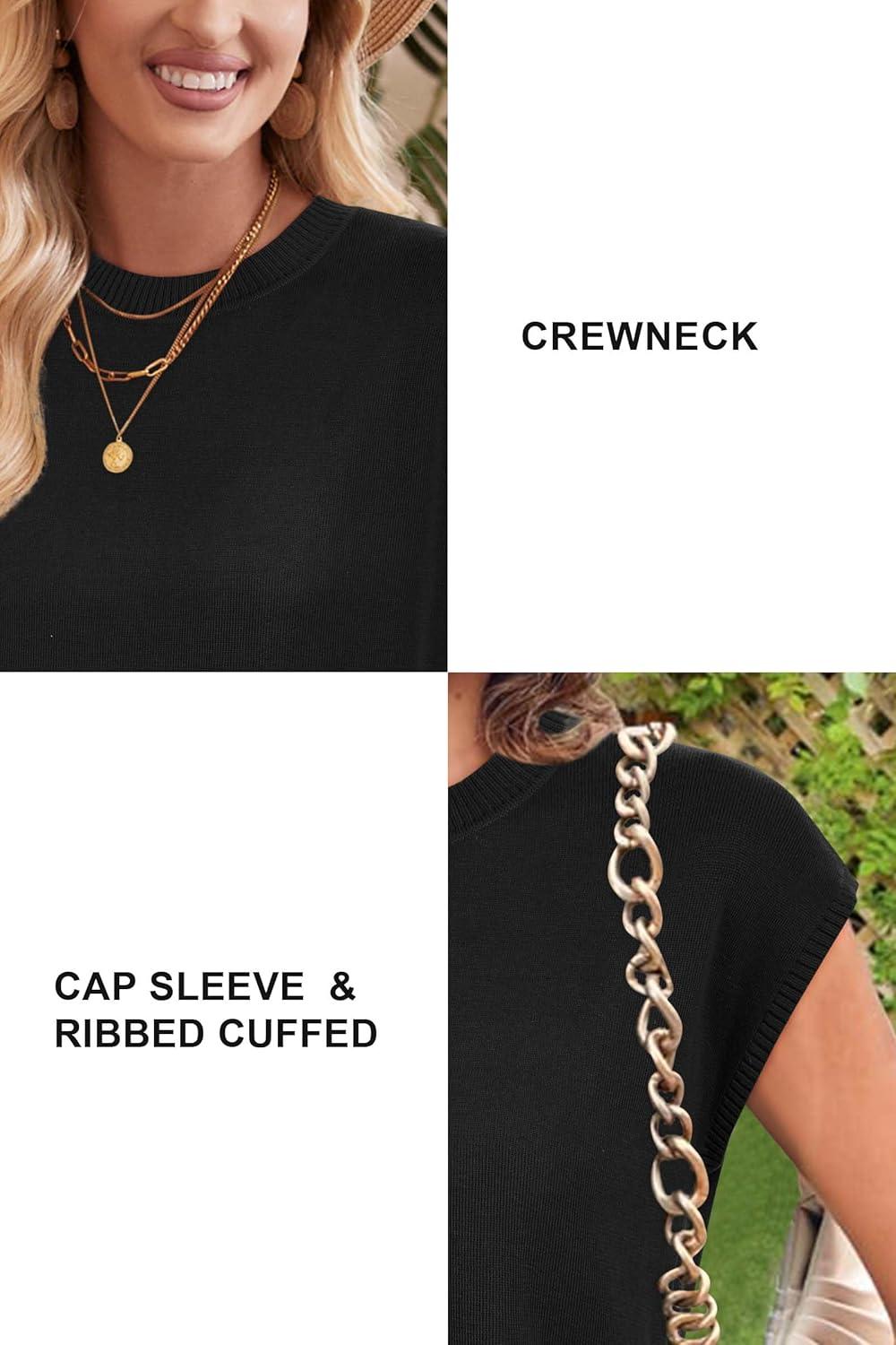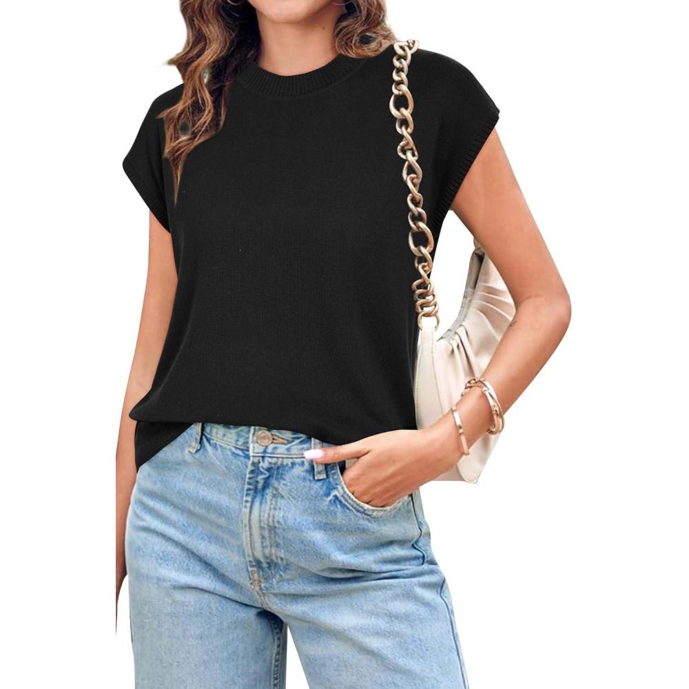 Newshows Womens 2024 Summer Tops Spring Sweater Vest Cap Sleeve Crewneck Business Casual Outfits Knit Dressy Shirts Trendy(Black)