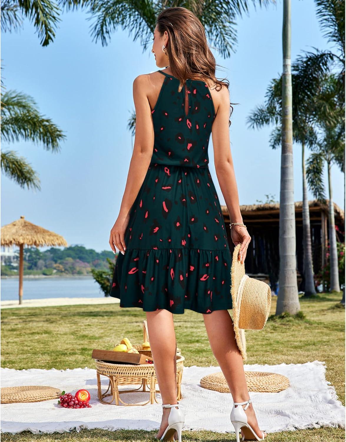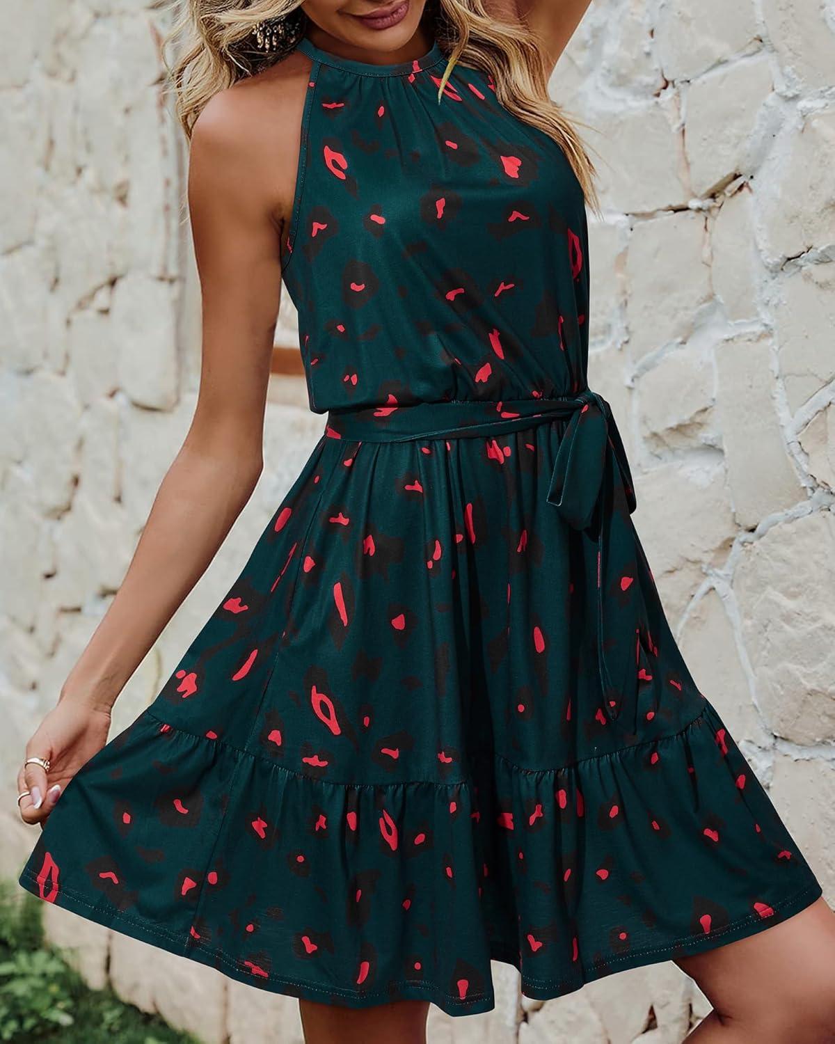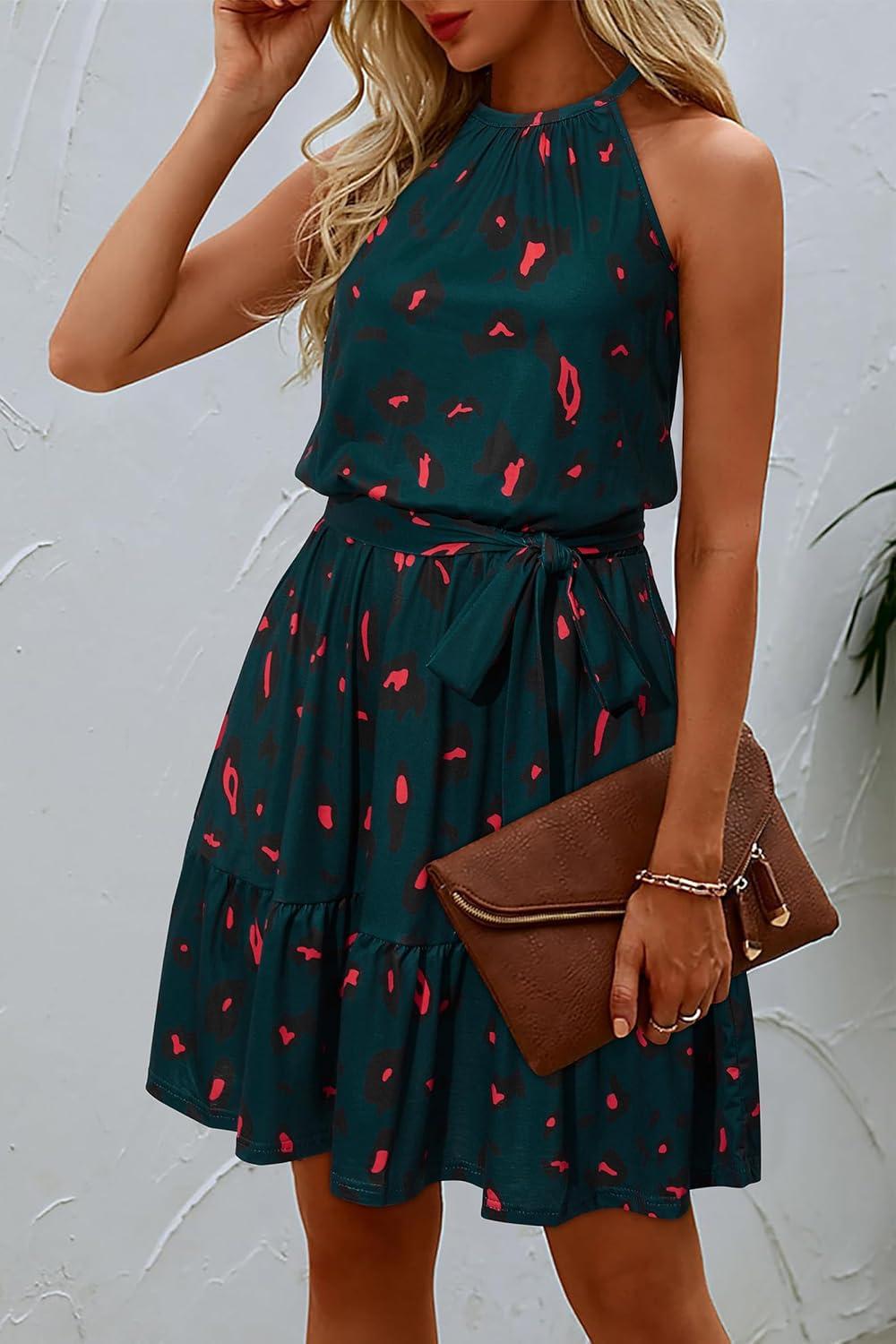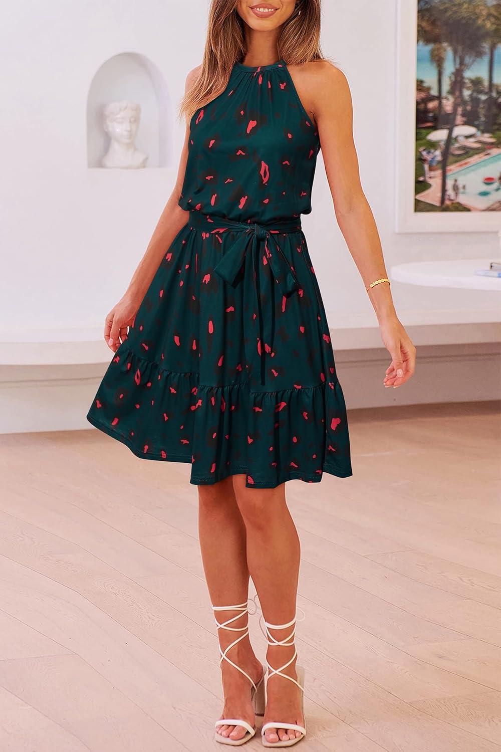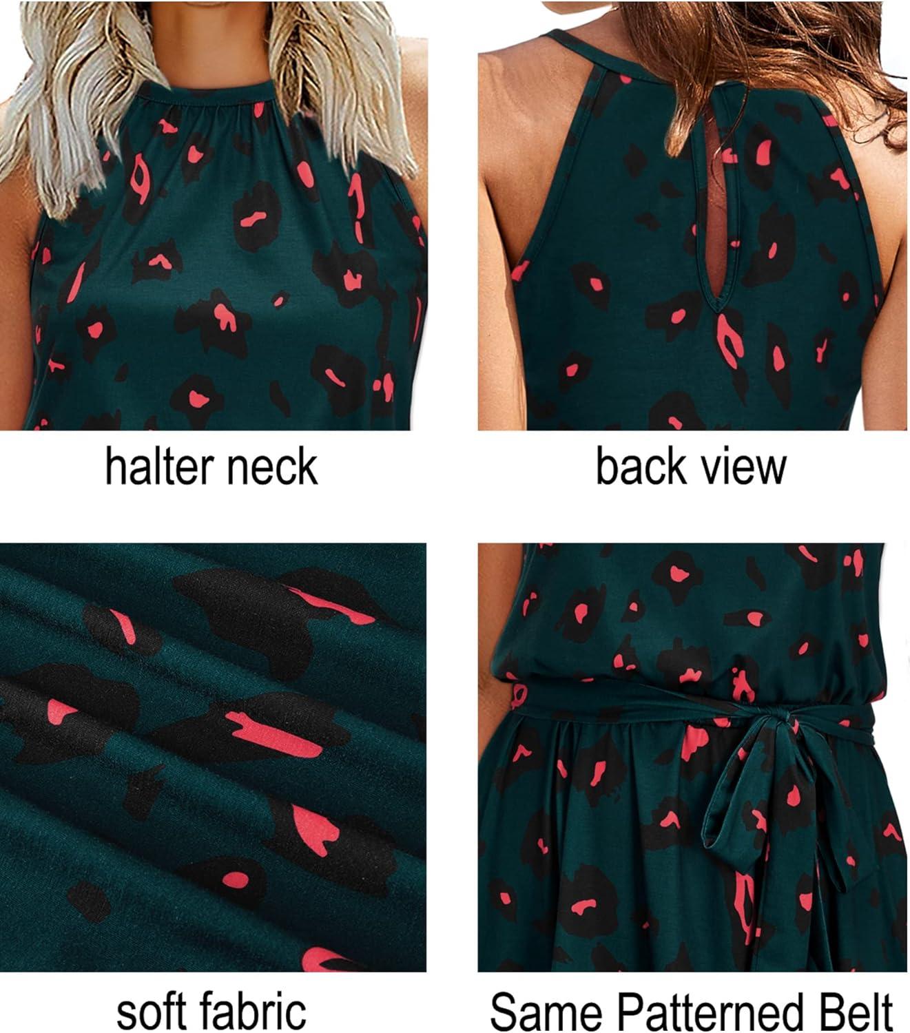 Newshows Womens 2025 Summer Dress Halter Wedding Guest Casual Beach Vacation Outfits Belted Sundresses with Pockets(Black Floral Red)