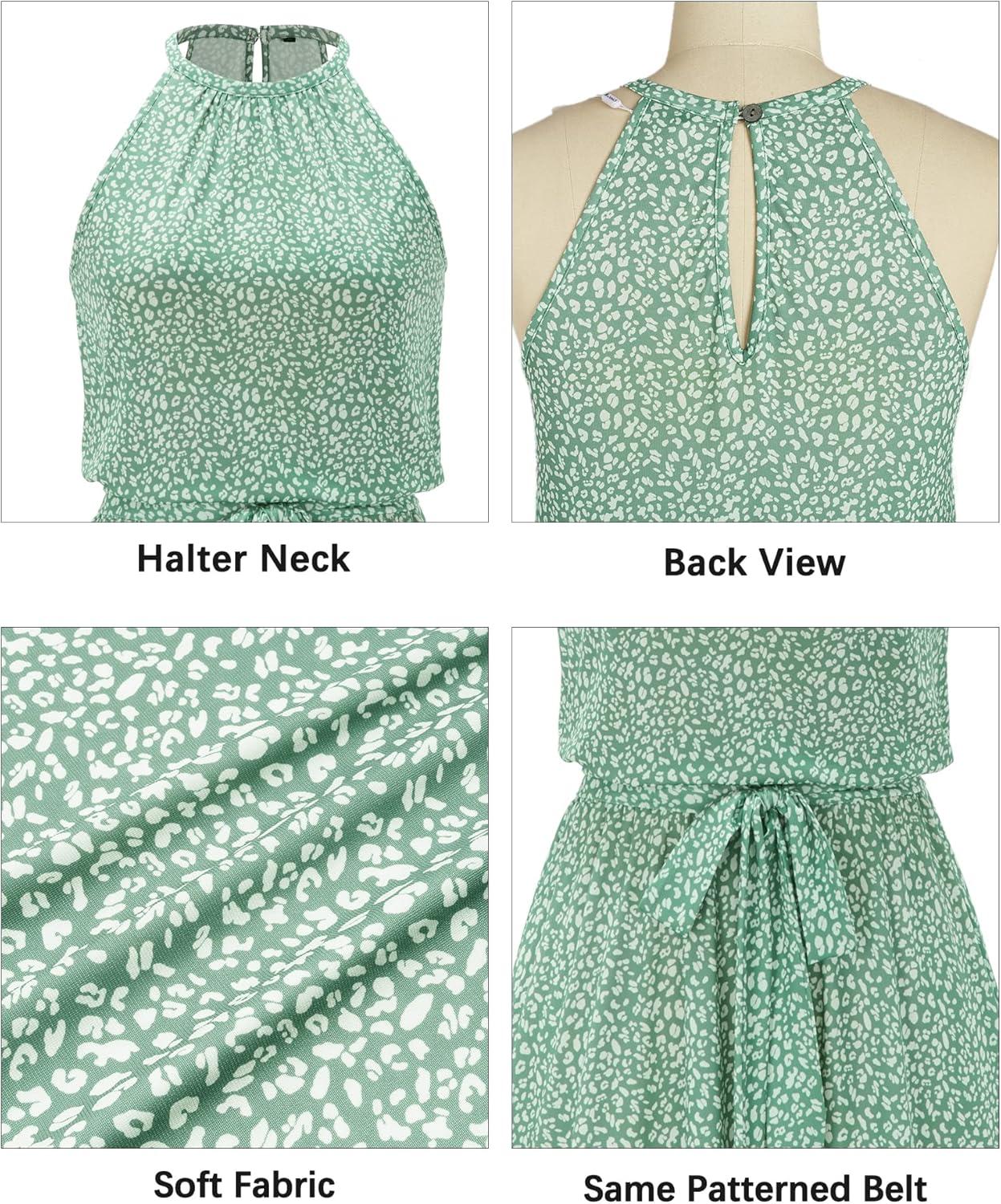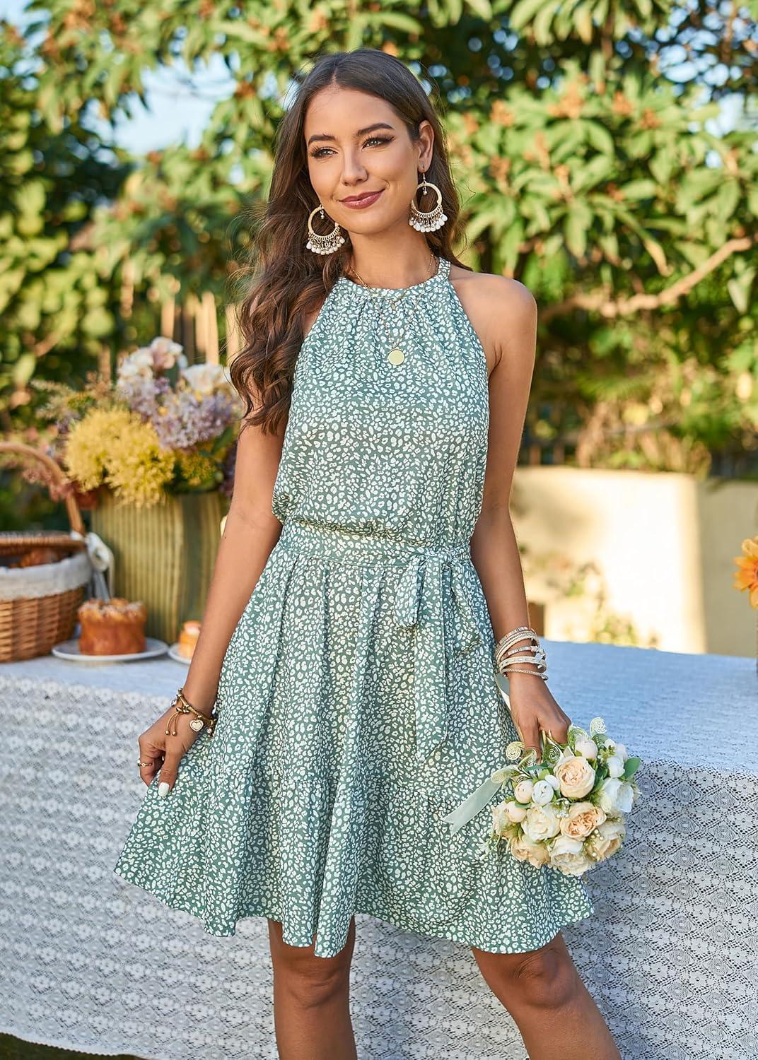 Newshows Womens 2025 Summer Dress Halter Wedding Guest Casual Beach Vacation Outfits Belted Sundresses with Pockets(Light Green Floral White)