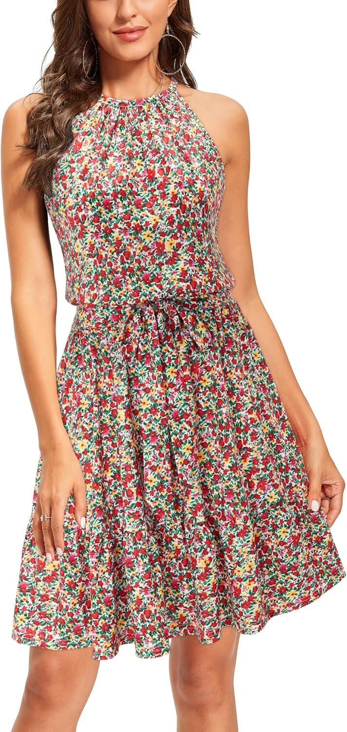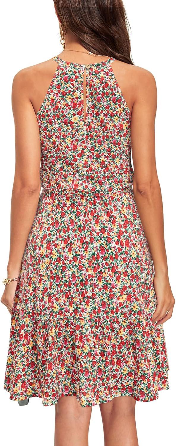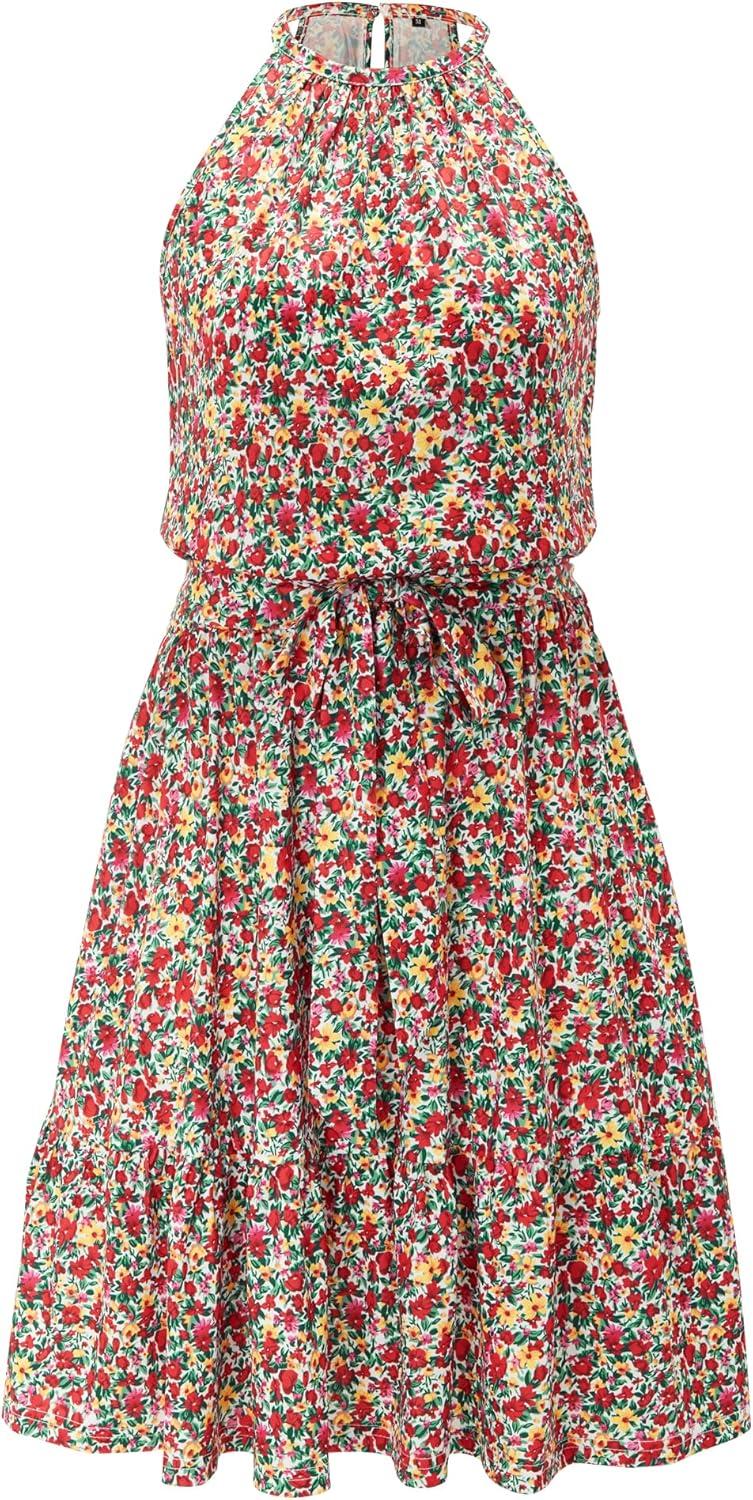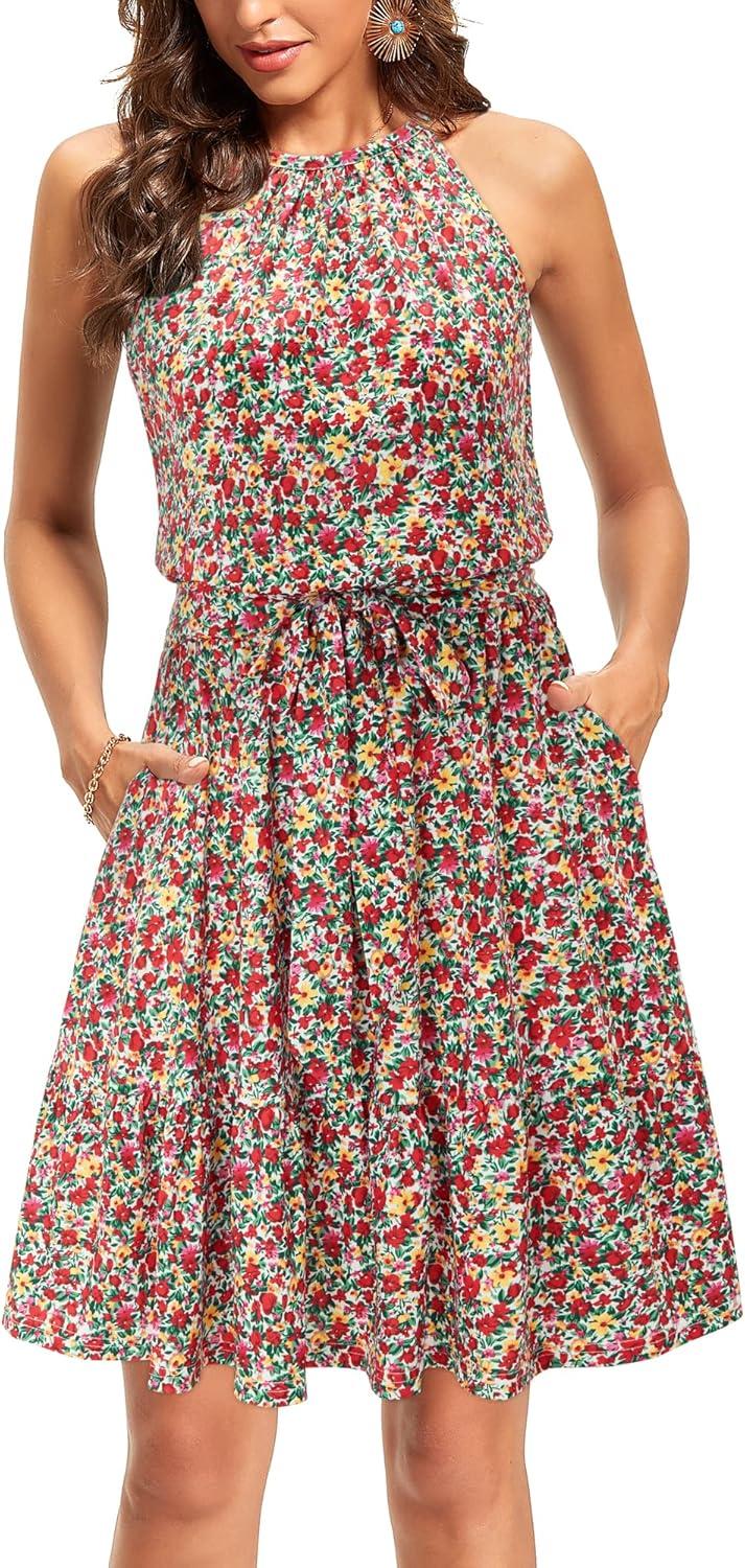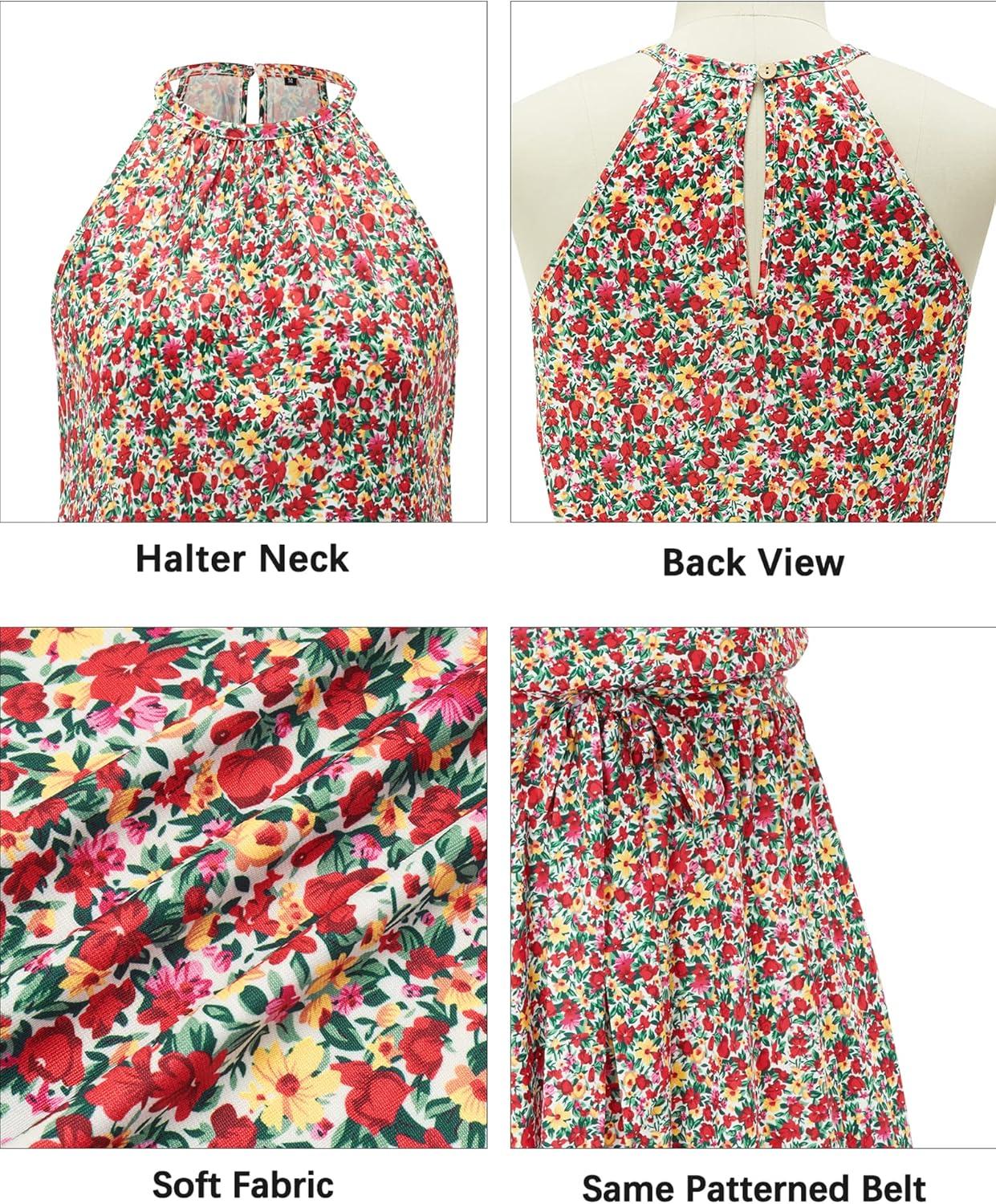 Newshows Womens 2025 Summer Dress Halter Wedding Guest Casual Beach Vacation Outfits Belted Sundresses with Pockets(Red Floral Yellow)