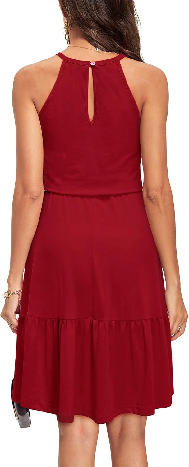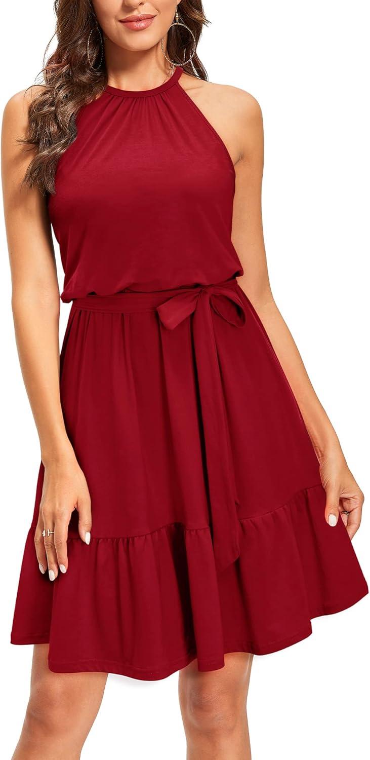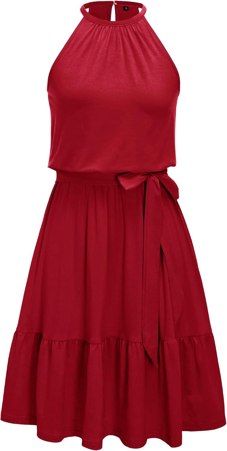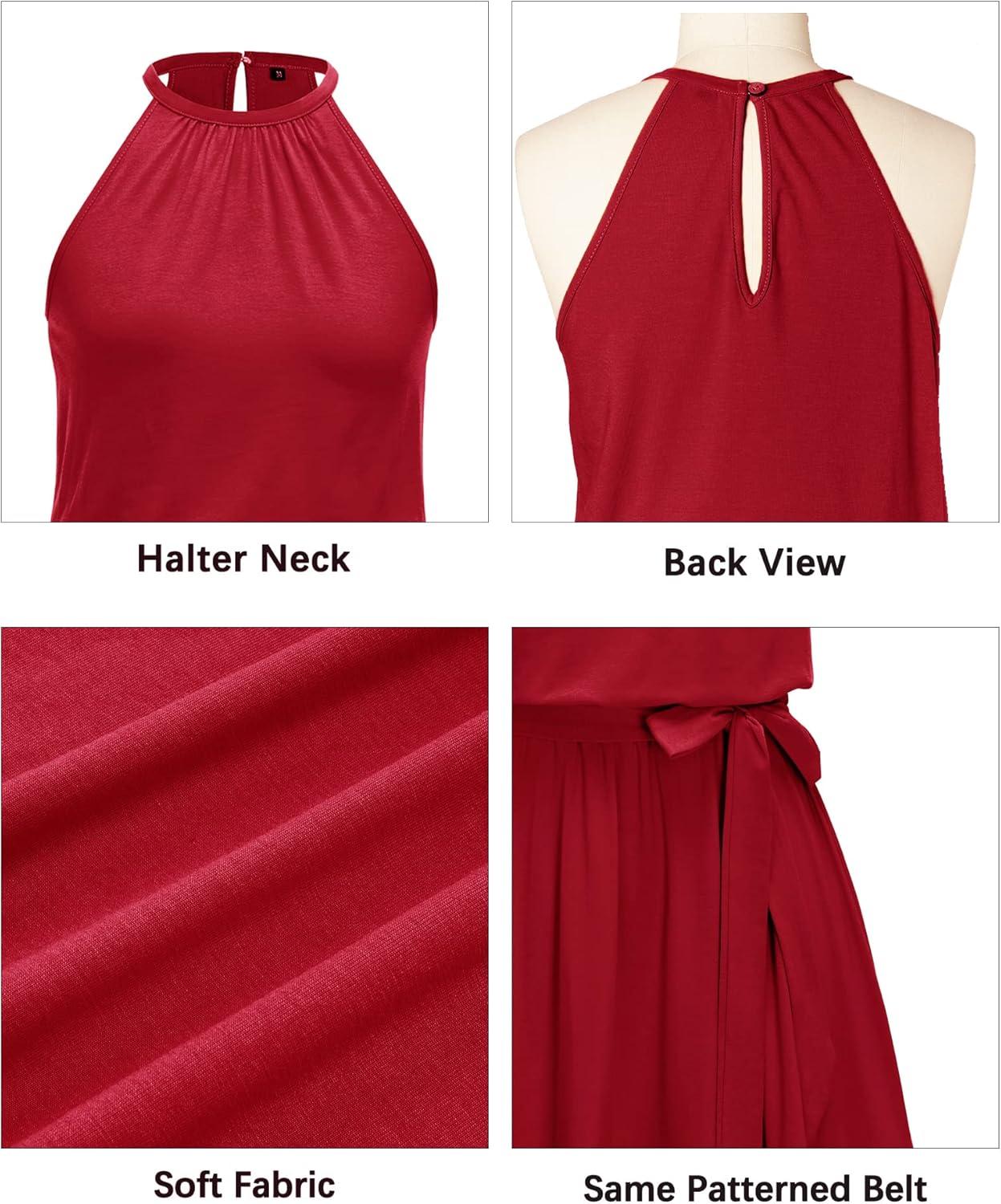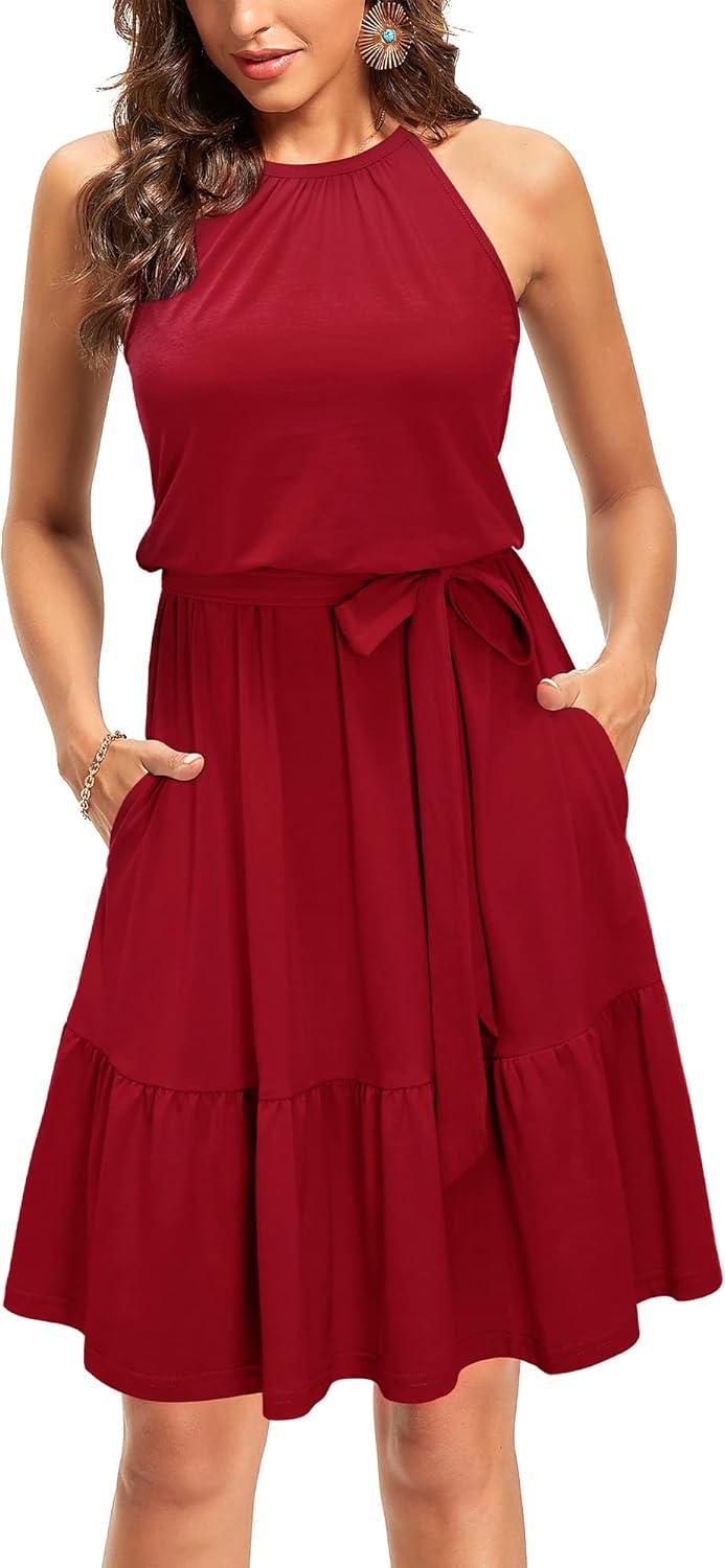 Newshows Womens 2025 Summer Dress Halter Wedding Guest Casual Beach Vacation Outfits Belted Sundresses with Pockets(Wine Red)