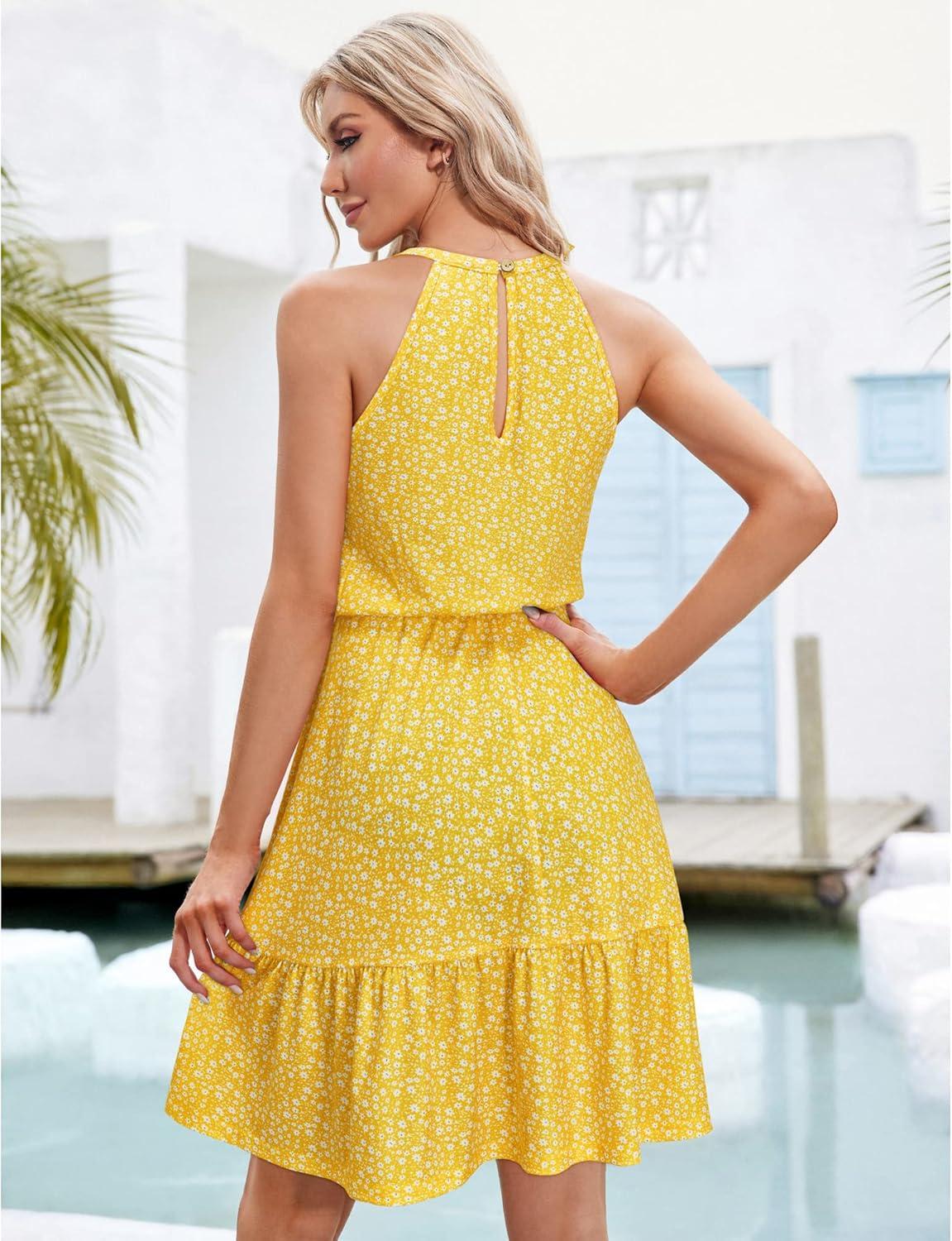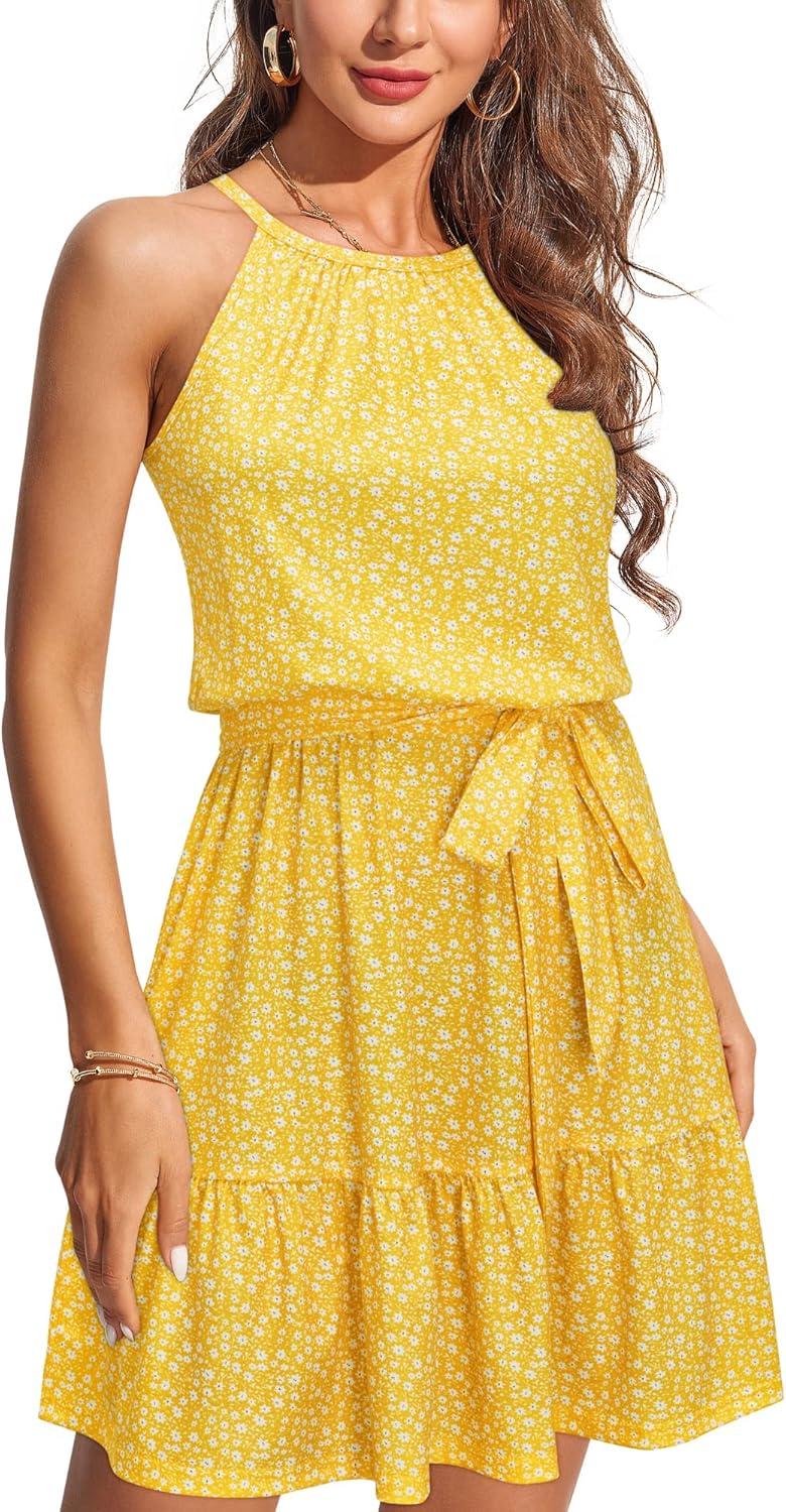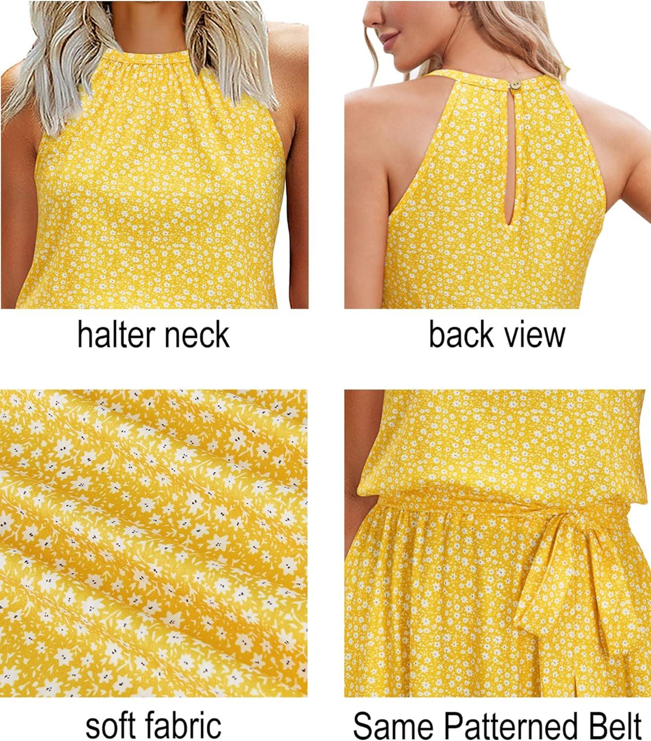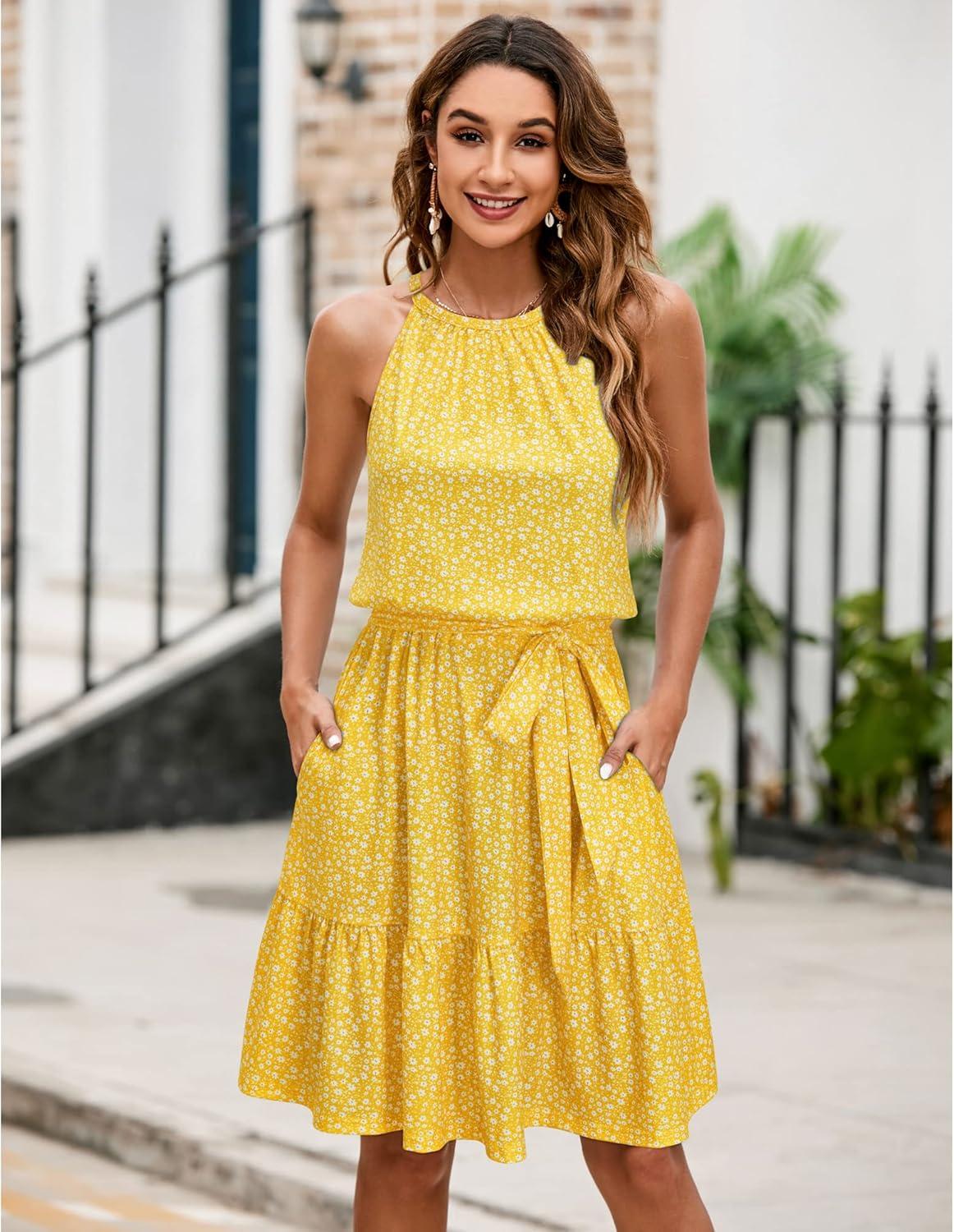 Newshows Womens 2025 Summer Dress Halter Wedding Guest Casual Beach Vacation Outfits Belted Sundresses with Pockets(Yellow Floral White)