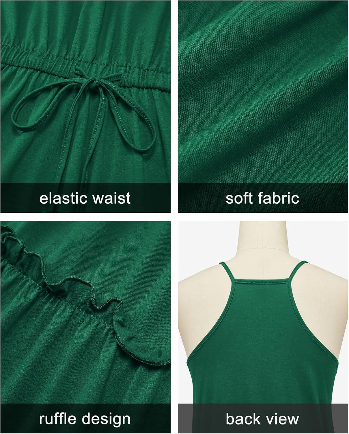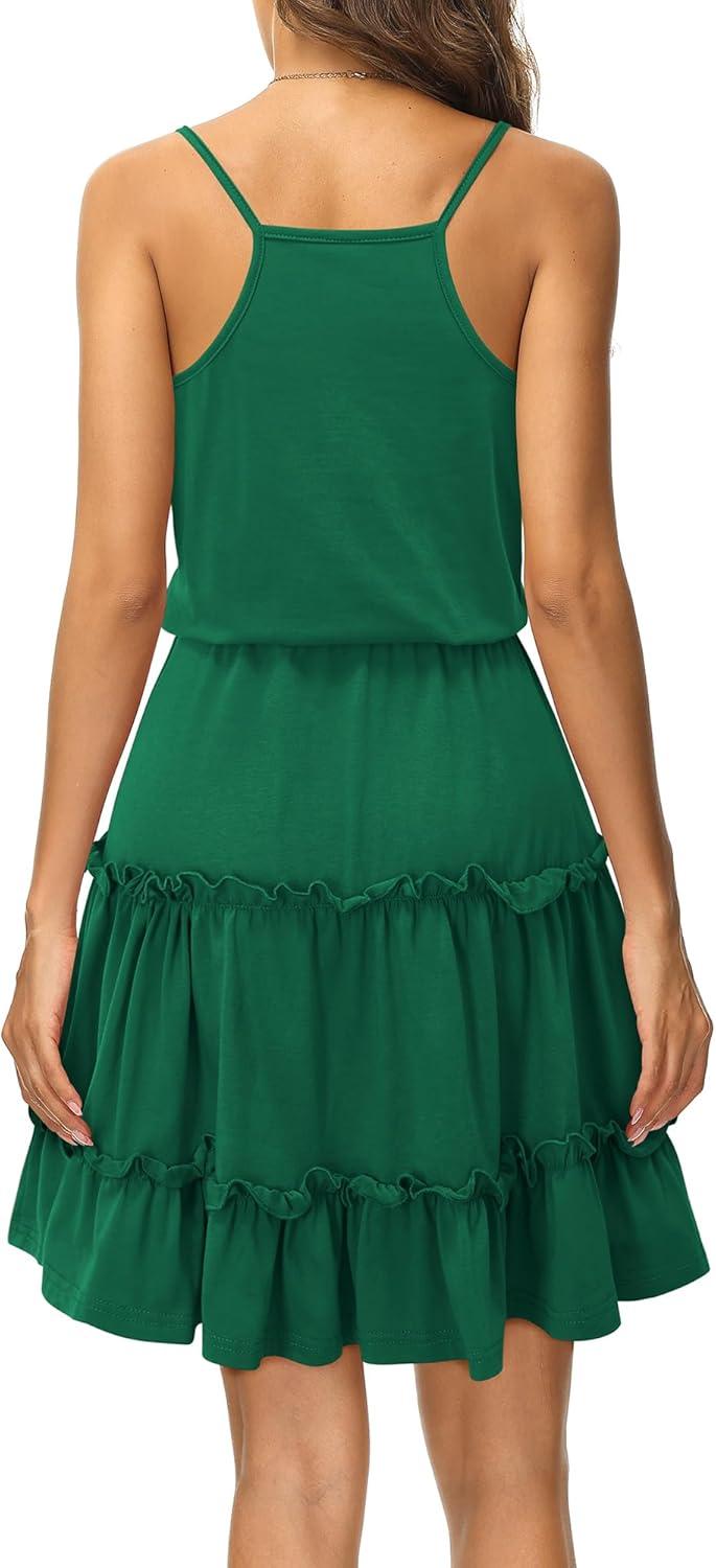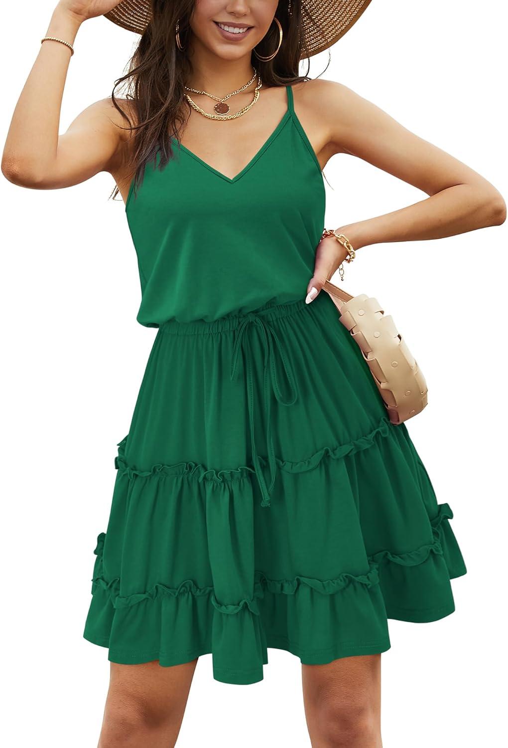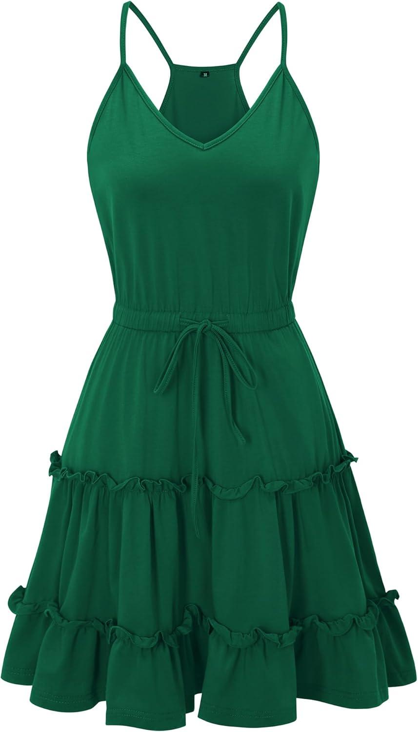 Newshows Women’s 2025 Summer Dress Spaghetti Strap Casual Boho Beach Vacation Outfits Drawstring Ruffle Hem Sundress Trendy(Dark Green)