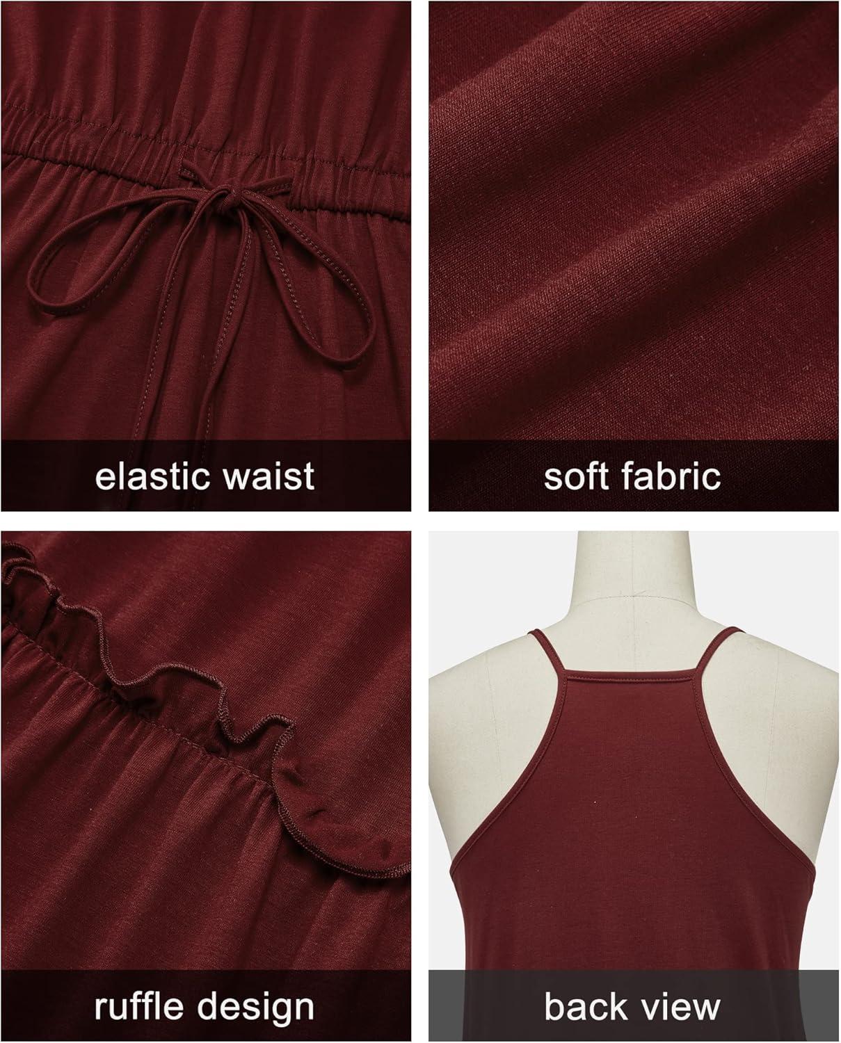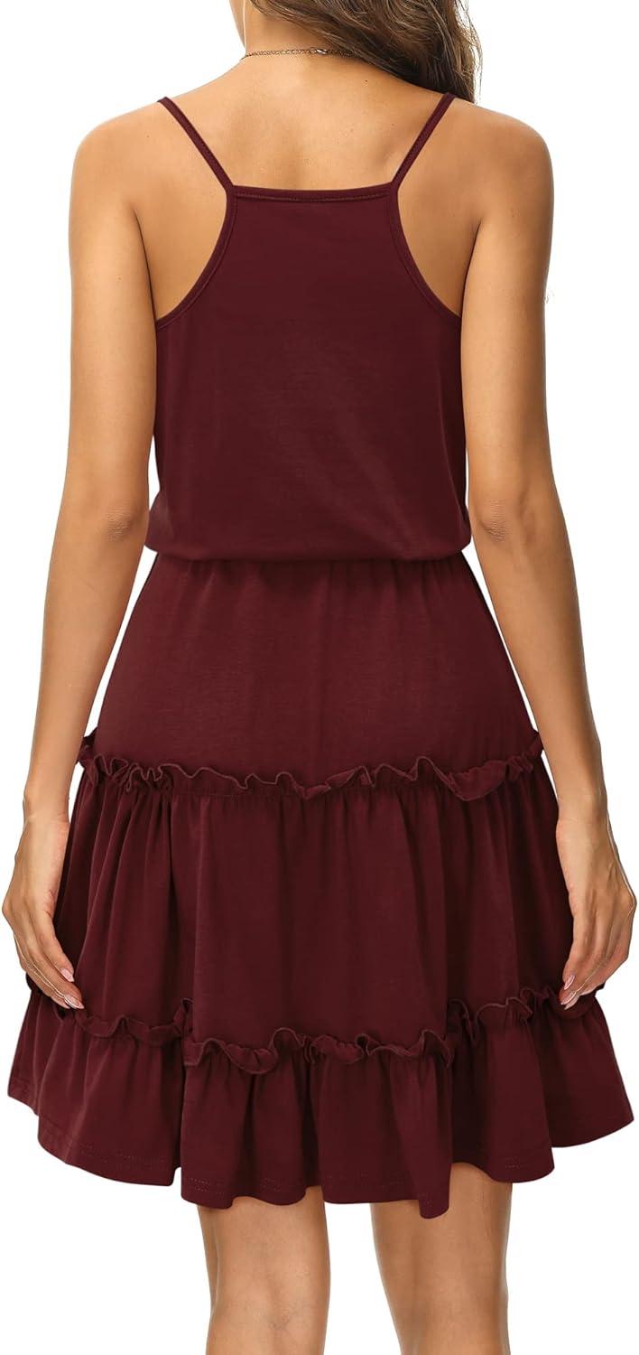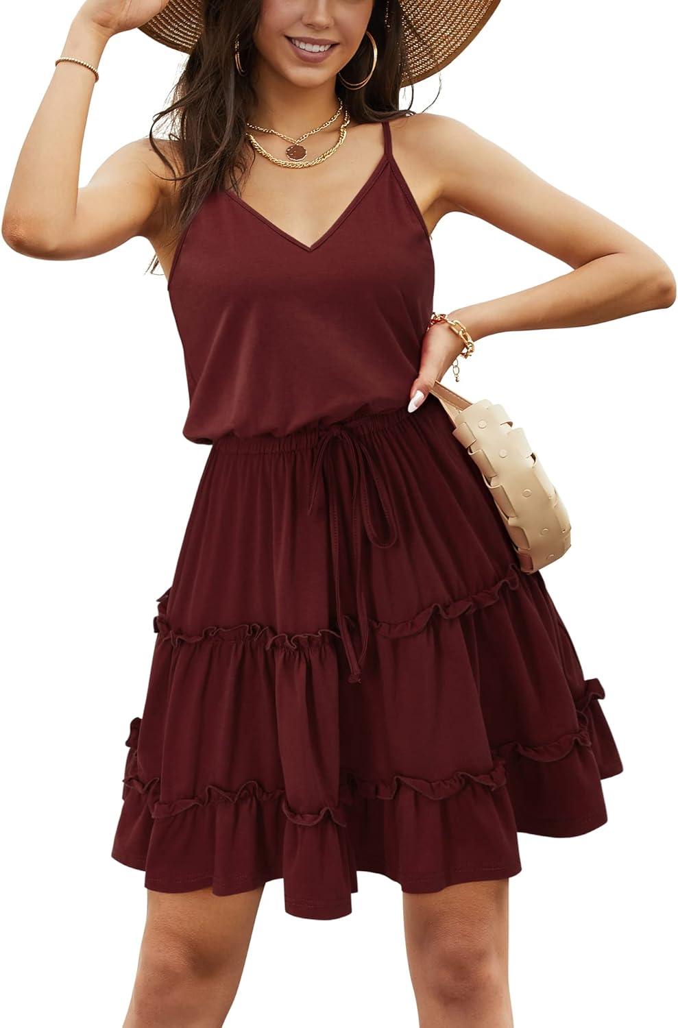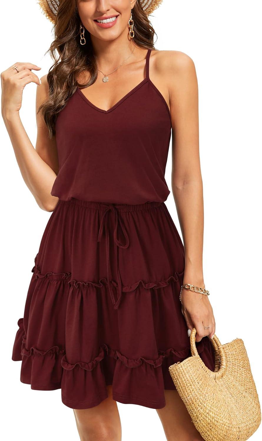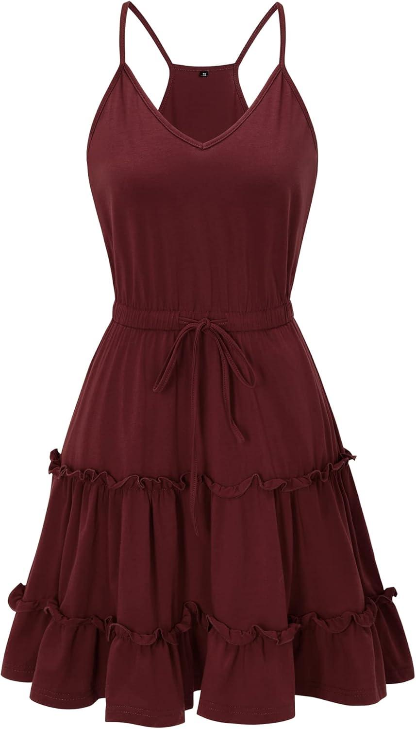 Newshows Women’s 2025 Summer Dress Spaghetti Strap Casual Boho Beach Vacation Outfits Drawstring Ruffle Hem Sundress Trendy(Dark Red)