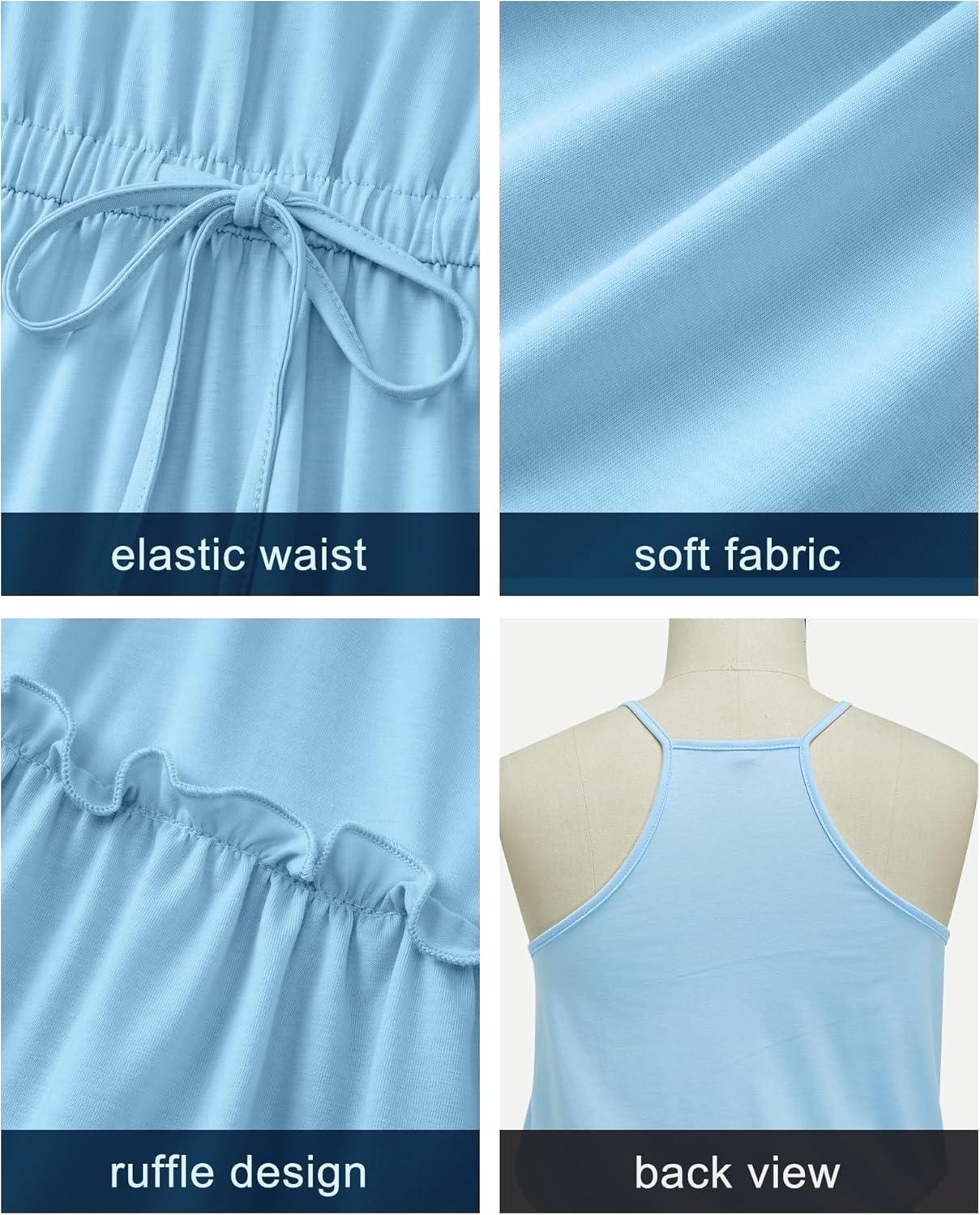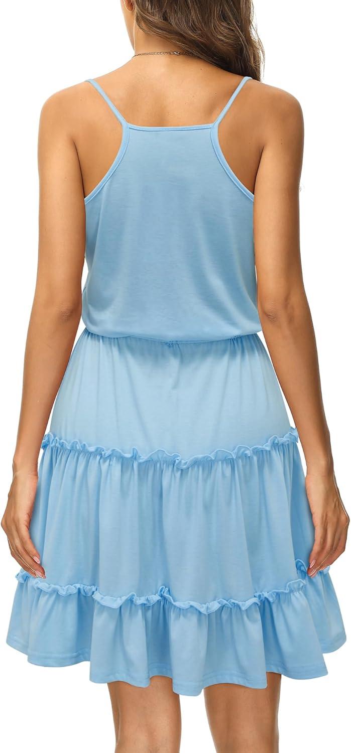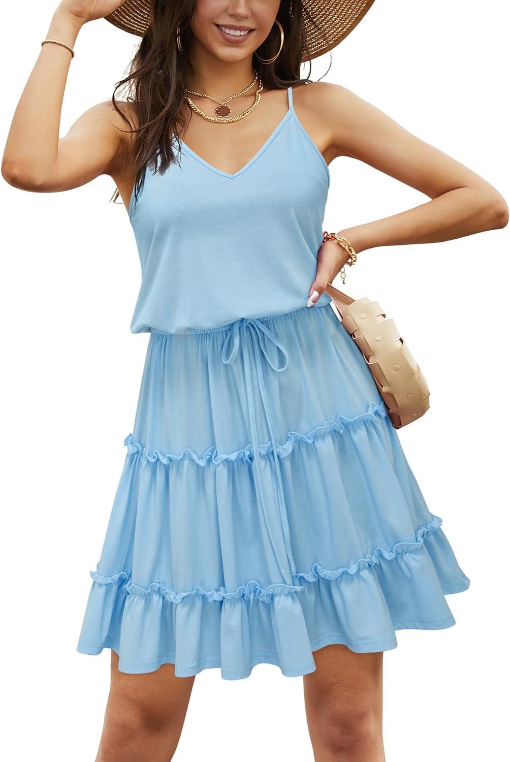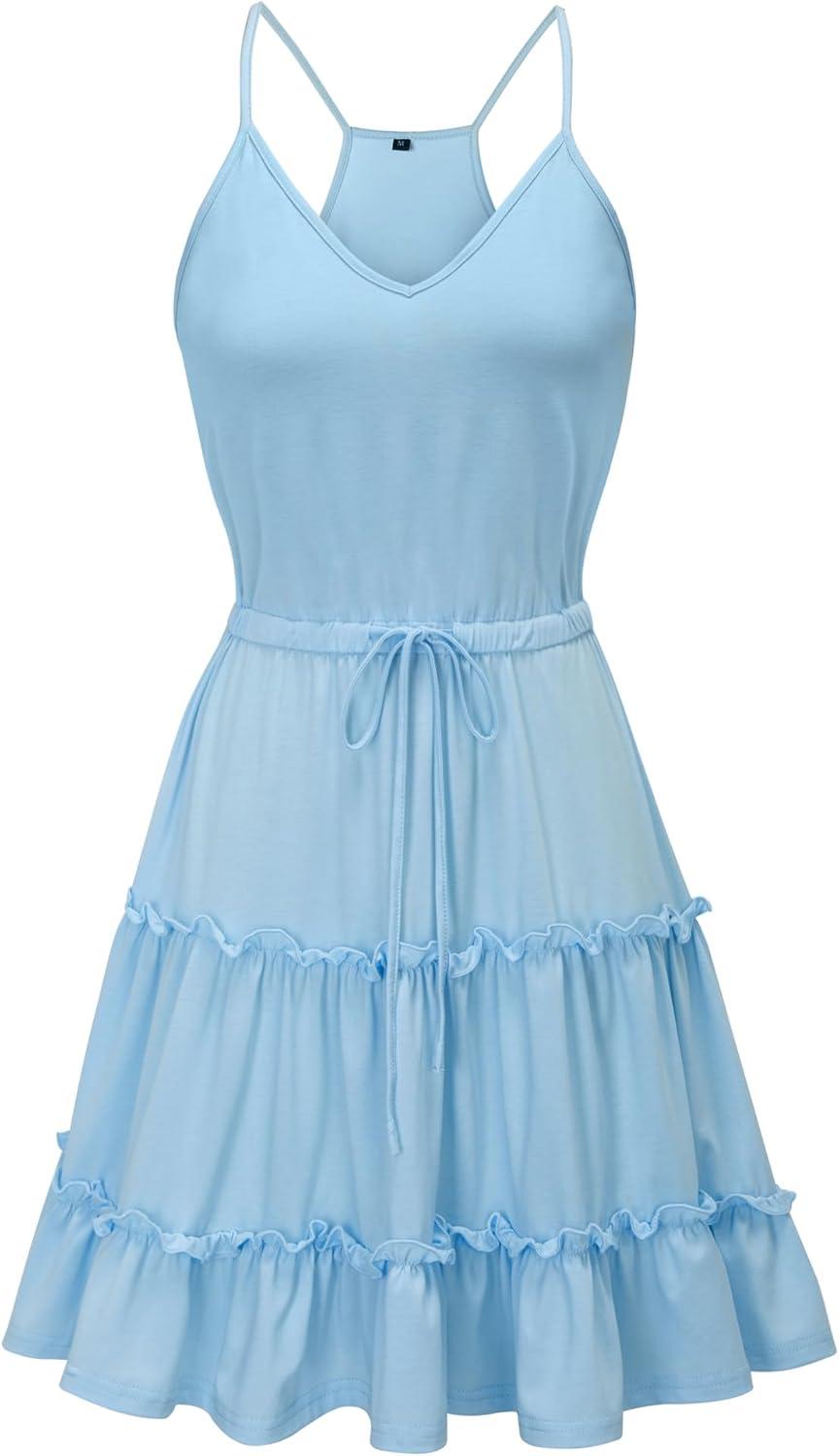 Newshows Women’s 2025 Summer Dress Spaghetti Strap Casual Boho Beach Vacation Outfits Drawstring Ruffle Hem Sundress Trendy(Light Blue)
