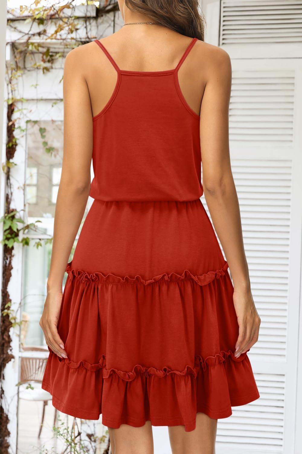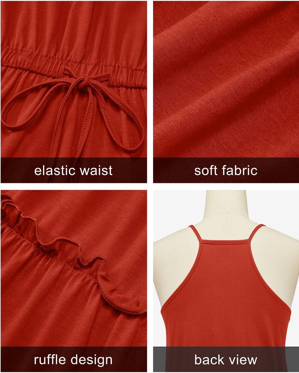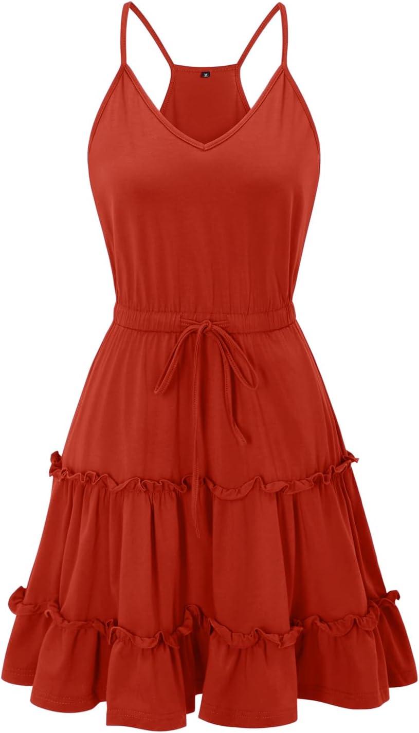 Newshows Women’s 2025 Summer Dress Spaghetti Strap Casual Boho Beach Vacation Outfits Drawstring Ruffle Hem Sundress Trendy(Orange-1)