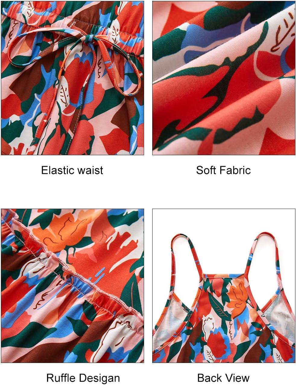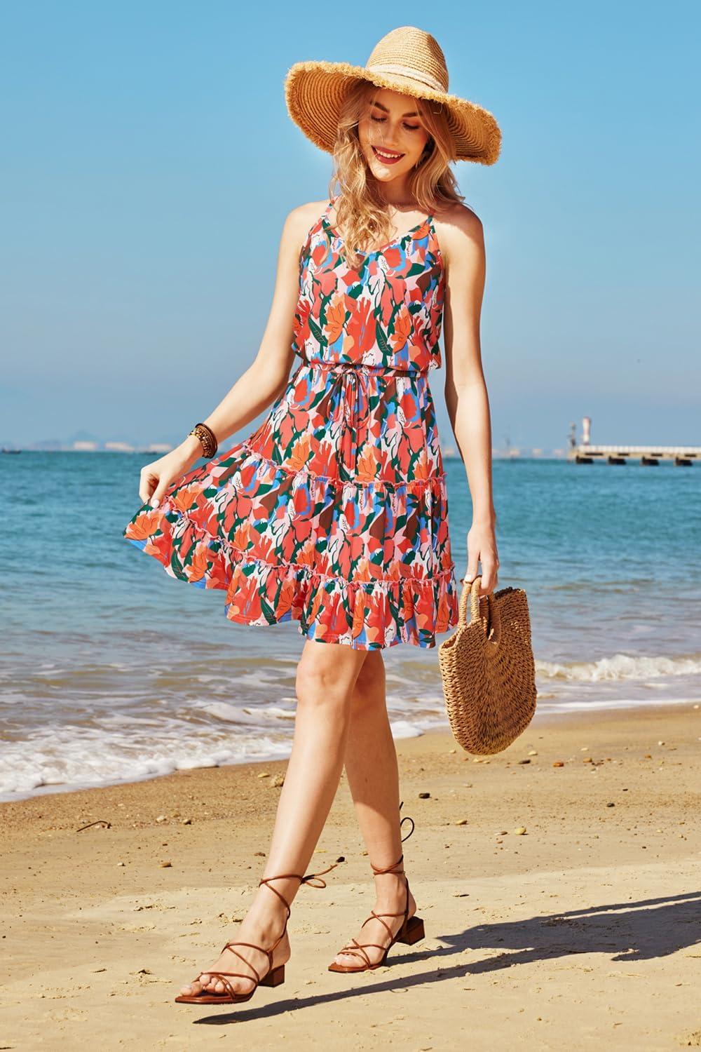 Newshows Women’s 2025 Summer Dress Spaghetti Strap Casual Boho Beach Vacation Outfits Drawstring Ruffle Hem Sundress Trendy(Orange Floral Blue)
