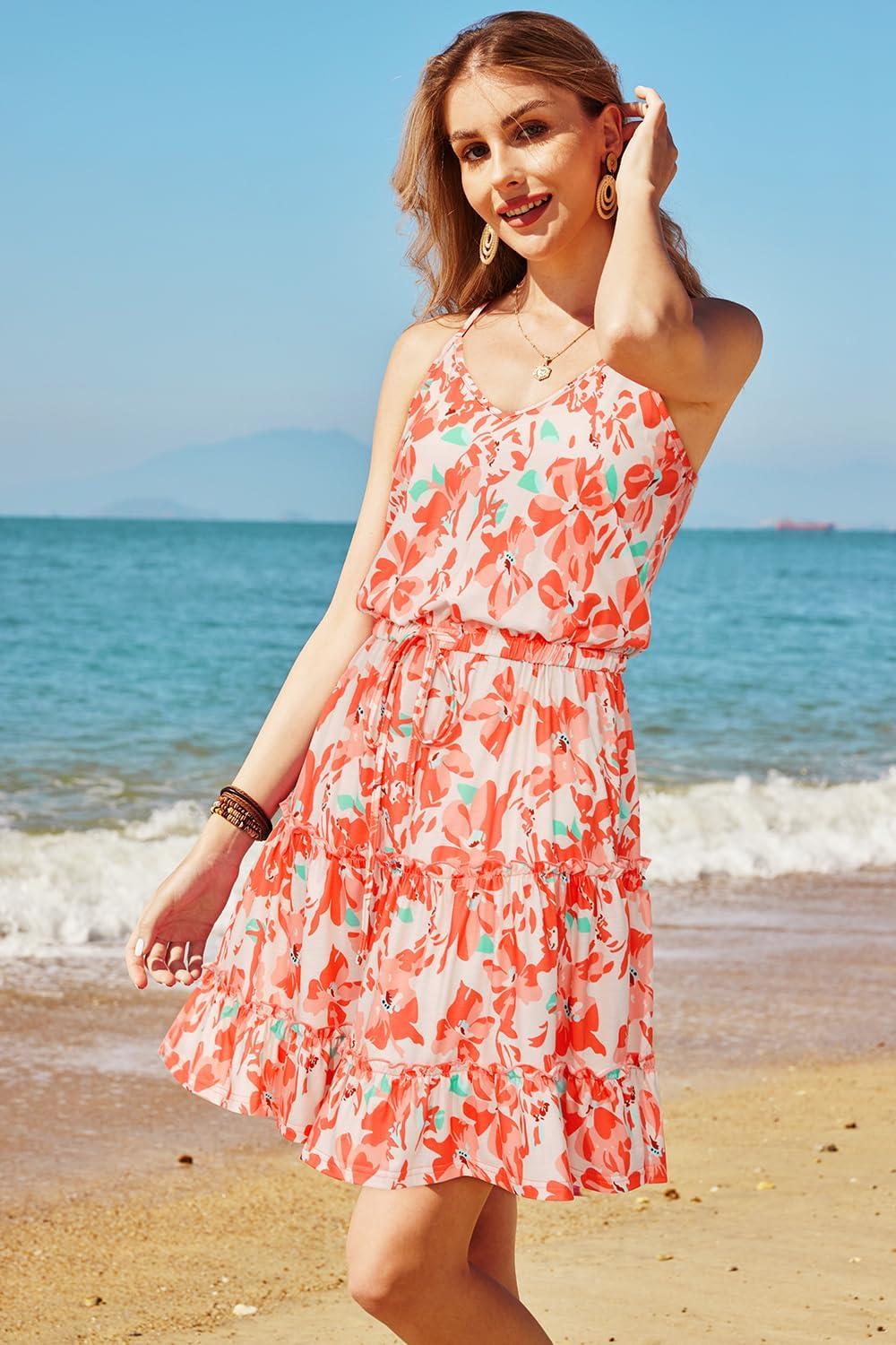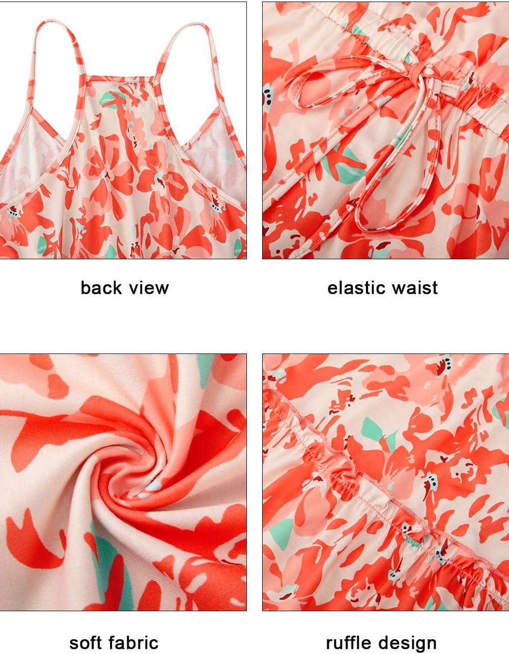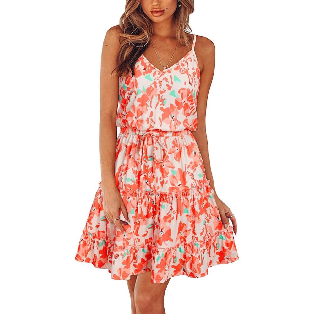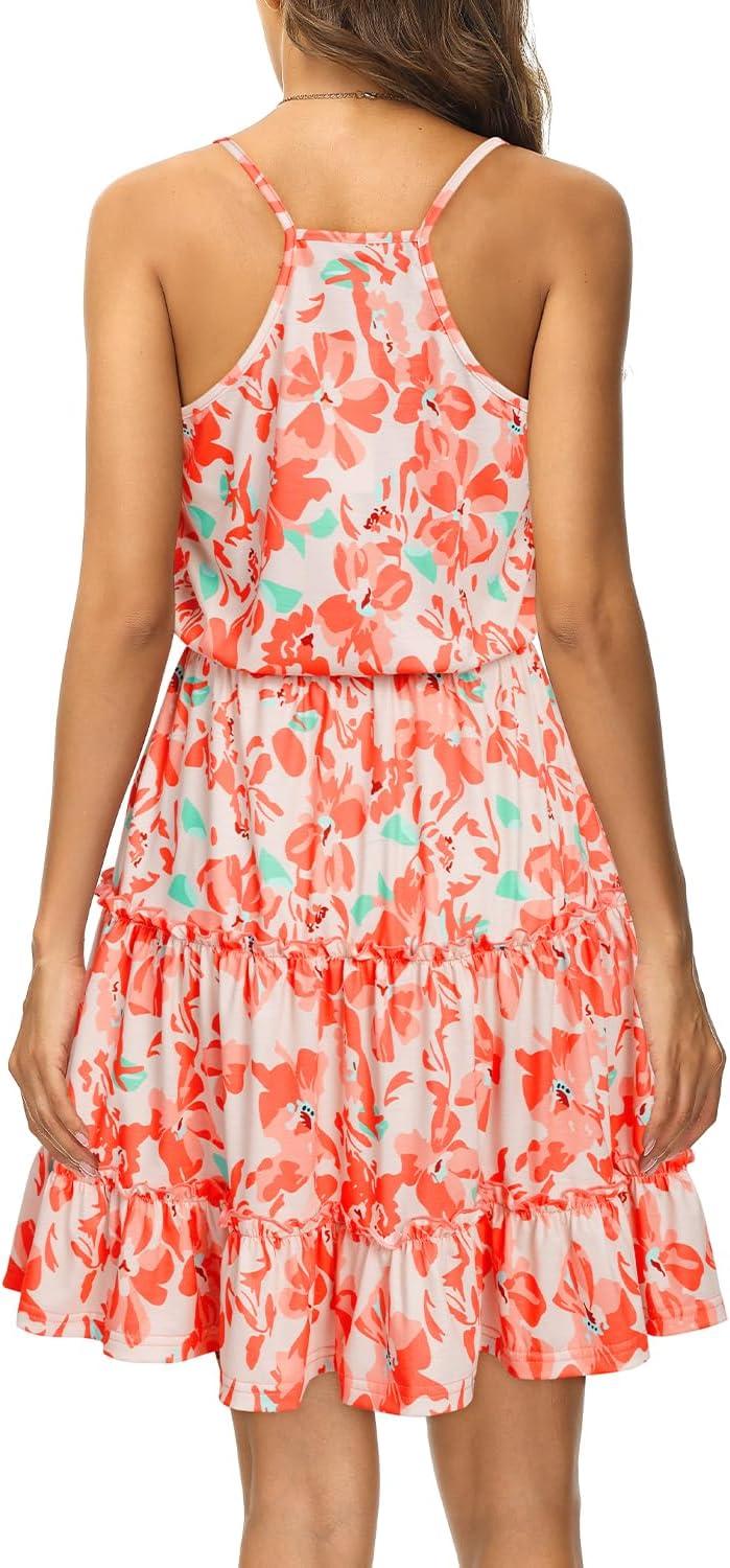 Newshows Women’s 2025 Summer Dress Spaghetti Strap Casual Boho Beach Vacation Outfits Drawstring Ruffle Hem Sundress Trendy(Pink Floral Red)