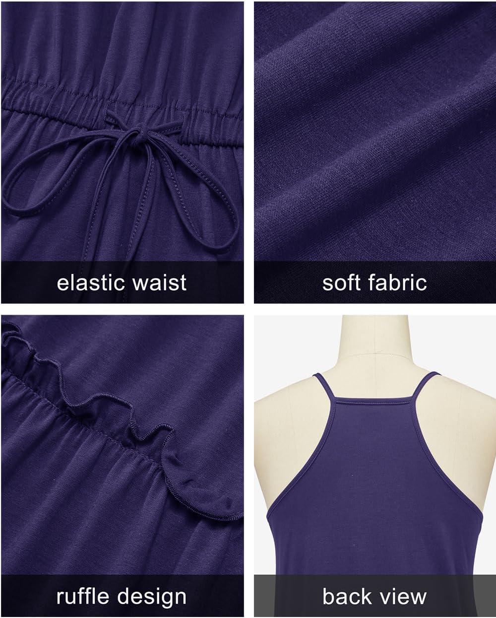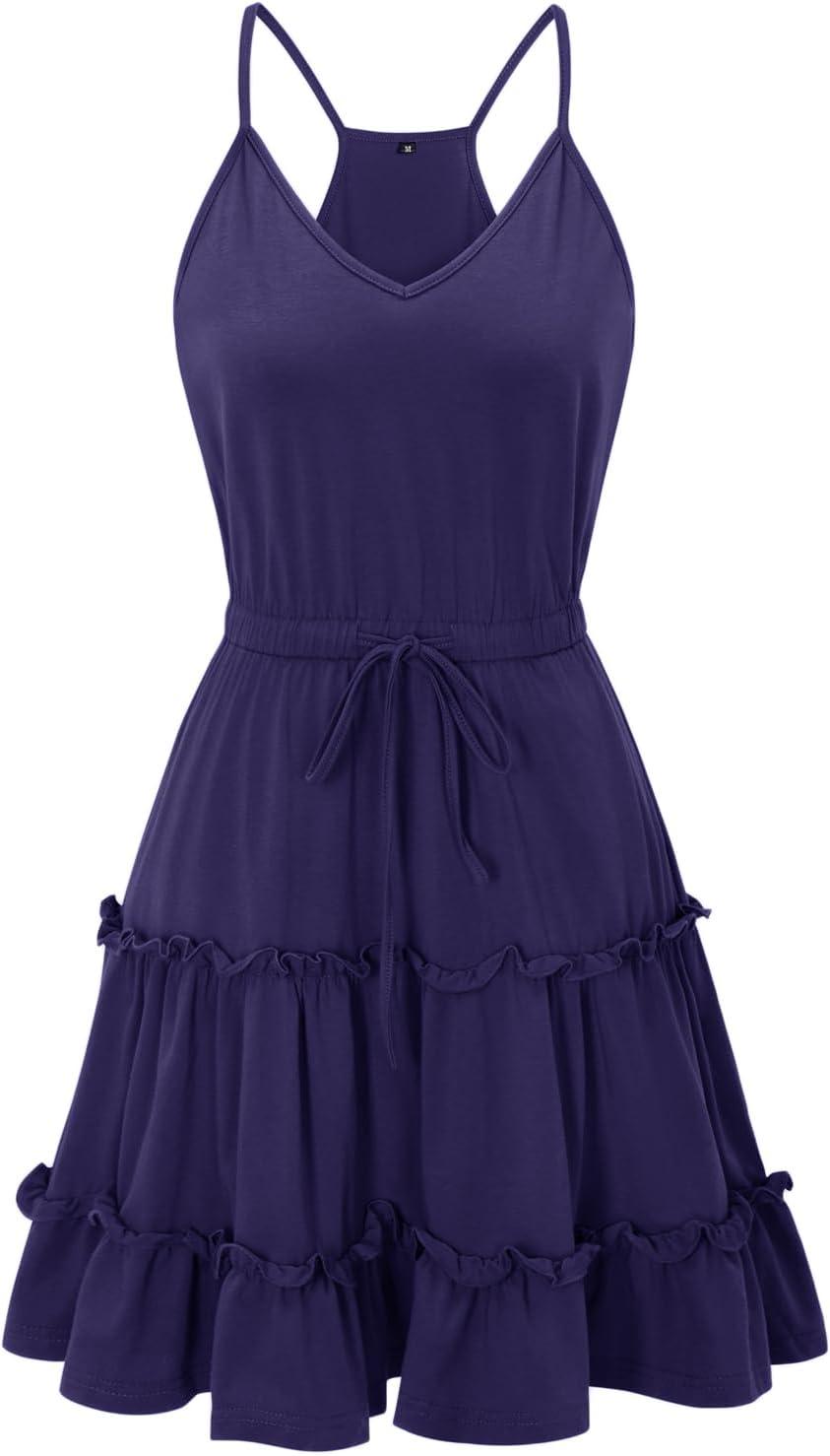 Newshows Women’s 2025 Summer Dress Spaghetti Strap Casual Boho Beach Vacation Outfits Drawstring Ruffle Hem Sundress Trendy(Purple-1)