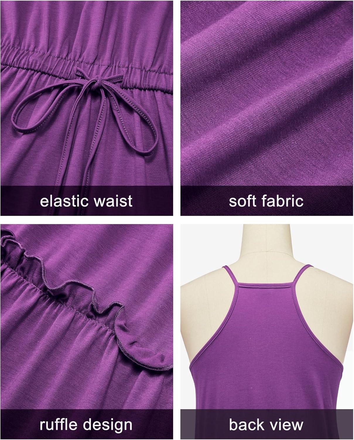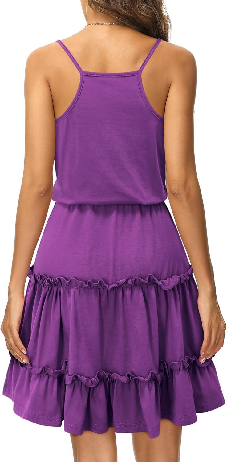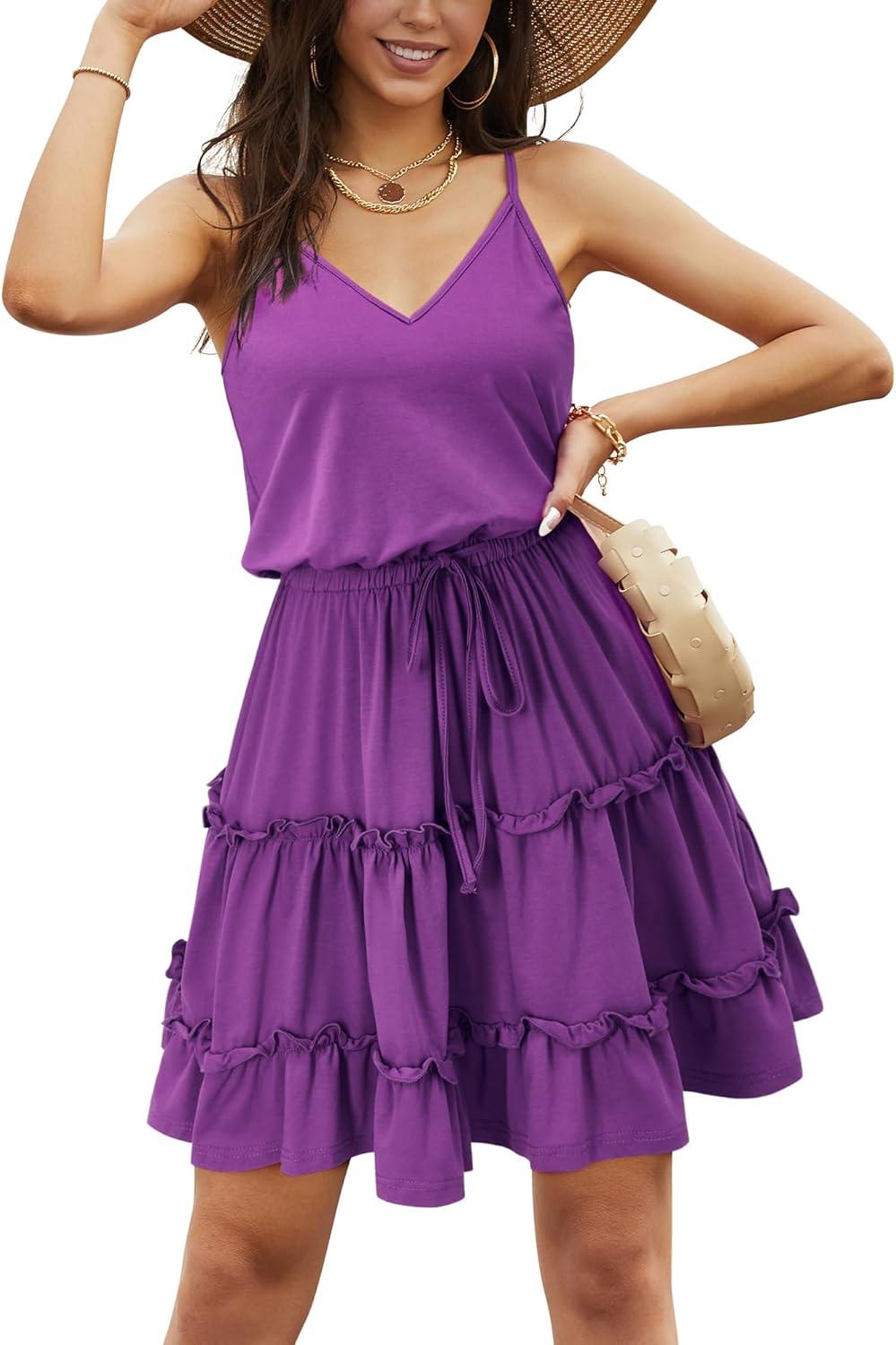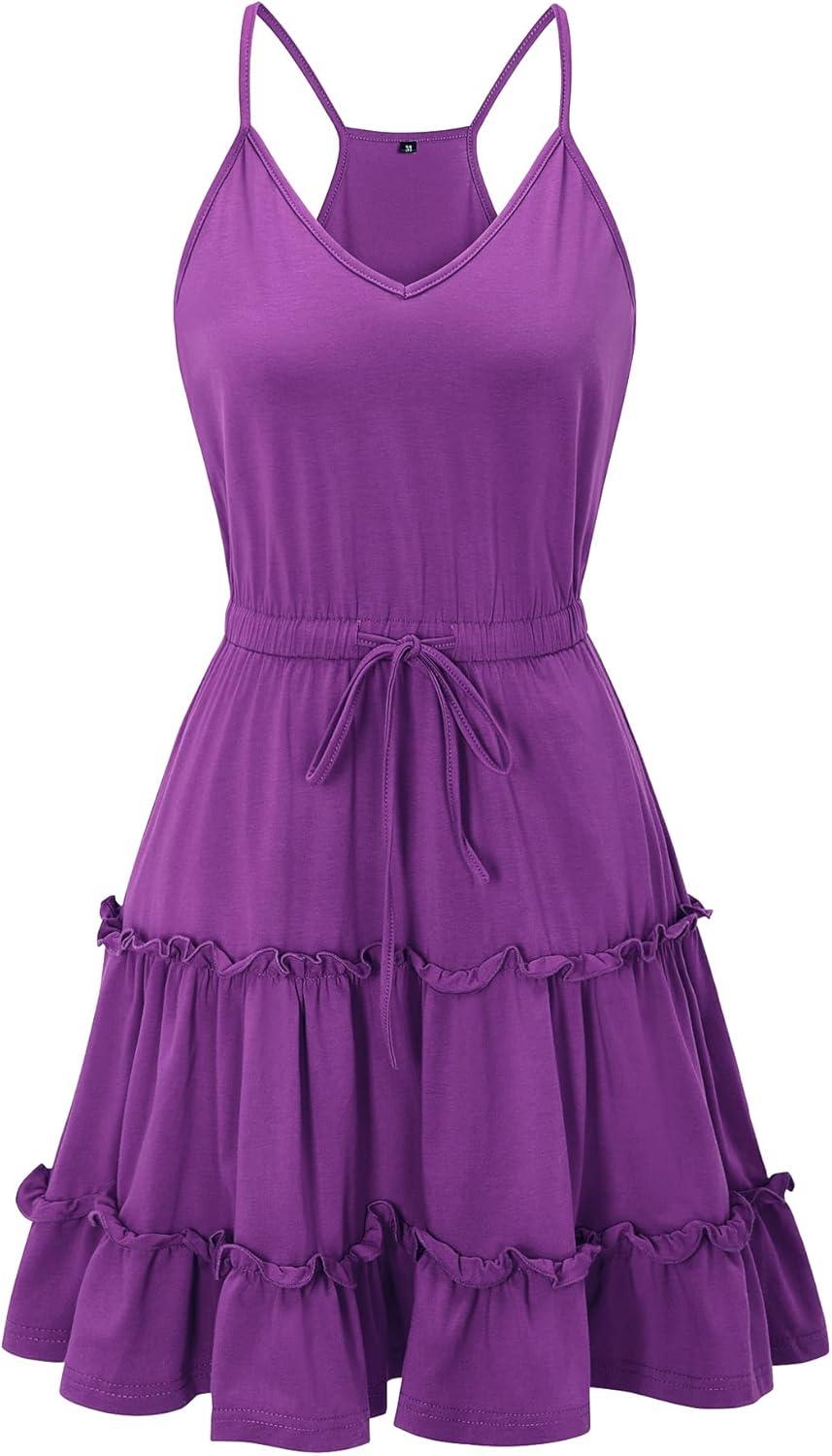 Newshows Women’s 2025 Summer Dress Spaghetti Strap Casual Boho Beach Vacation Outfits Drawstring Ruffle Hem Sundress Trendy(Purple)