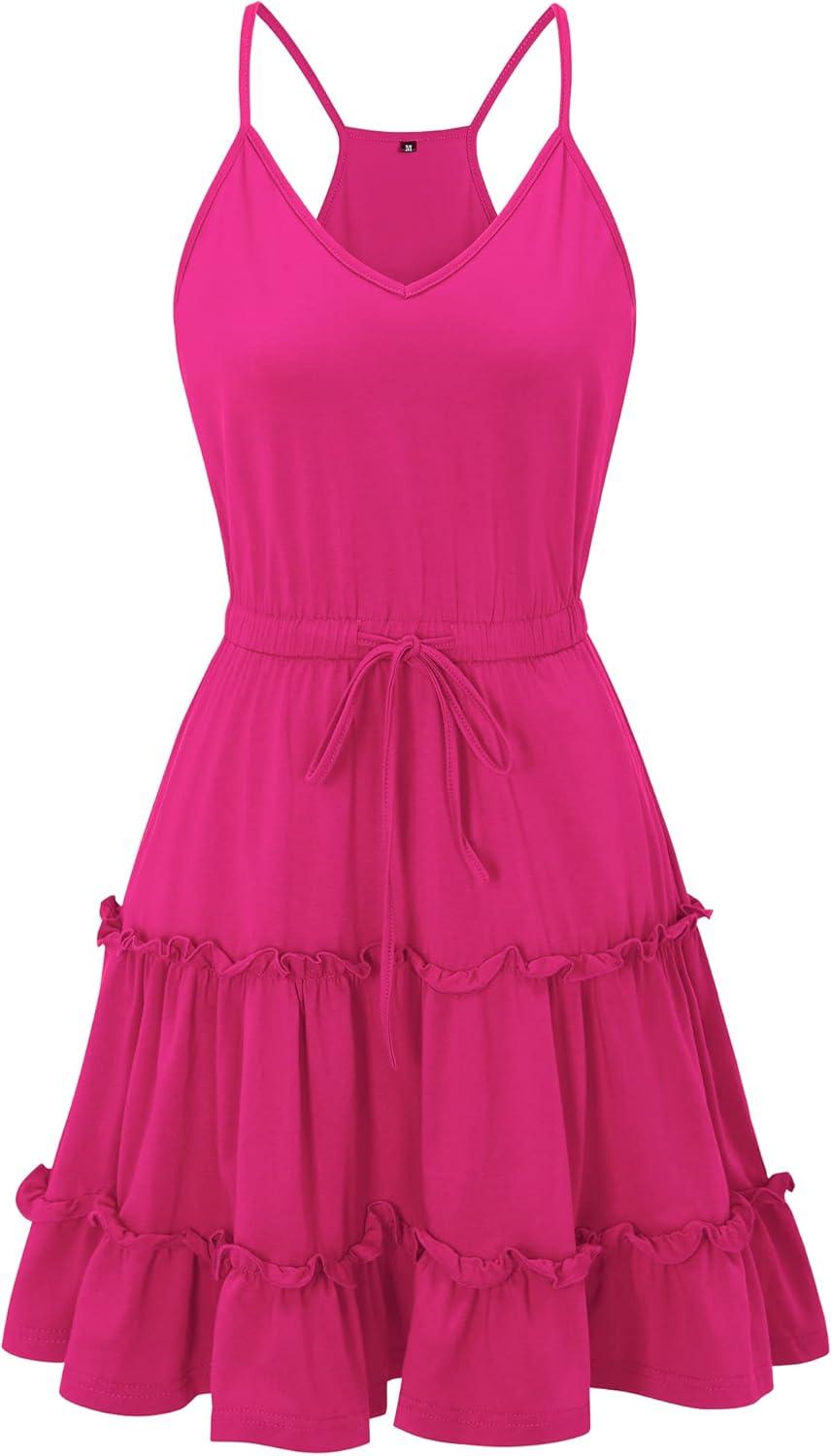 Newshows Women’s 2025 Summer Dress Spaghetti Strap Casual Boho Beach Vacation Outfits Drawstring Ruffle Hem Sundress Trendy(Rose Red)