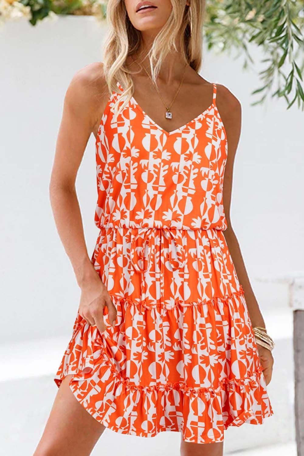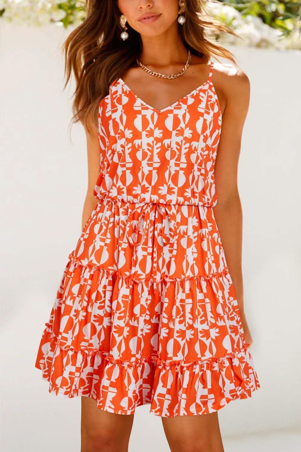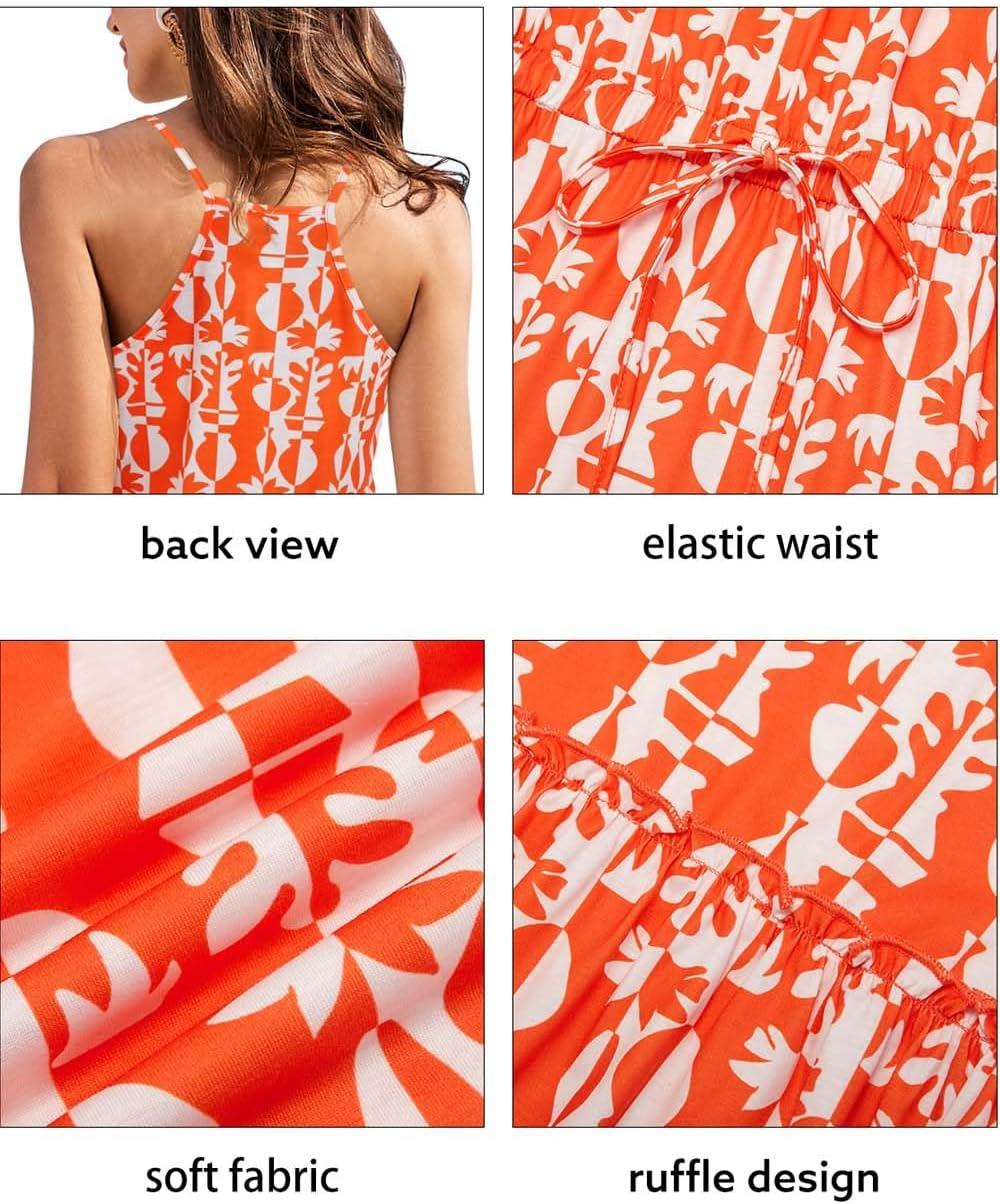 Newshows Women’s 2025 Summer Dress Spaghetti Strap Casual Boho Beach Vacation Outfits Drawstring Ruffle Hem Sundress Trendy(White Floral Orange)