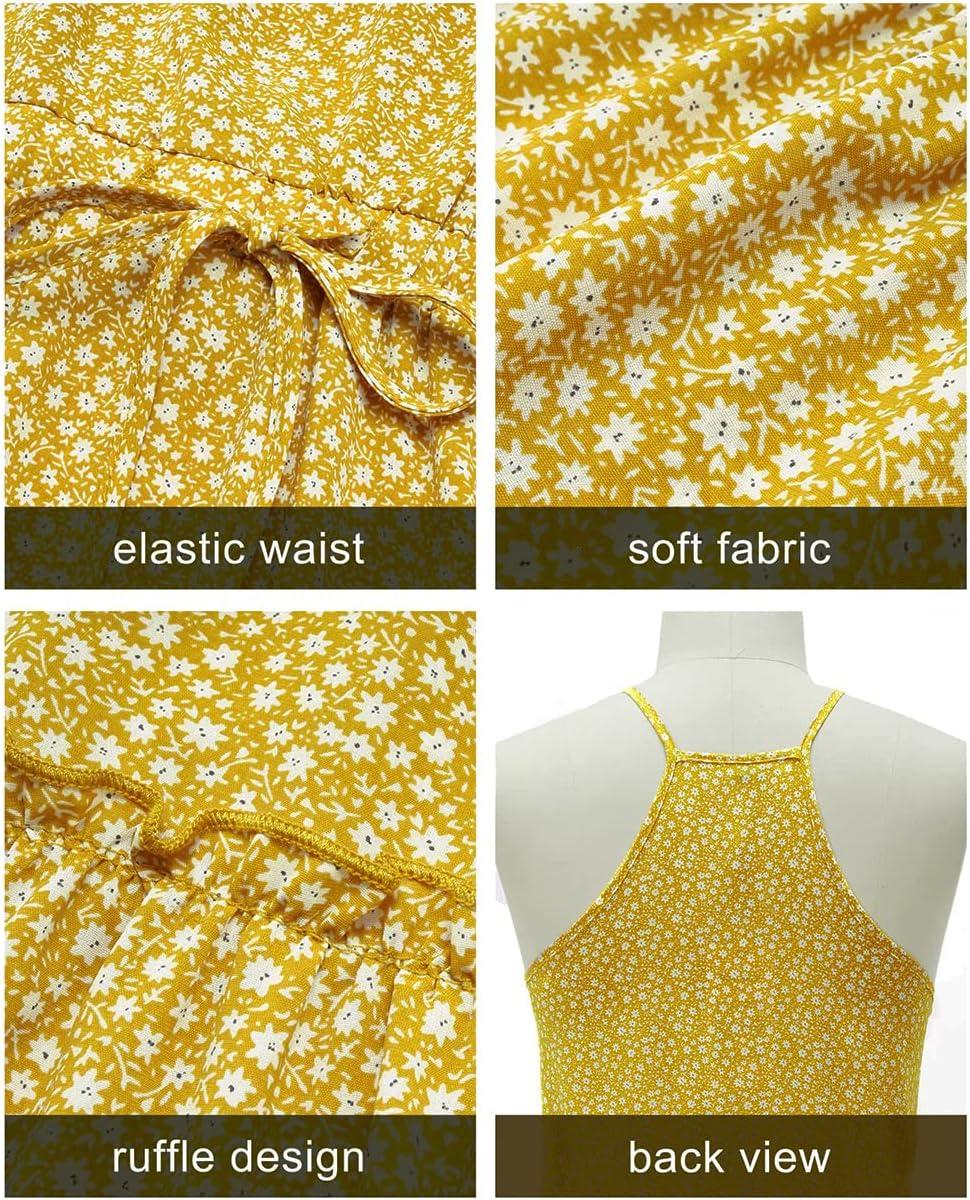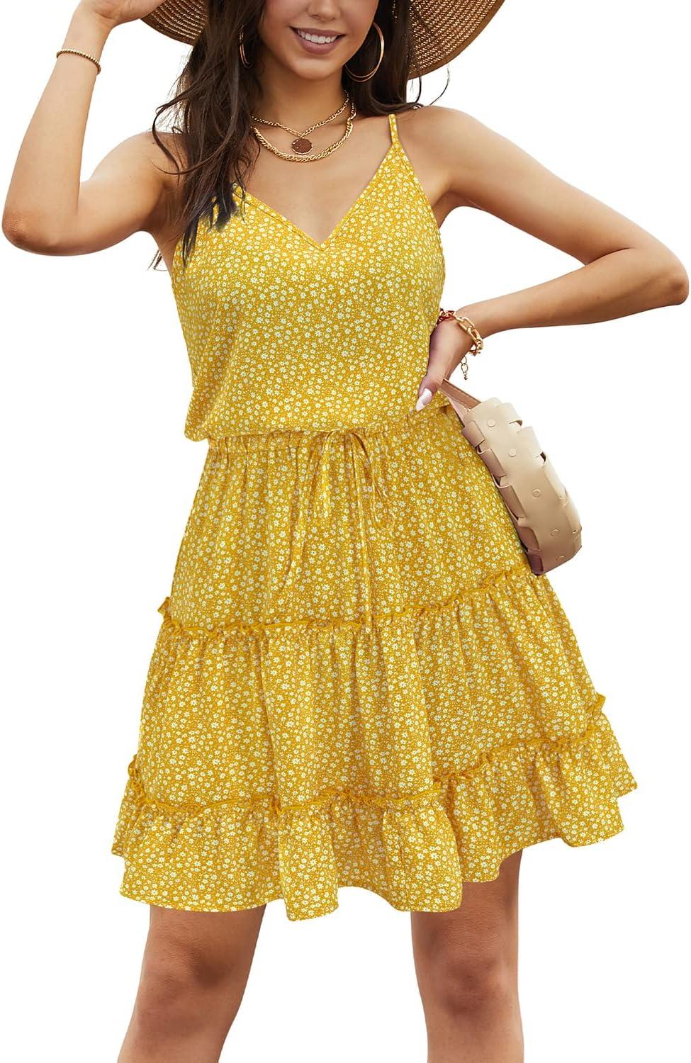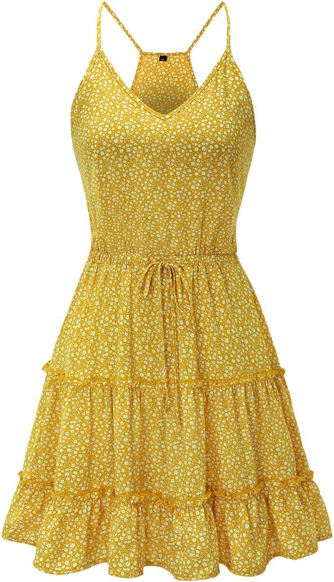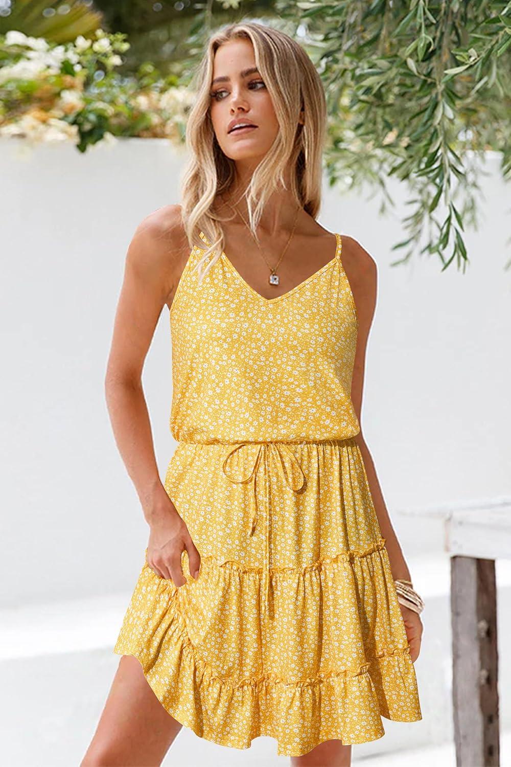 Newshows Women’s 2025 Summer Dress Spaghetti Strap Casual Boho Beach Vacation Outfits Drawstring Ruffle Hem Sundress Trendy(Yellow White Floral)