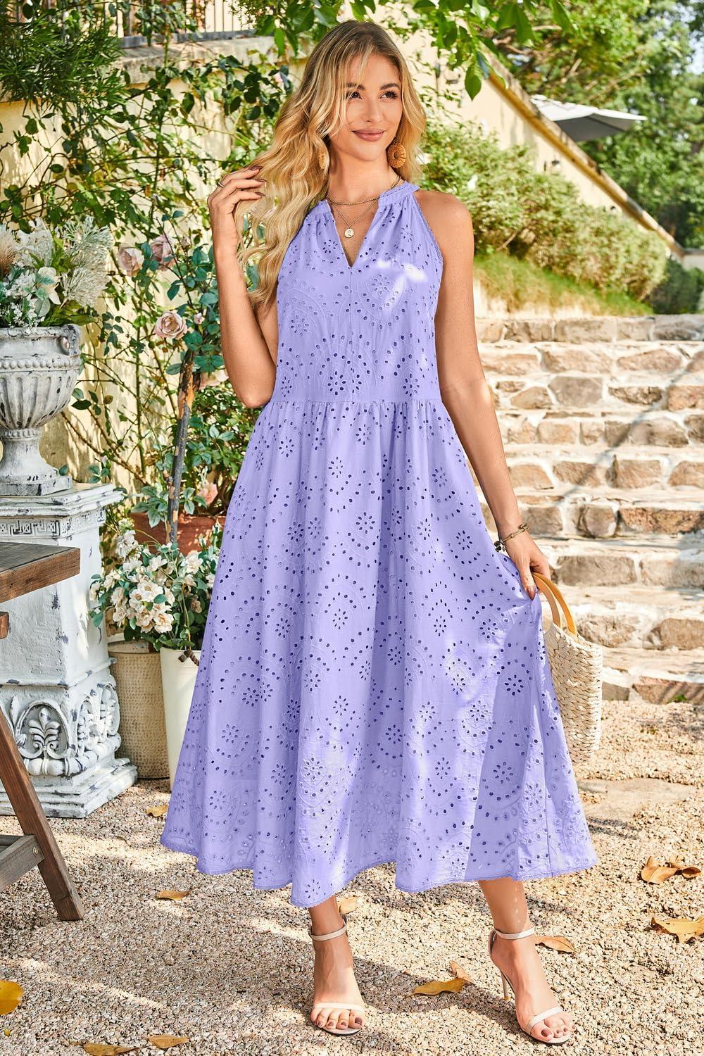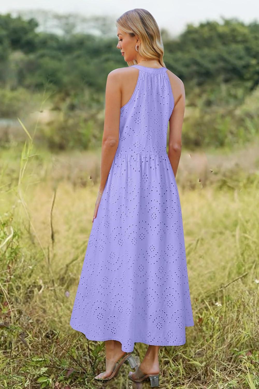 Newshows Women’s 2025 Summer Maxi Dresses Halter V Neck Eyelet Hollow Out Long Flowy Beach Vacation Boho Dress with Pockets(Light Purple)