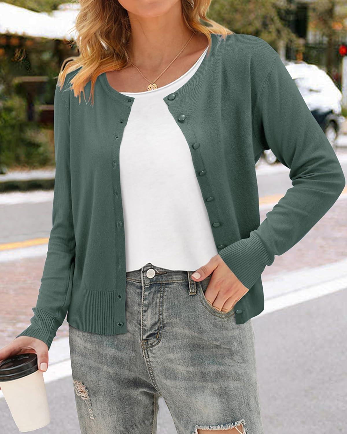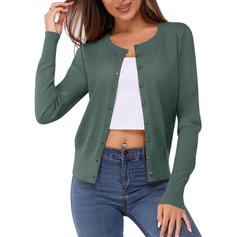 Newshows Women’s Lightweight Button Down Cardigan Long Sleeve Casual Crew Neck Soft Knit Cardigans Sweater Tops(Grey Green)
