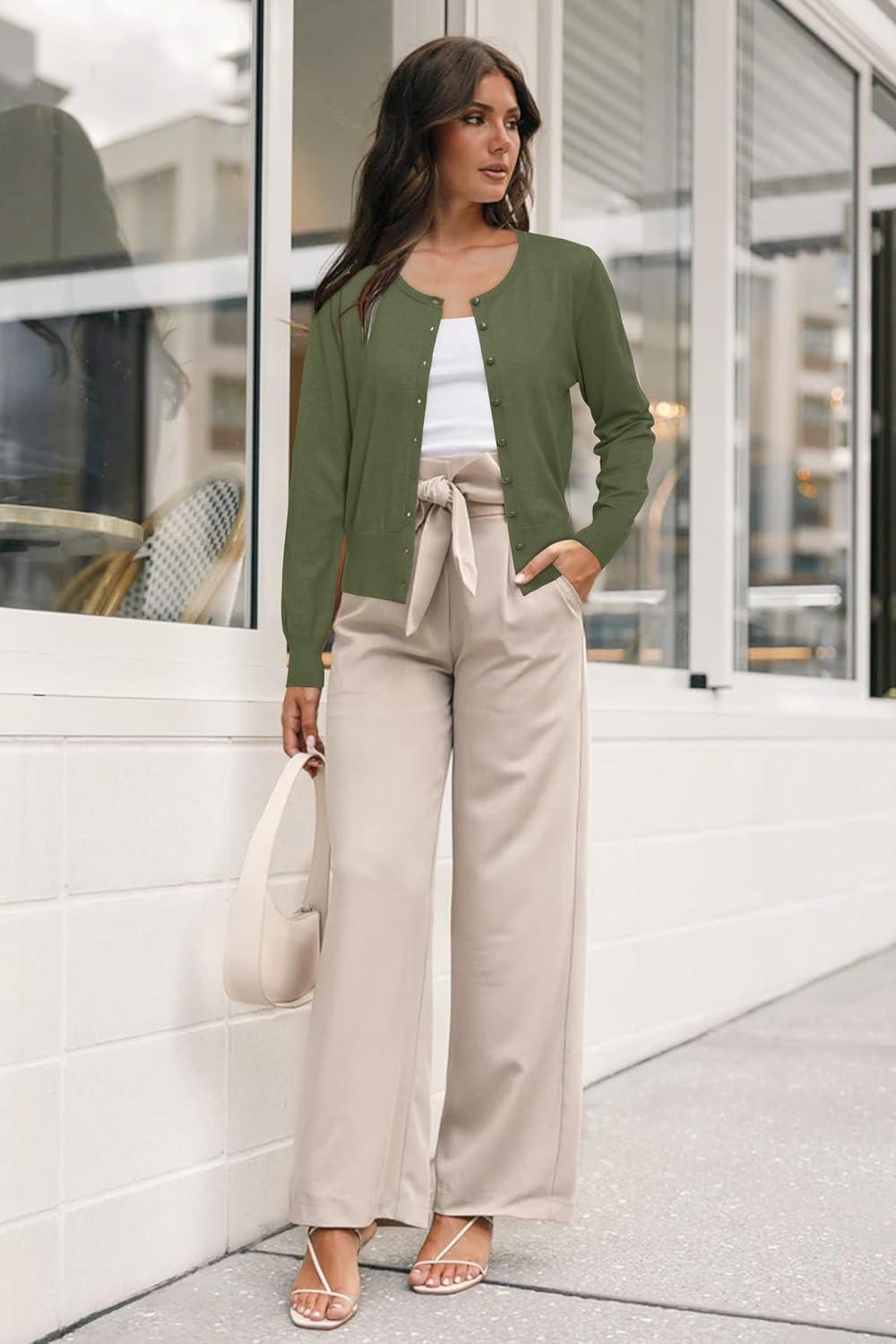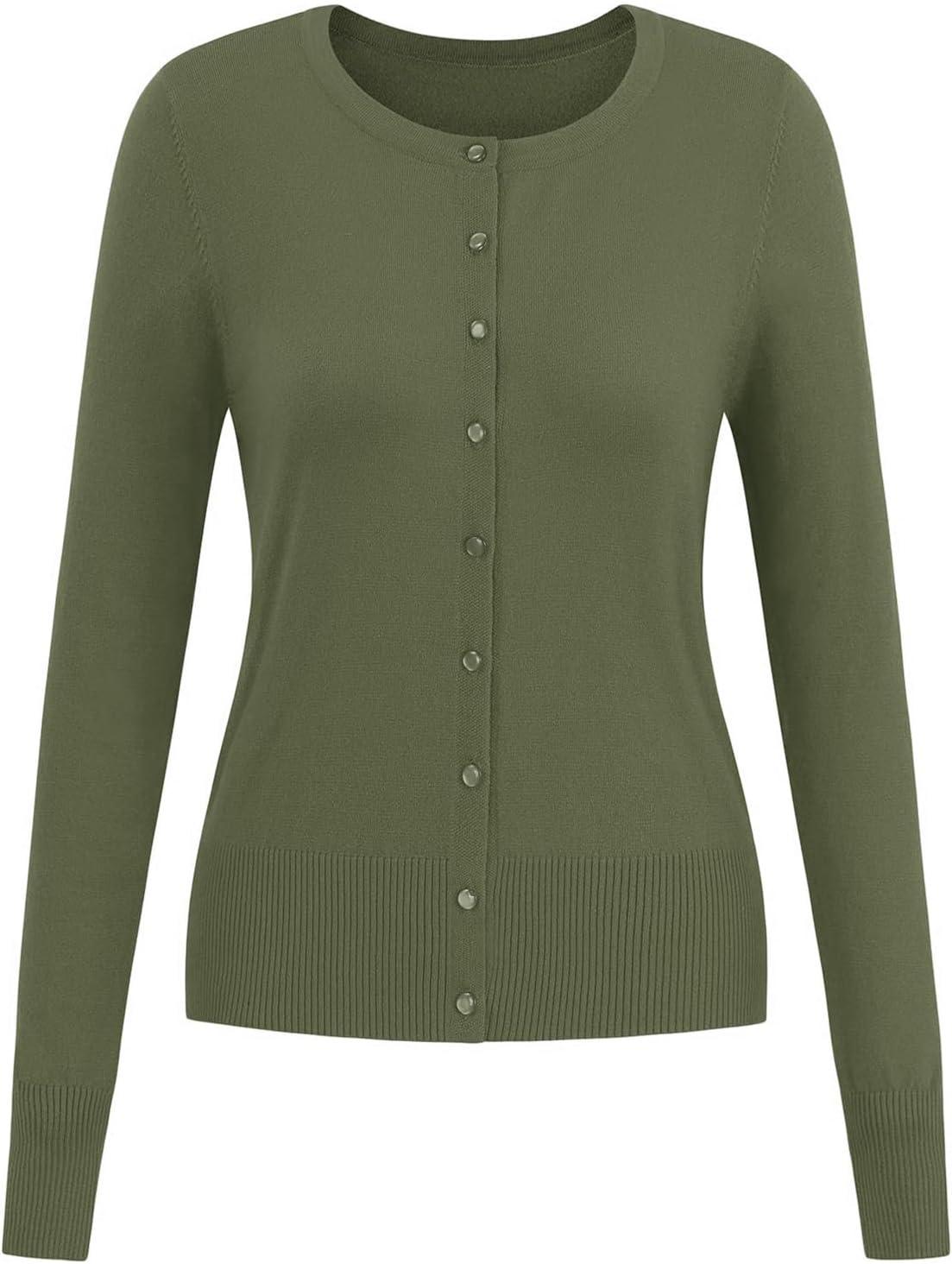 Newshows Women’s Lightweight Button Down Cardigan Long Sleeve Casual Crew Neck Soft Knit Cardigans Sweater Tops(Olive)