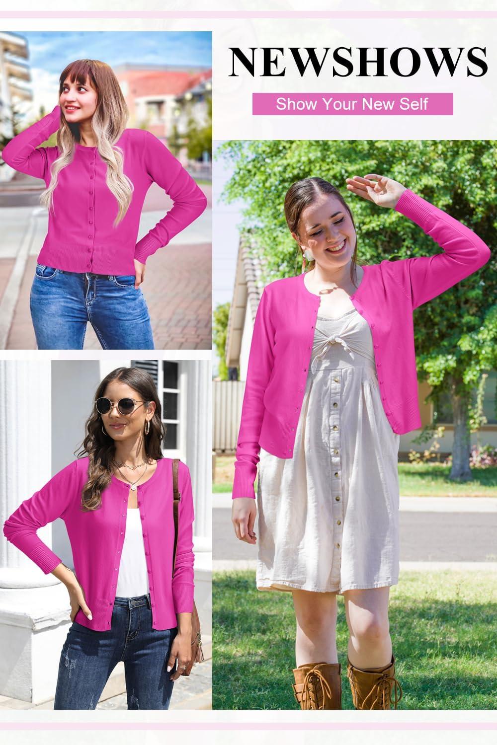 Newshows Women’s Lightweight Button Down Cardigan Long Sleeve Casual Crew Neck Soft Knit Cardigans Sweater Tops(Rose Red)