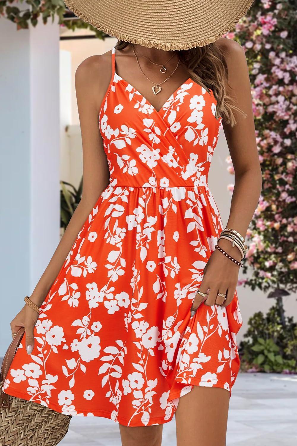 Newshows Women’s Summer Dress 2025 Spaghetti Strap Sleeveless V Neck Casual Swing Sundress with Pockets(Orange Floral White)