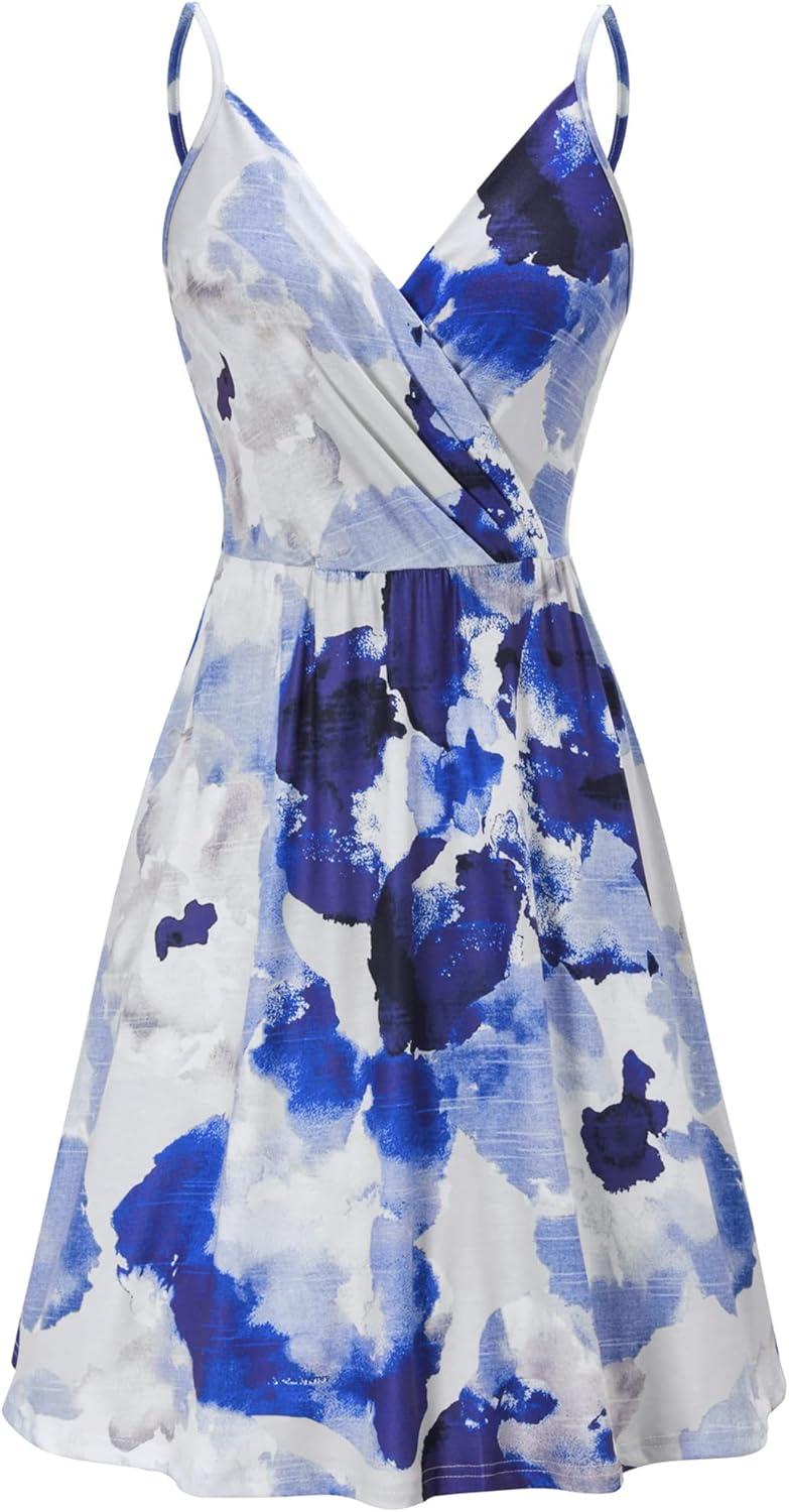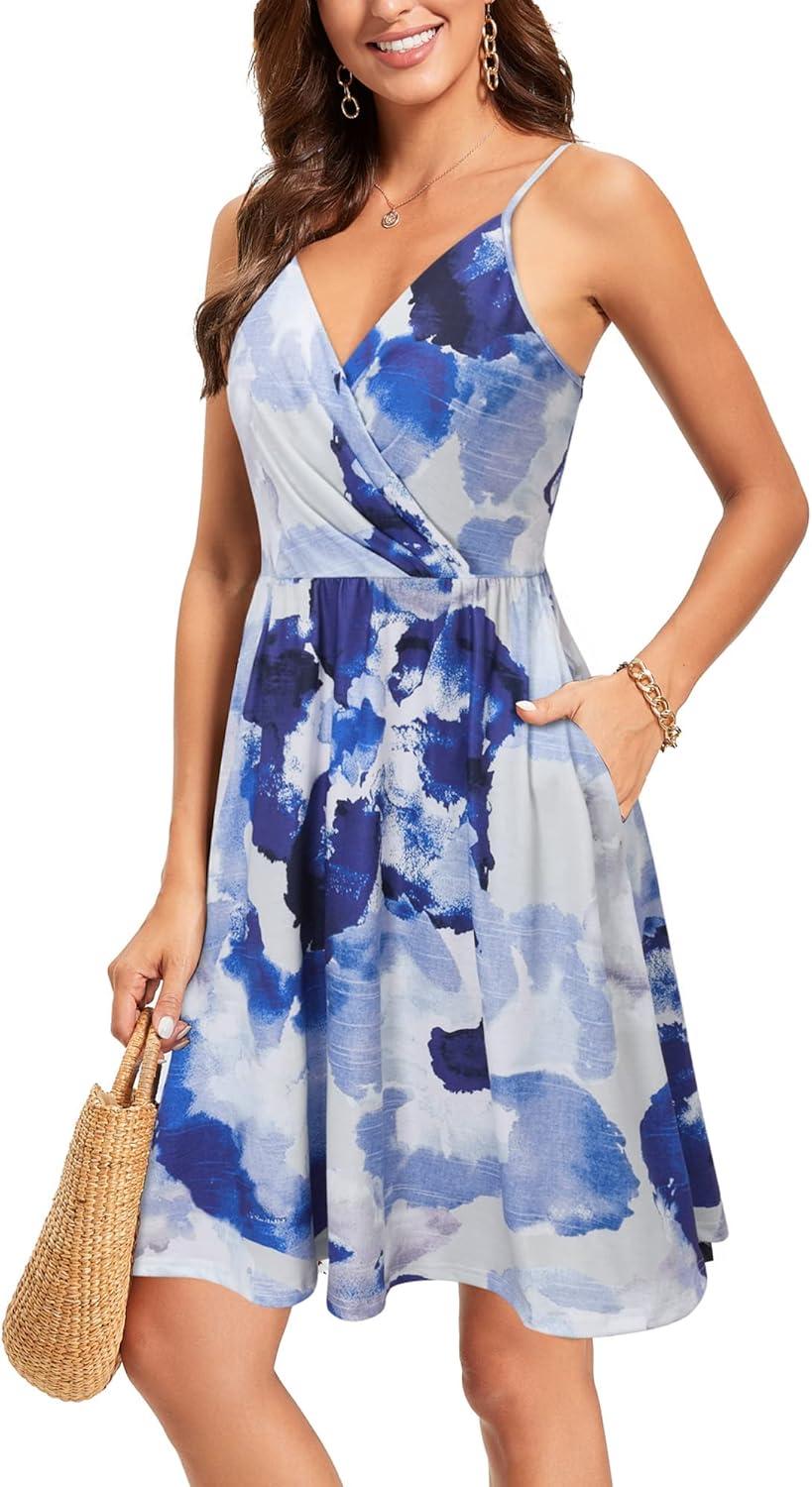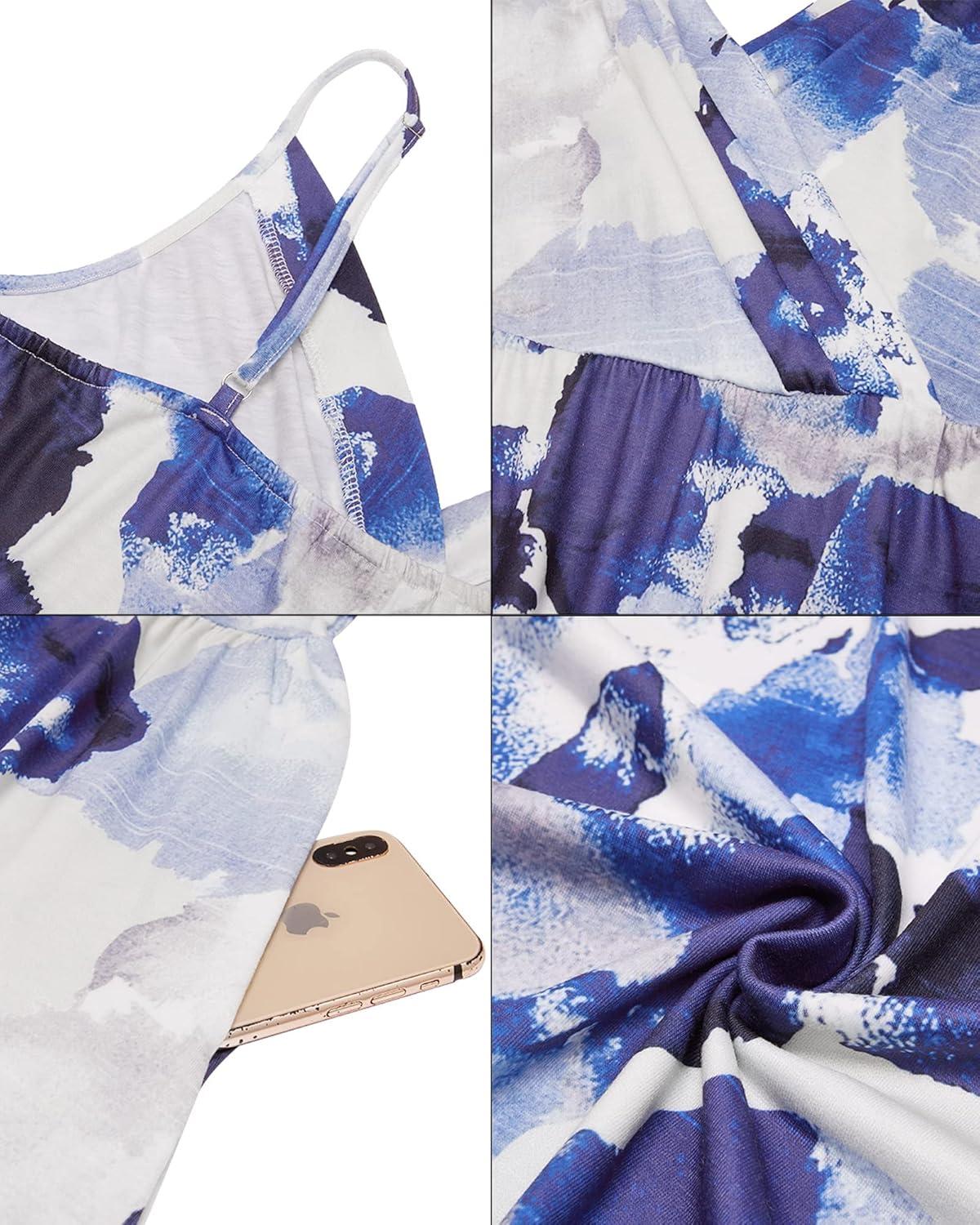 Newshows Women’s Summer Dress 2025 Spaghetti Strap Sleeveless V Neck Casual Swing Sundress with Pockets(White Floral Dark Blue)