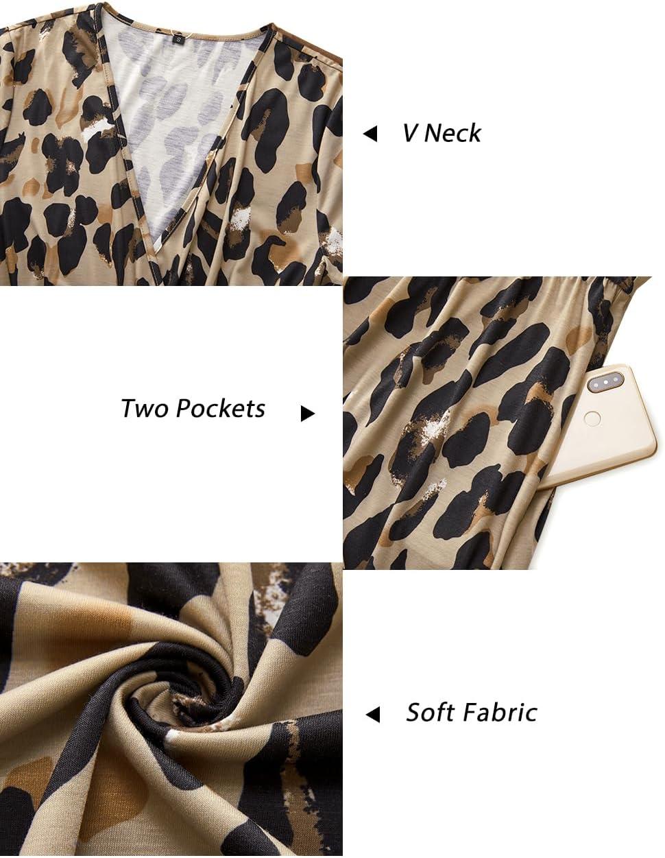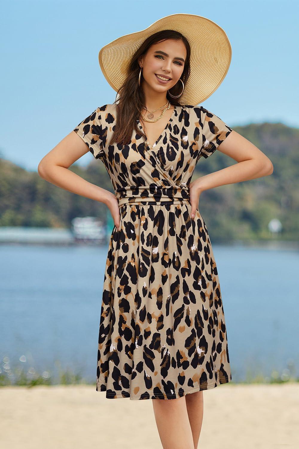 Newshows Womens Summer Short Sleeve Casual Dresses V Neck Floral Vacation Sundress Faux Wrap Midi Dress with Pockets(Apricot Leopard Print)