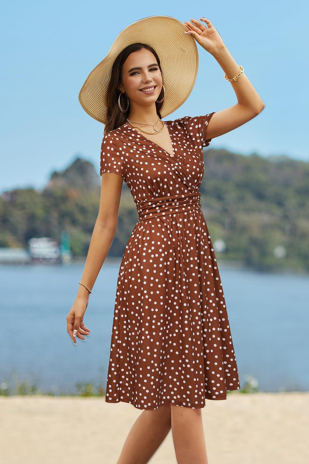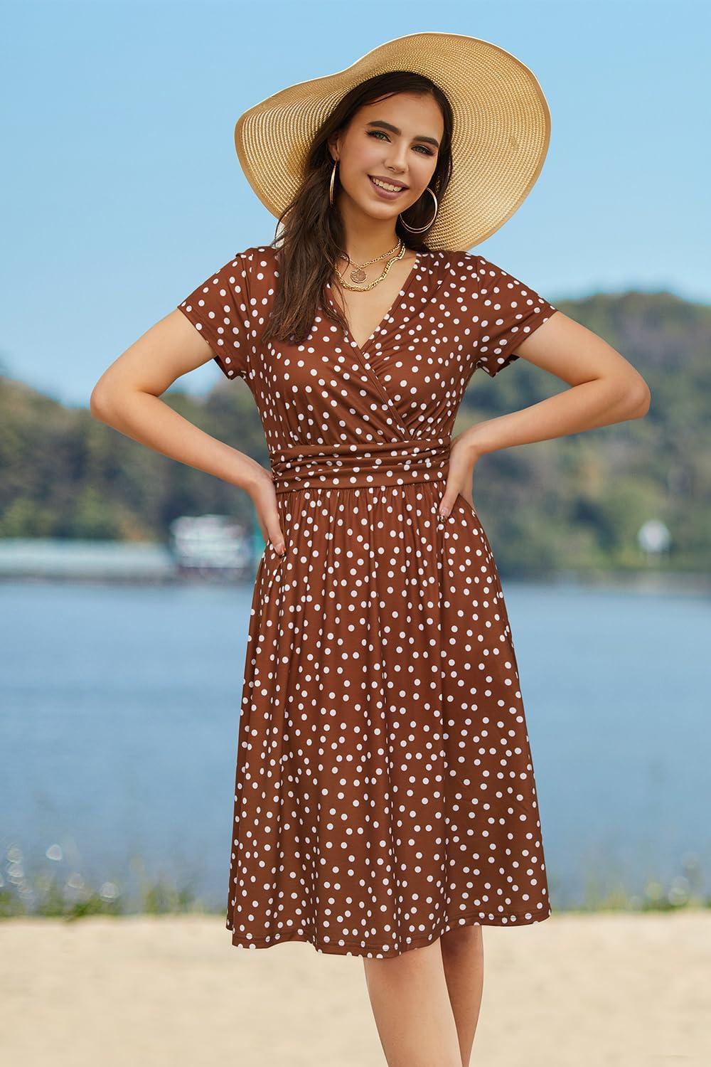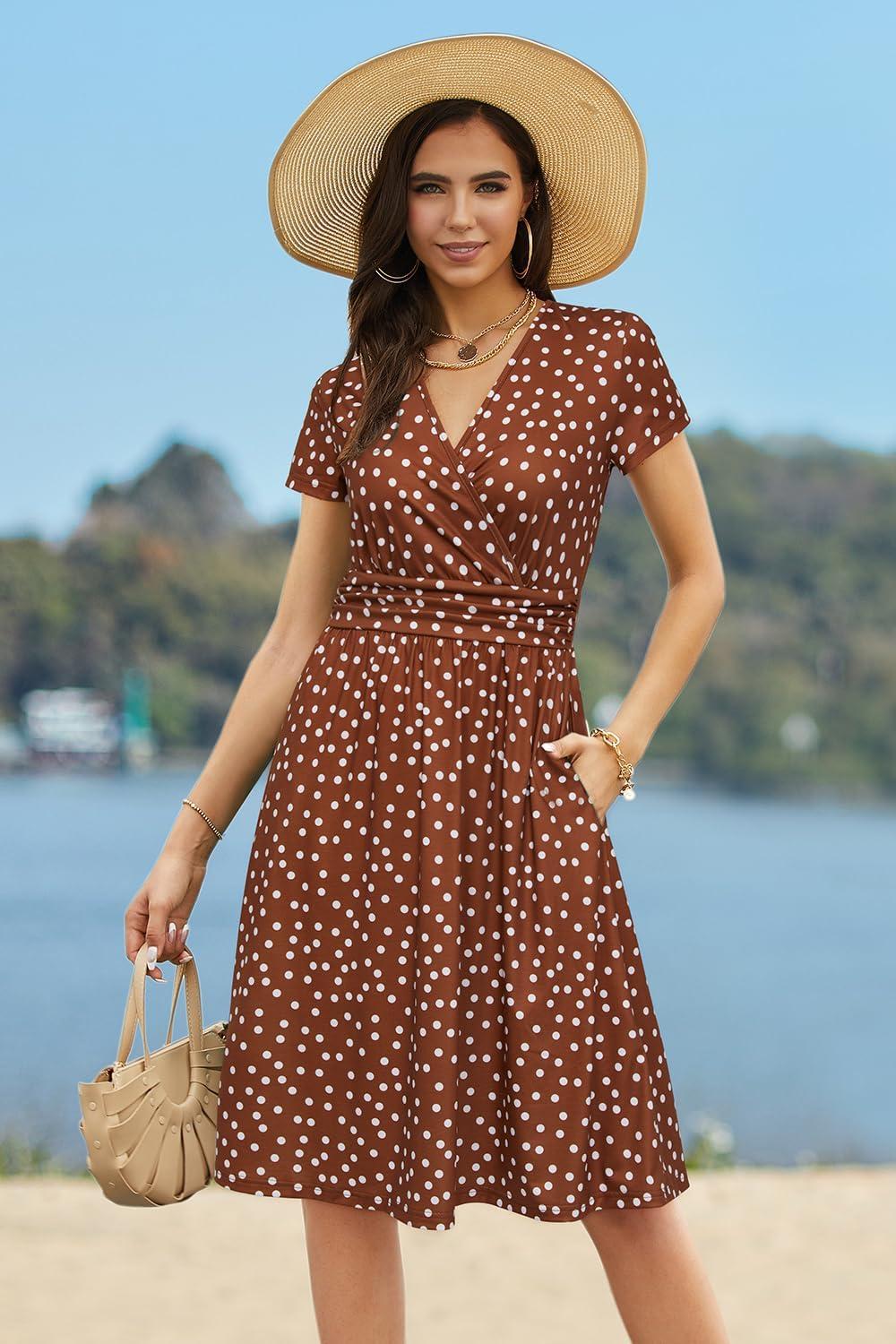 Newshows Womens Summer Short Sleeve Casual Dresses V Neck Floral Vacation Sundress Faux Wrap Midi Dress with Pockets(Brown White Polka Dots)