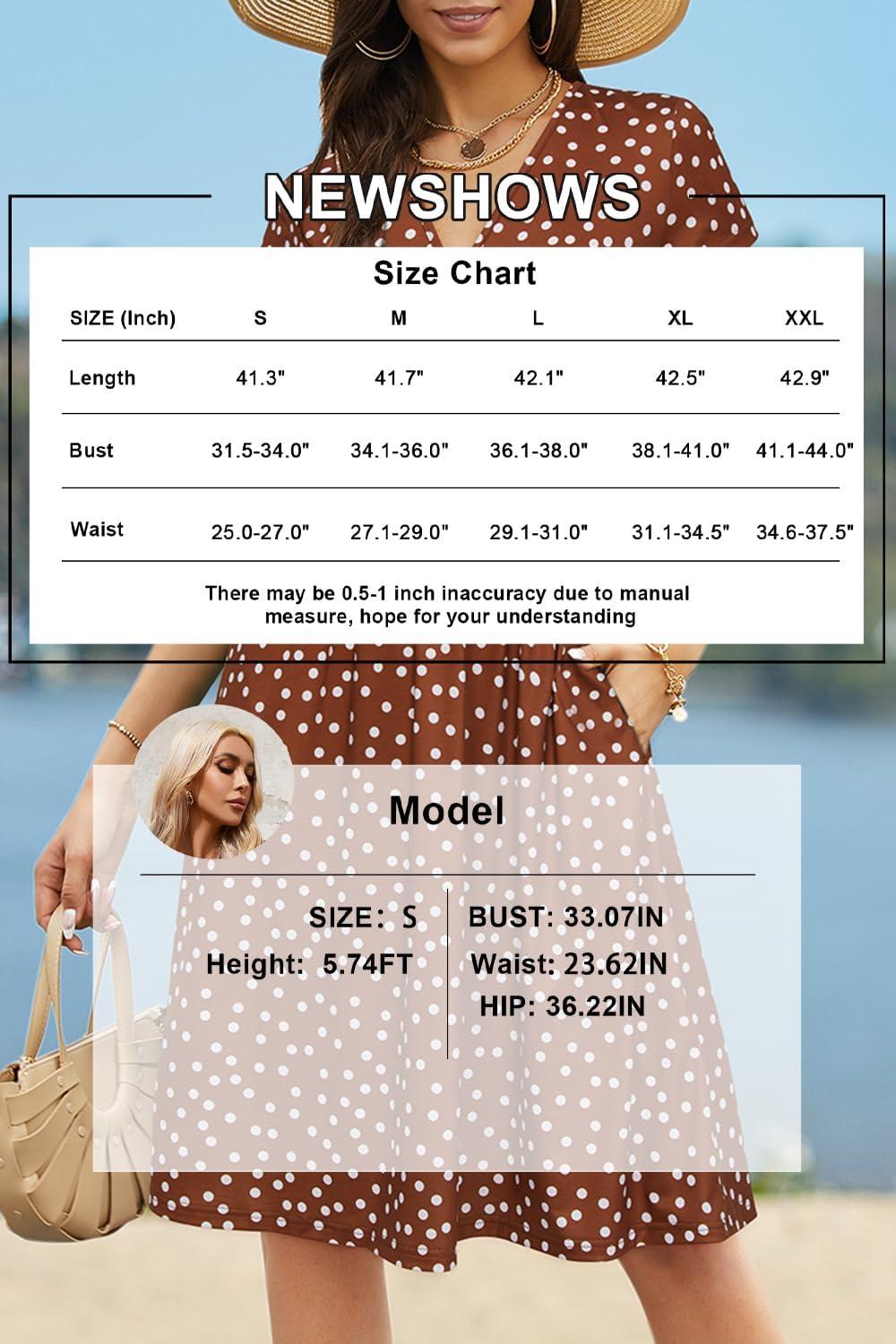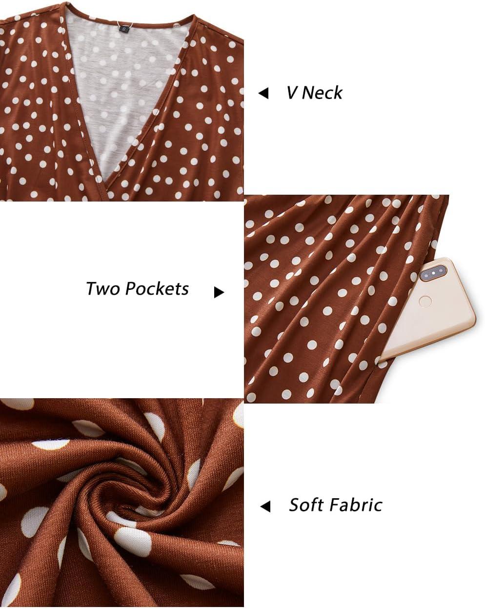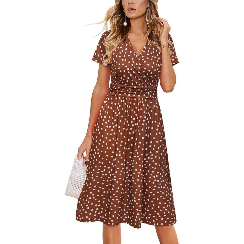 Newshows Womens Summer Short Sleeve Casual Dresses V Neck Floral Vacation Sundress Faux Wrap Midi Dress with Pockets(Brown White Polka Dots)
