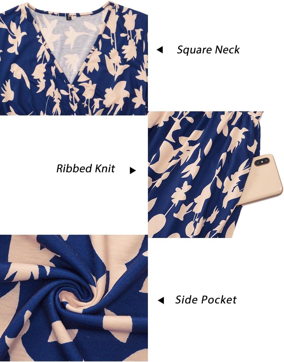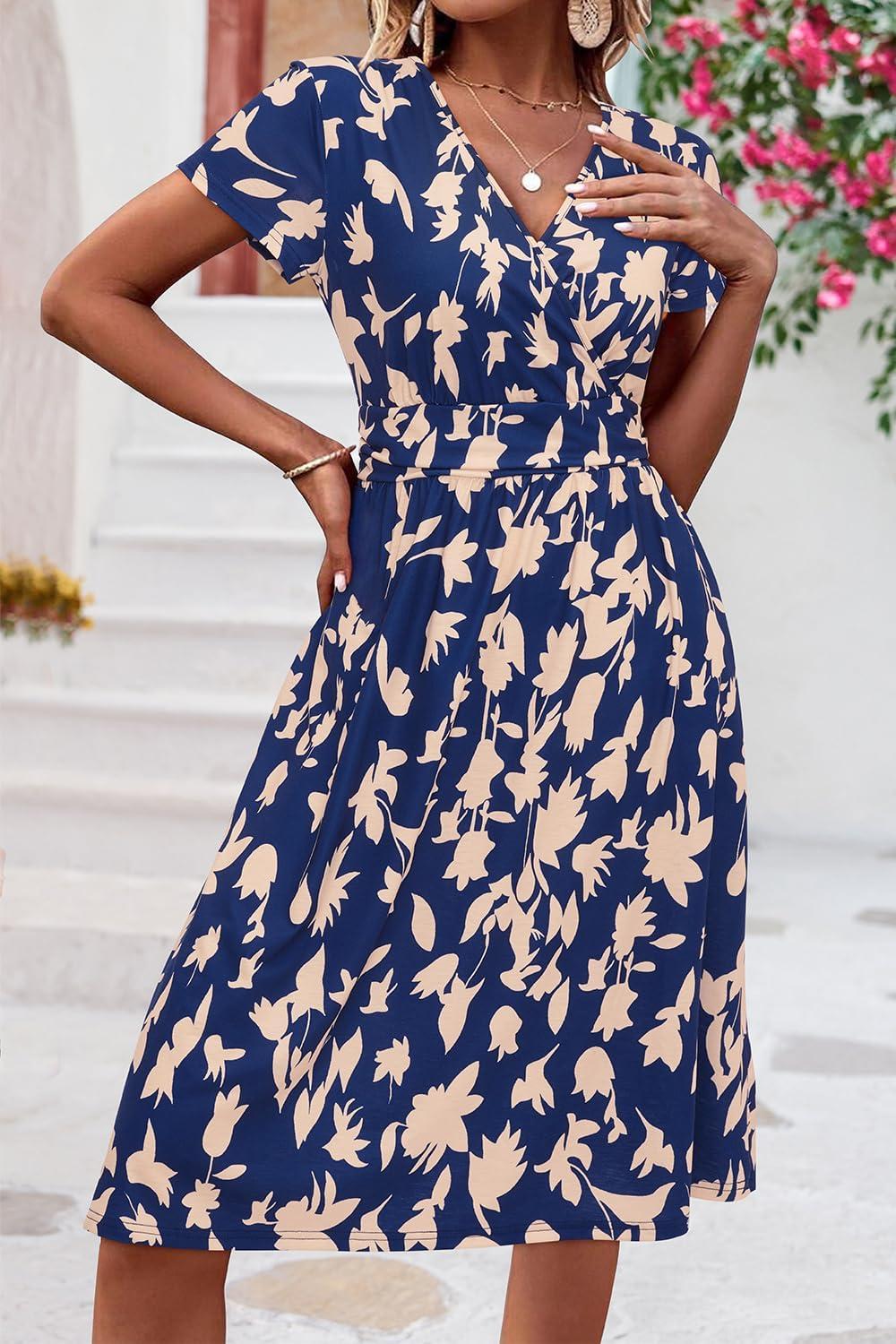 Newshows Womens Summer Short Sleeve Casual Dresses V Neck Floral Vacation Sundress Faux Wrap Midi Dress with Pockets(Navy Apricot Floral)