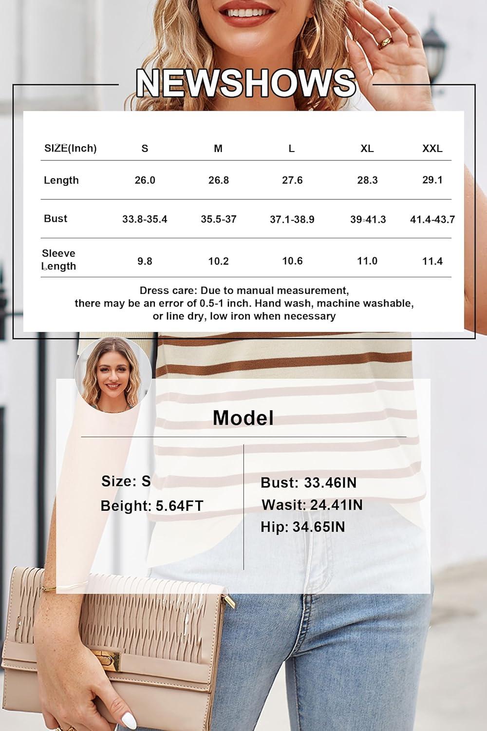 Newshows Womens Summer Short Sleeve Sweater Tops Fall Business Casual Outfits Crewneck Lightweight Dressy Knit Shirts(Apricot/Brown Stripe)