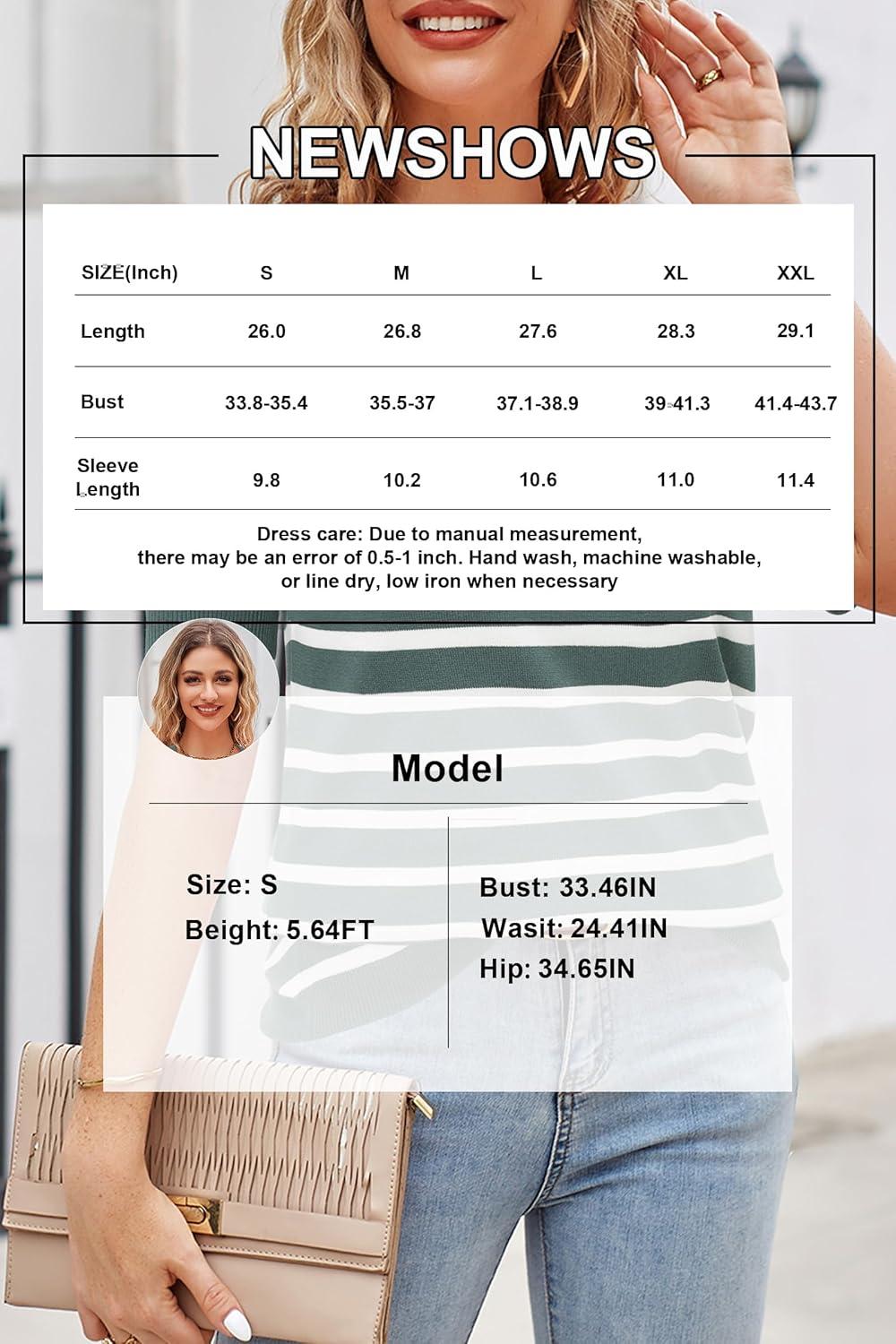 Newshows Womens Summer Short Sleeve Sweater Tops Fall Business Casual Outfits Crewneck Lightweight Dressy Knit Shirts(Grey Green/White Stripe)