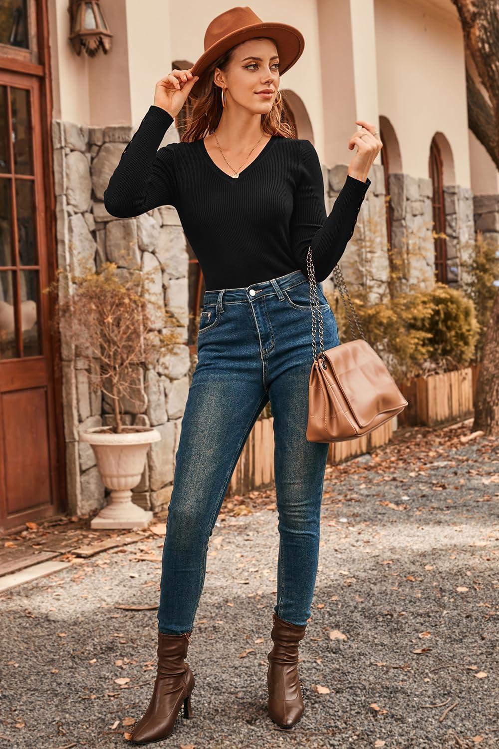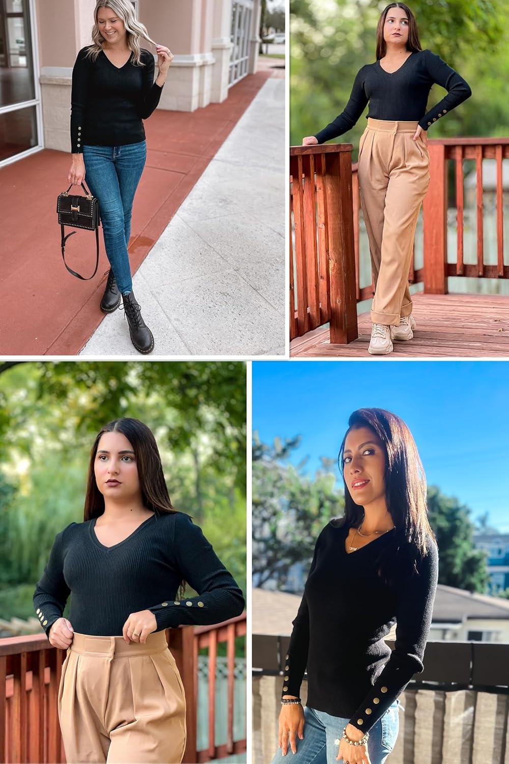 Newshows Womens Sweaters Fall V Neck Pullover Long Sleeve Stretch Button Casual Ribbed Knit Tops(Black)