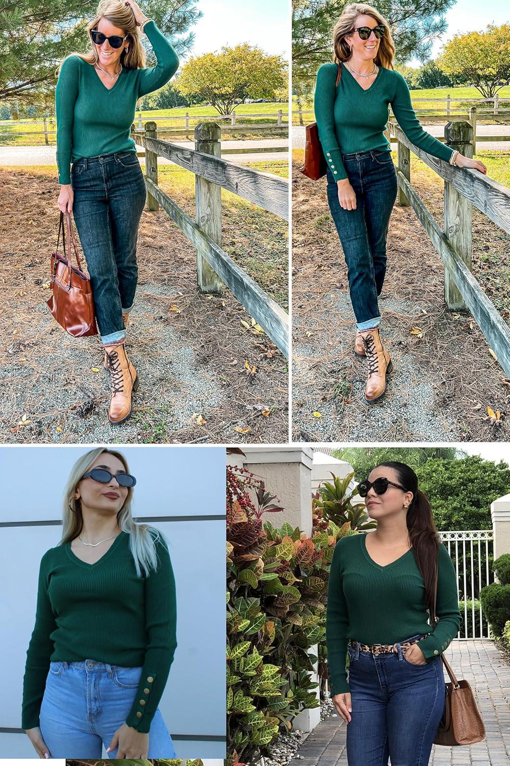 Newshows Womens Sweaters Fall V Neck Pullover Long Sleeve Stretch Button Casual Ribbed Knit Tops(Green)