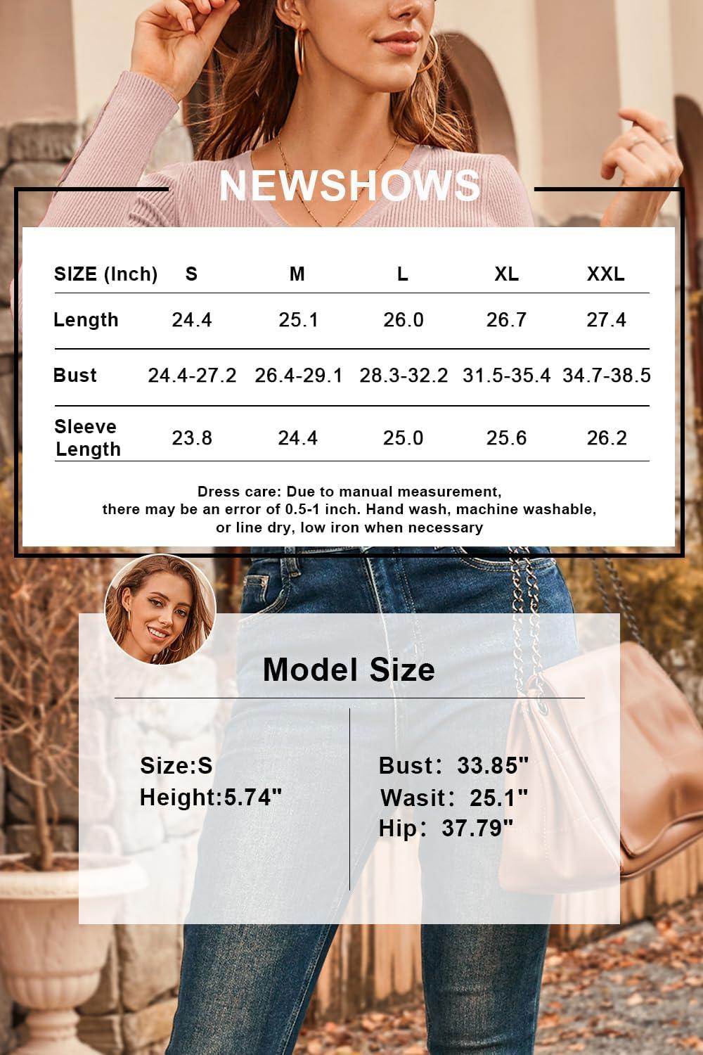 Newshows Womens Sweaters Fall V Neck Pullover Long Sleeve Stretch Button Casual Ribbed Knit Tops(Light Pink)