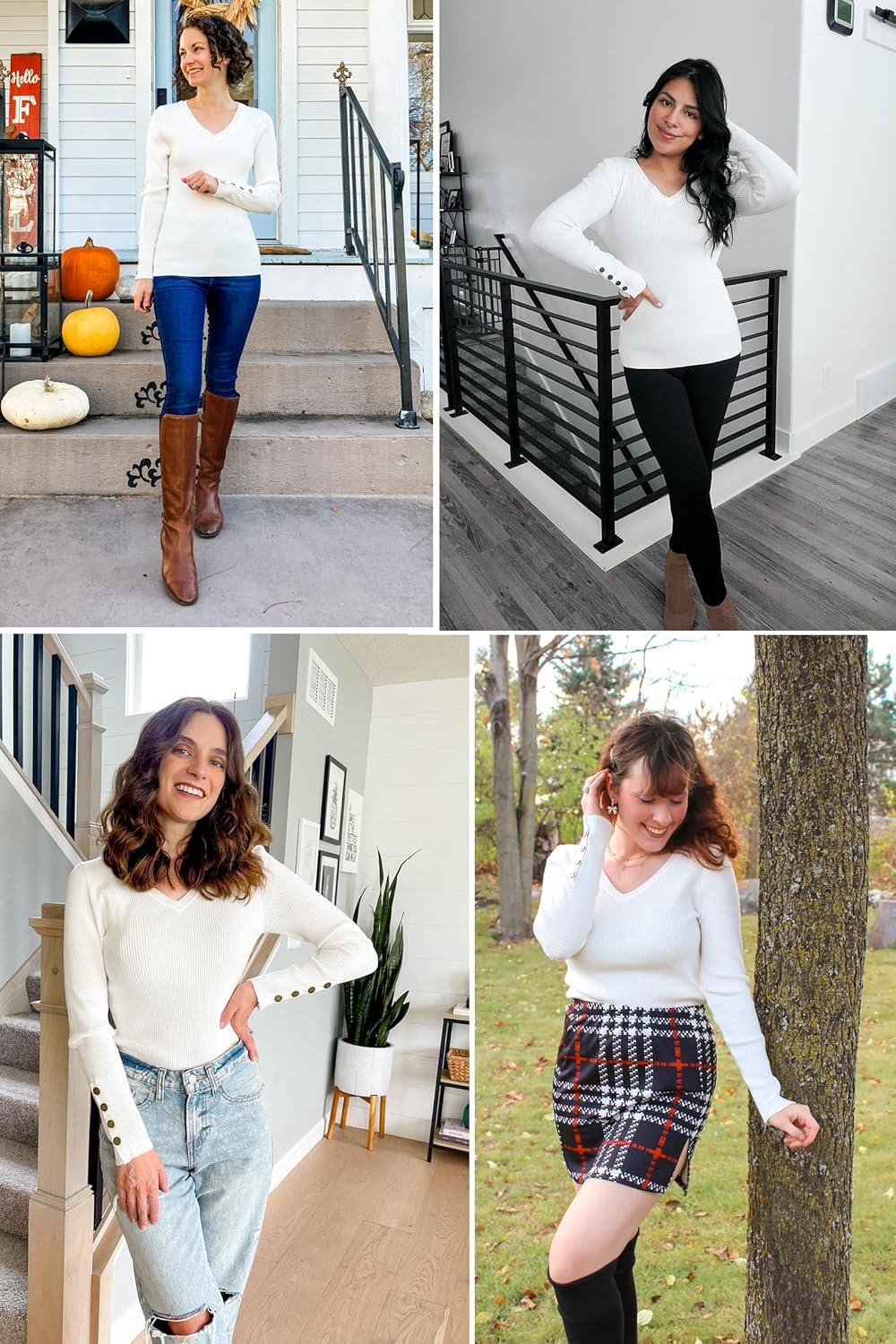 Newshows Womens Sweaters Fall V Neck Pullover Long Sleeve Stretch Button Casual Ribbed Knit Tops(Off-white)